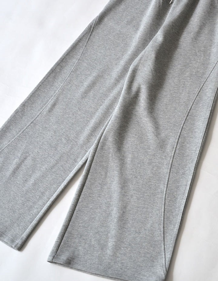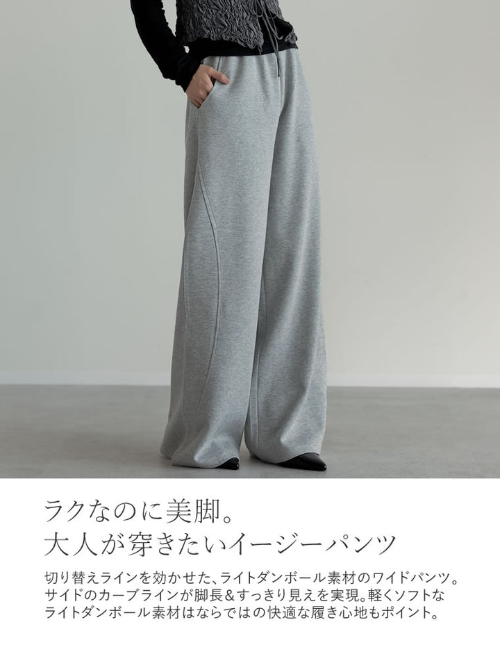 切り替えラインを効かせた、ライトダンボール素材のカーブラインワイドパンツ。
