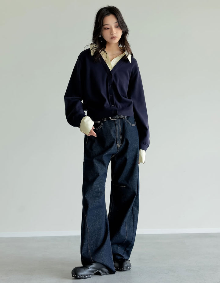 トレンド感のあるドッキングデザインのニットカーディガン。