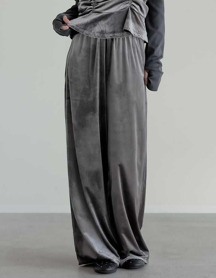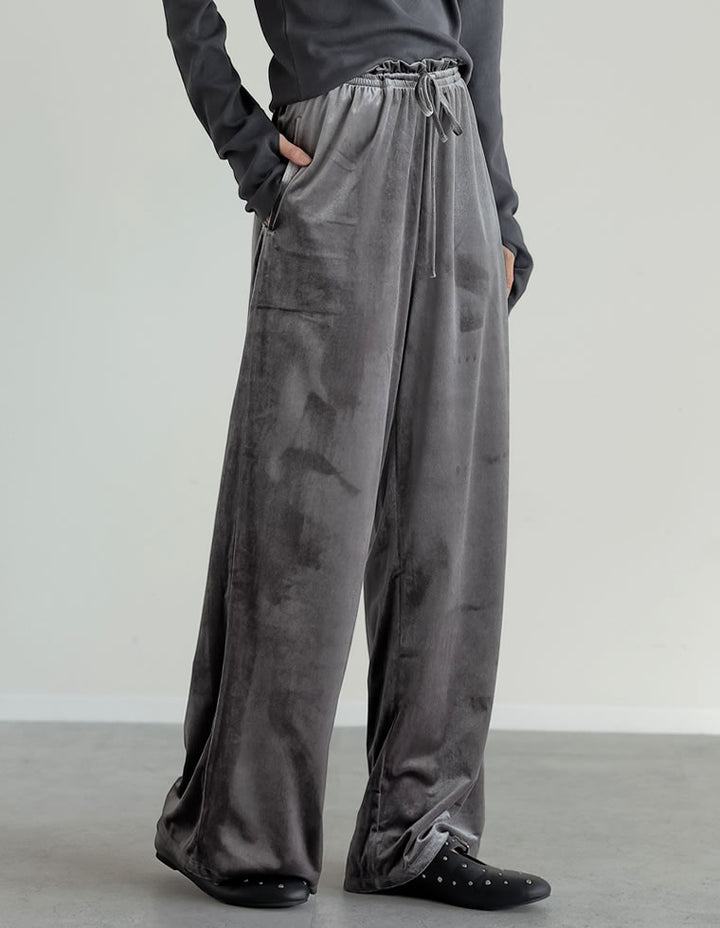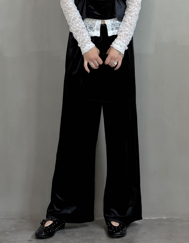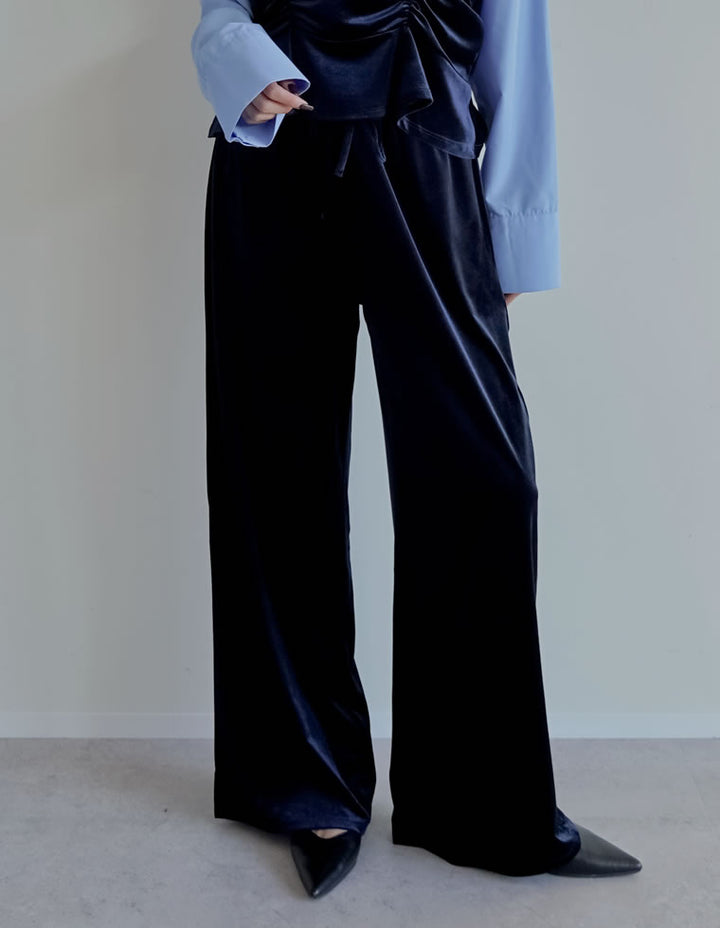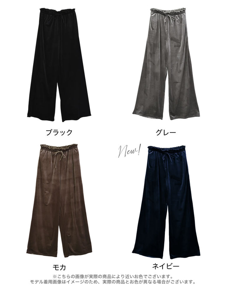 柔らかな光沢感が魅力のカットベロア素材を使用した、リラクシームード漂うワイドパンツ。
