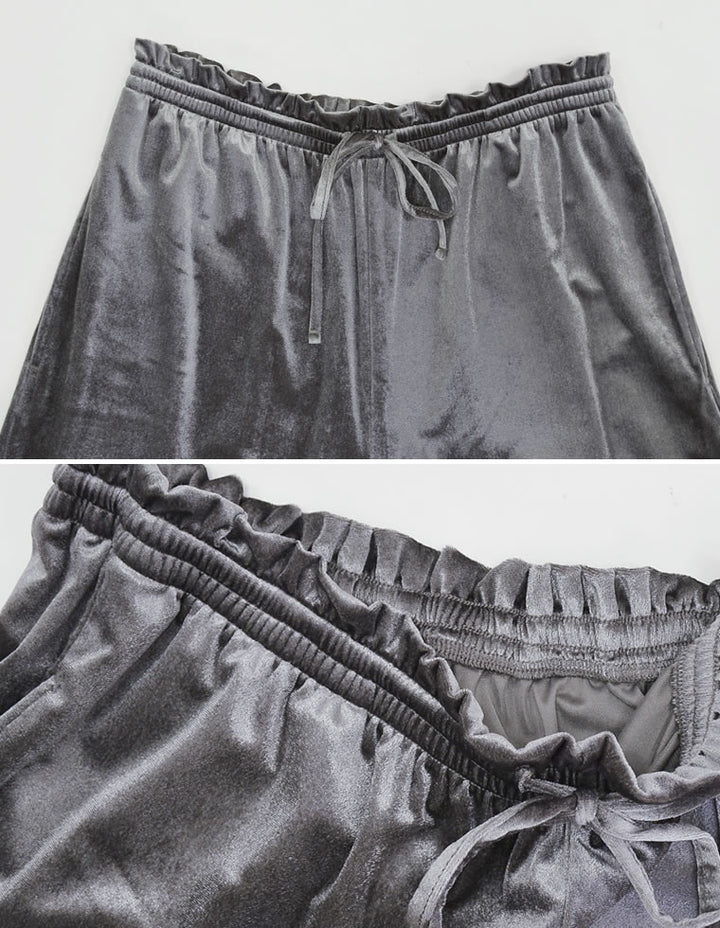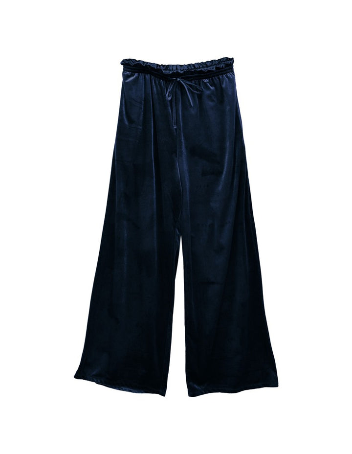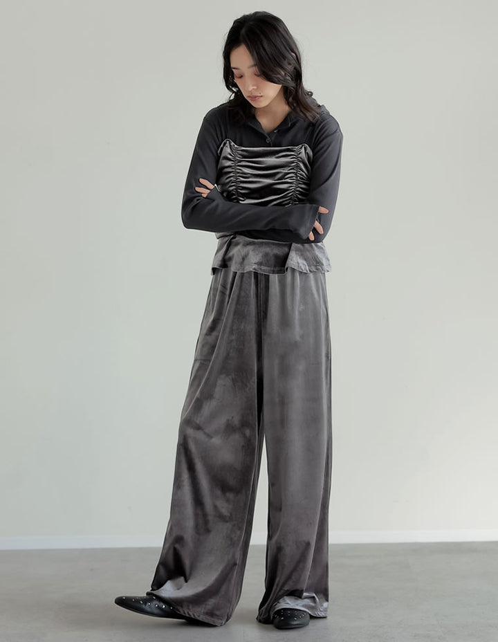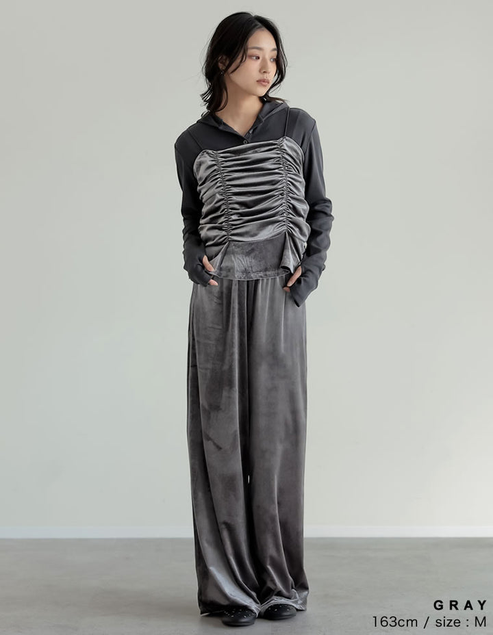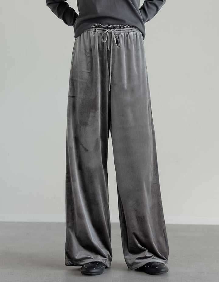 柔らかな光沢感が魅力のカットベロア素材を使用した、リラクシームード漂うワイドパンツ。