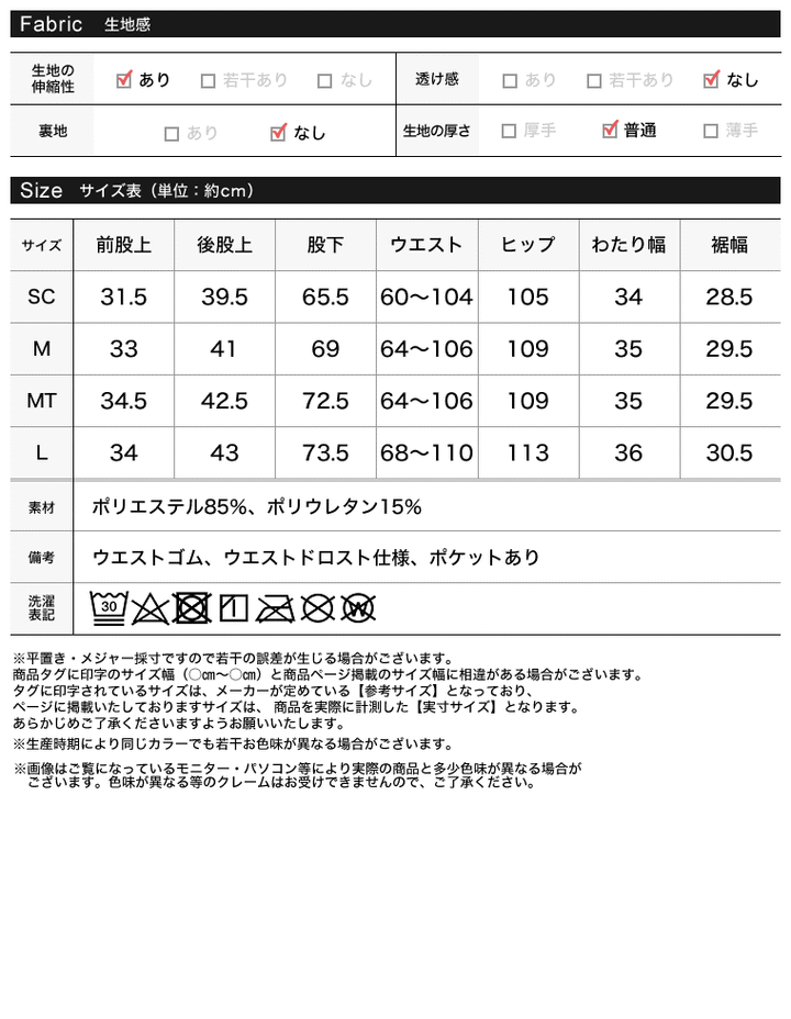 サイズ | 前股上 | 後股上 | 股下 | ウエスト | ヒップ | わたり幅 | 裾幅 |