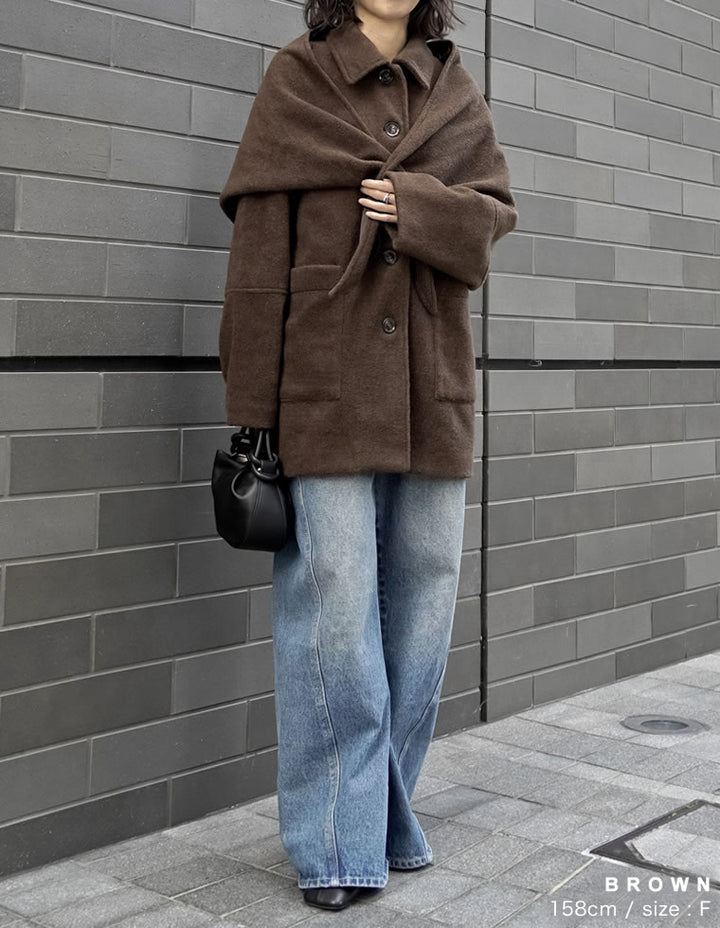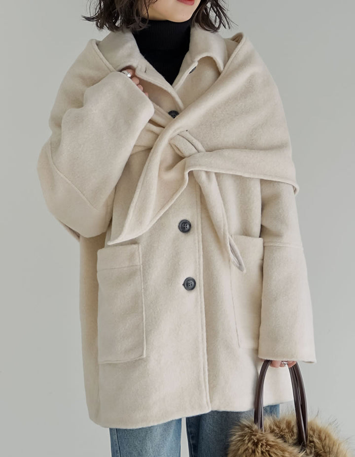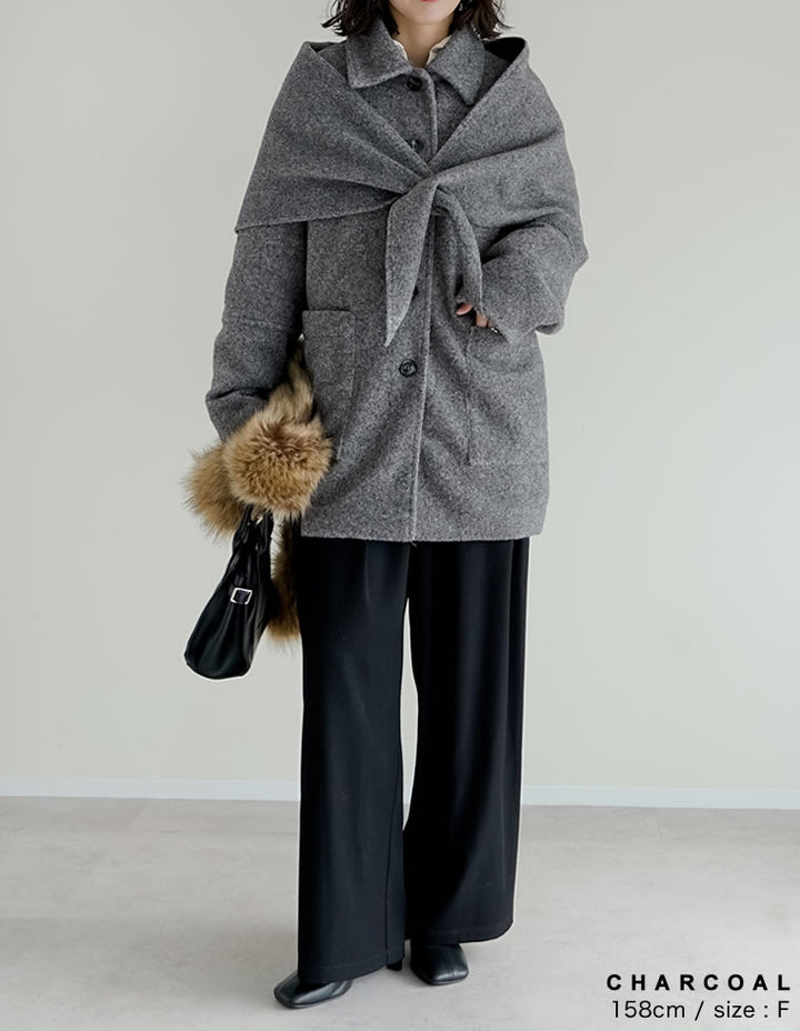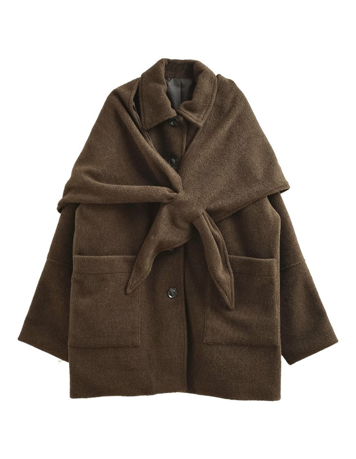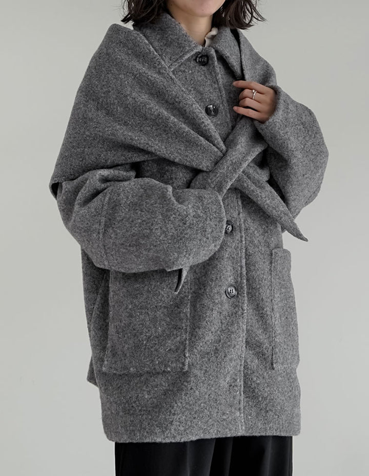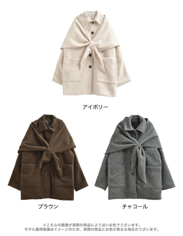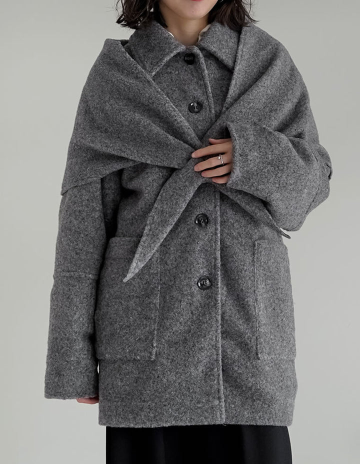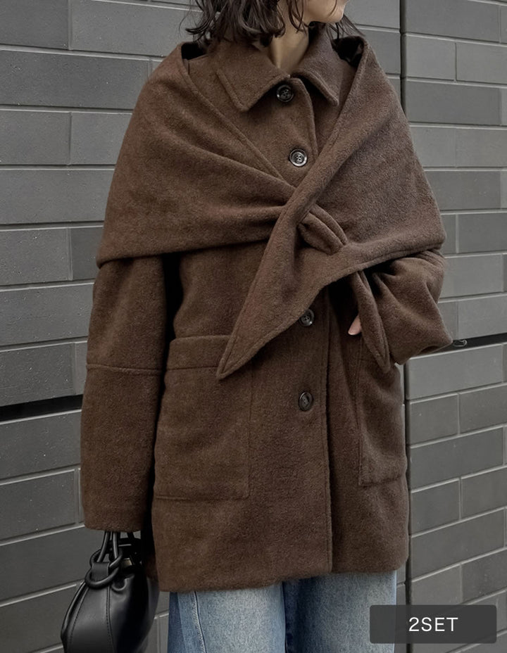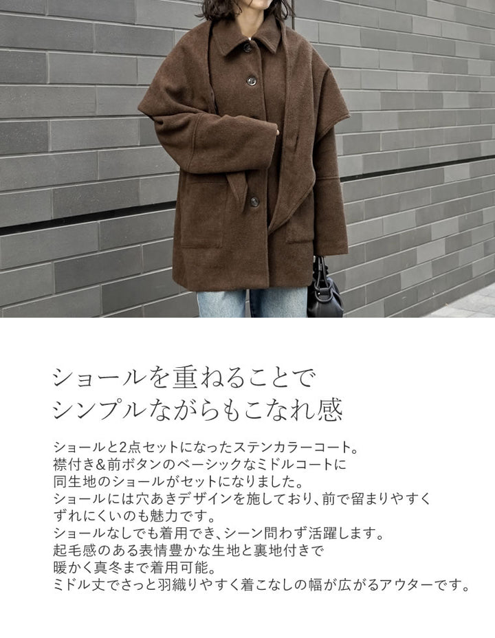 ショールと2点セットになったステンカラーコート。襟付き&前ボタンのベーシックなミドルコートに、同生地のショールがセットになりました。ショールには穴あきデザインを施しており、前で留まりやすく、ずれにくいのも魅力です。ショールなしでも着用でき、シーン問わず活躍します。起毛感のある表情豊かな生地と裏地付きで、暖かく真冬まで着用可能。ミドル丈でさっと羽織りやすく、着こなしの幅が広がるアウターです。