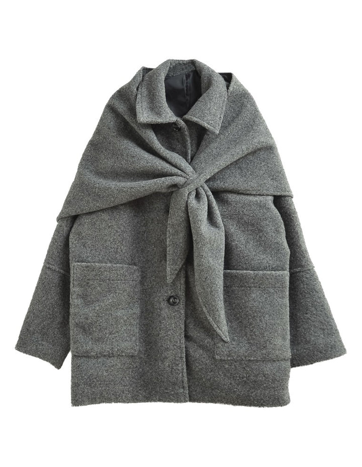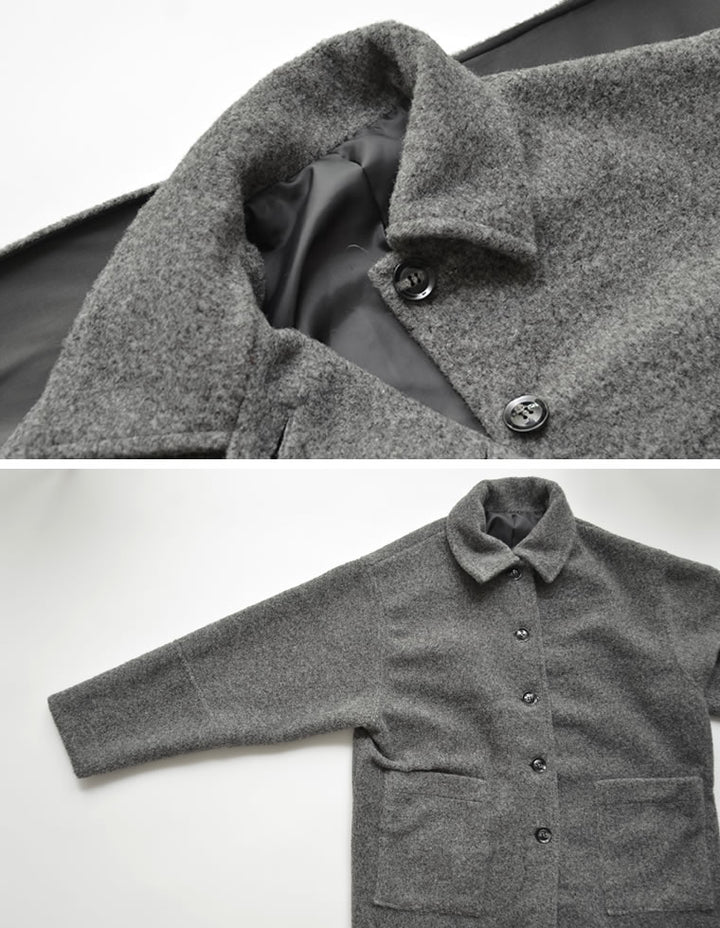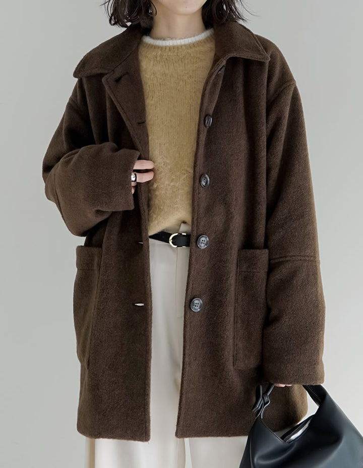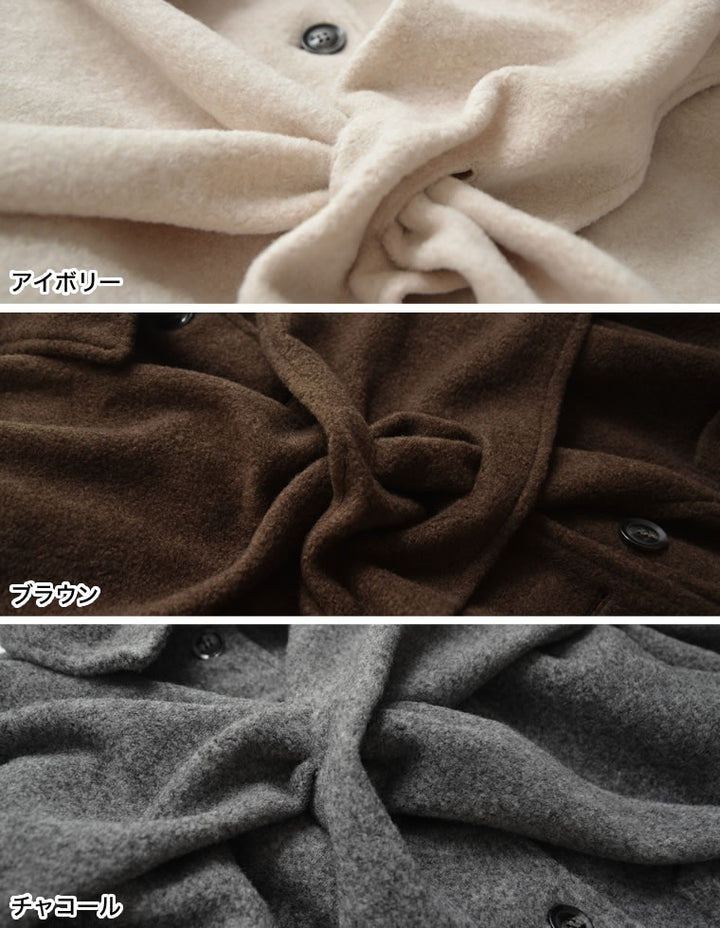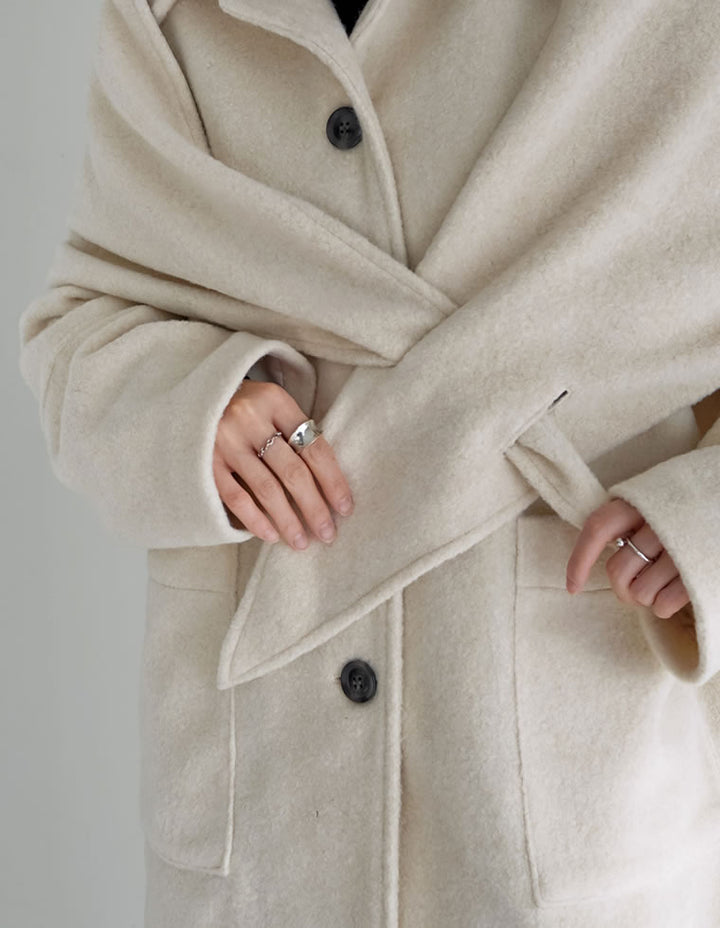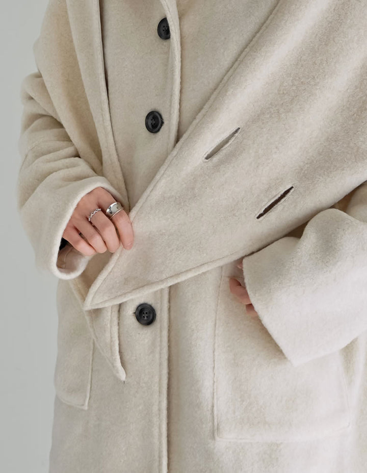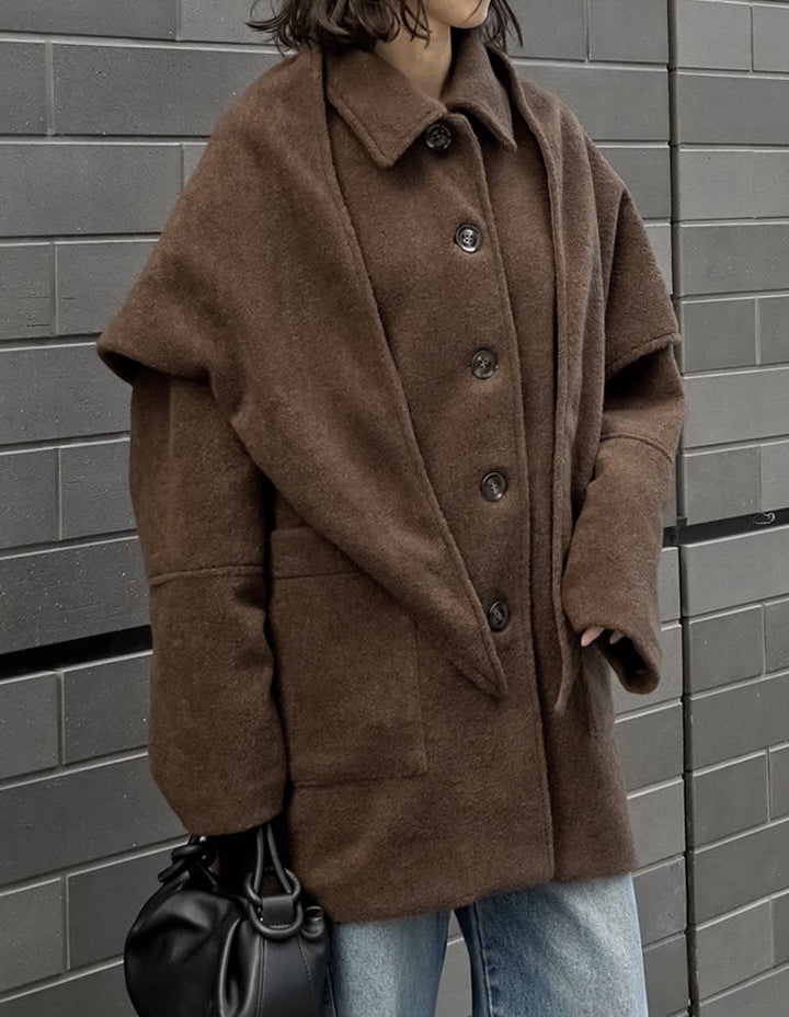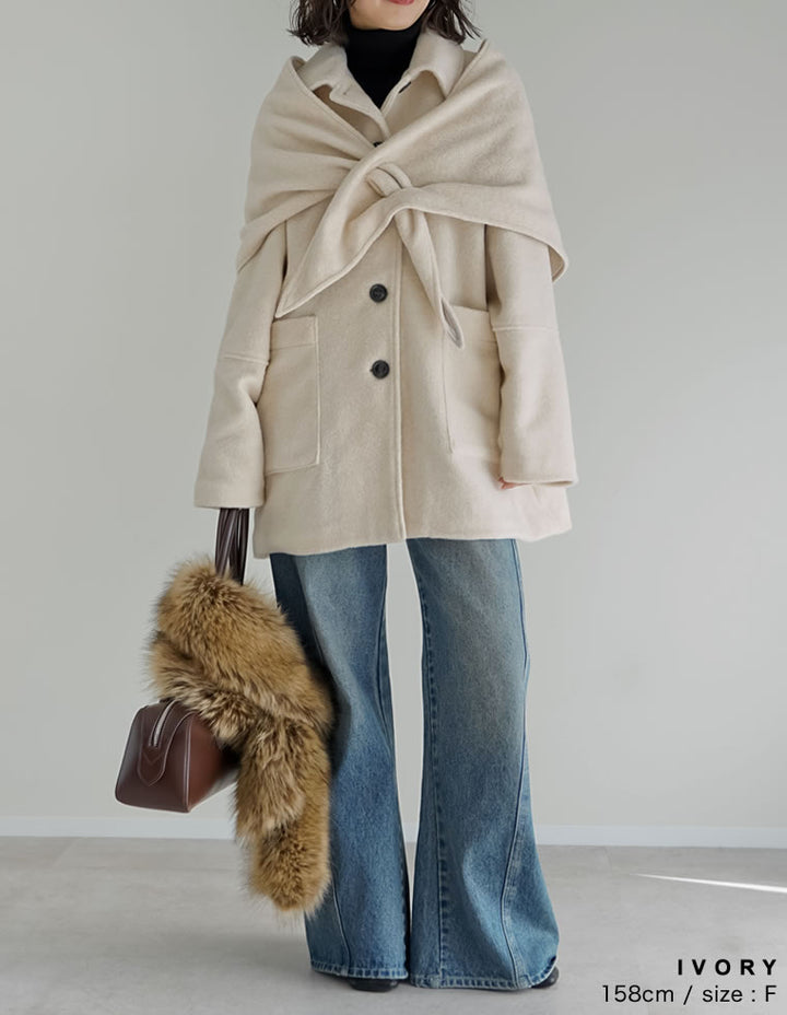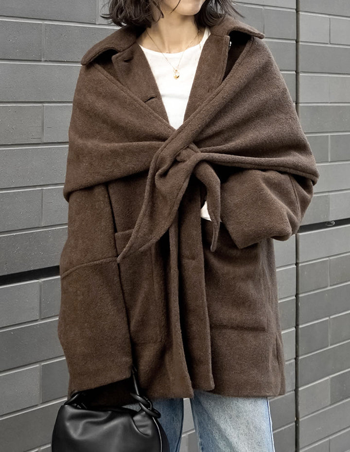ショールと2点セットになったステンカラーコート。襟付き&前ボタンのベーシックなミドルコートに、同生地のショールがセットになりました。ショールには穴あきデザインを施しており、前で留まりやすく、ずれにくいのも魅力です。ショールなしでも着用でき、シーン問わず活躍します。起毛感のある表情豊かな生地と裏地付きで、暖かく真冬まで着用可能。ミドル丈でさっと羽織りやすく、着こなしの幅が広がるアウターです。