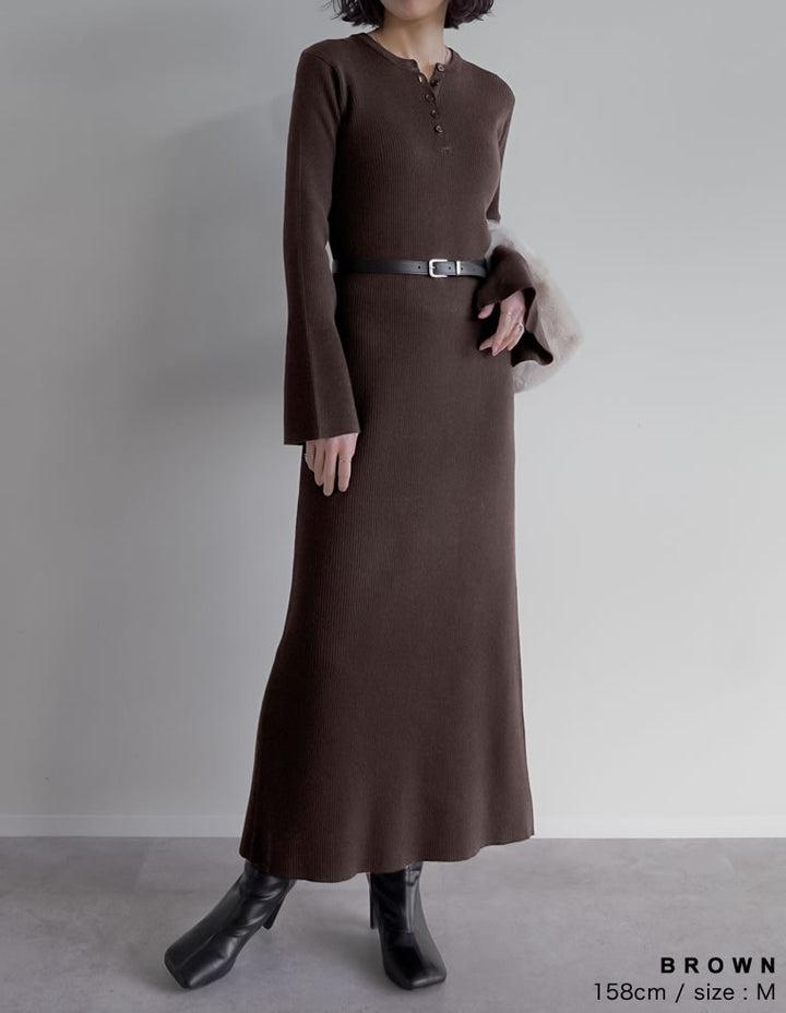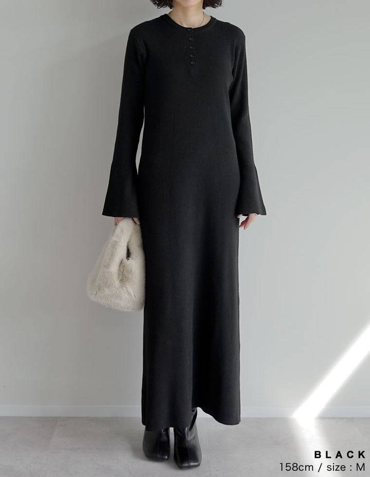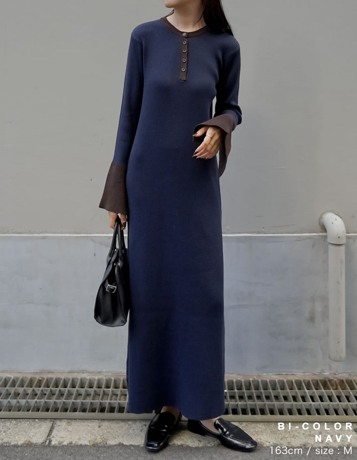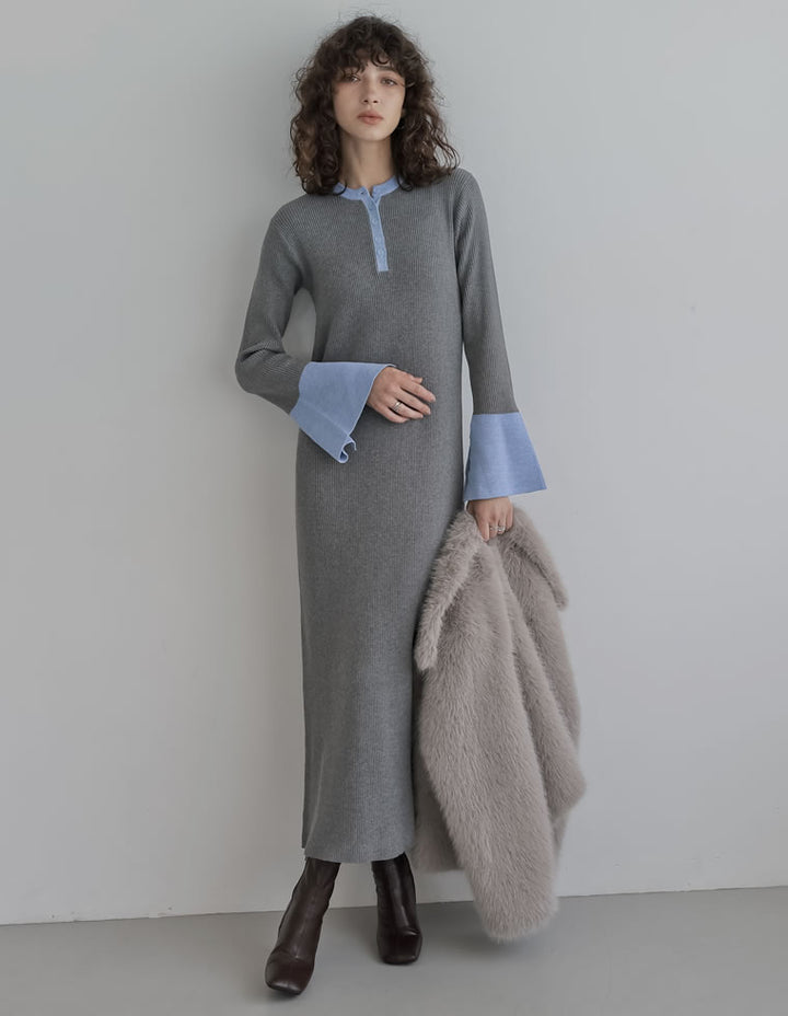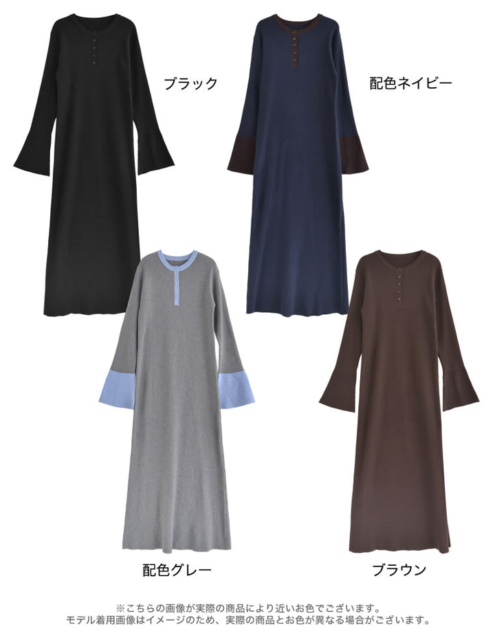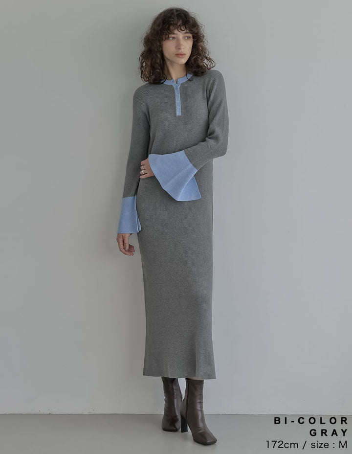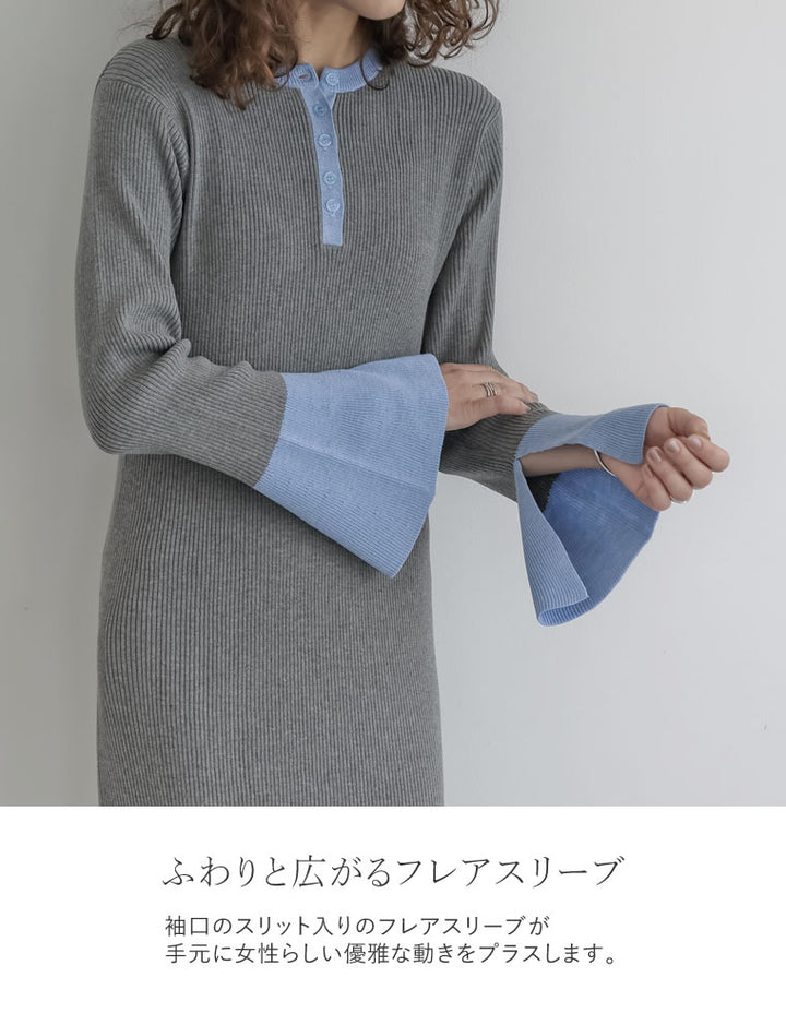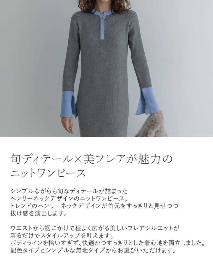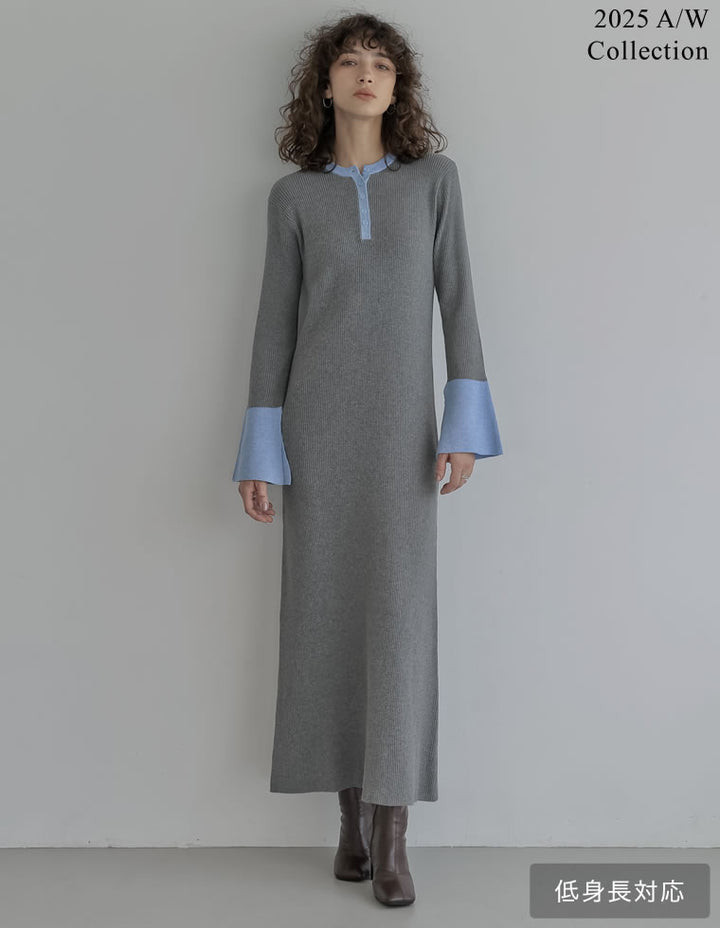 [2025AW COLLECTION][低身長サイズ有]配色or無地ヘンリーネックフレアスリーブリブニットナローワンピース