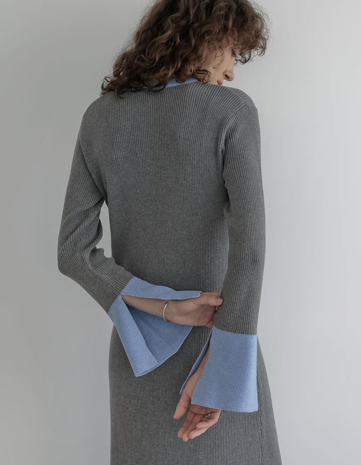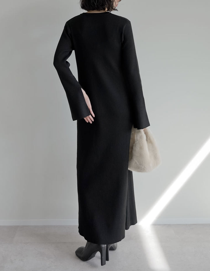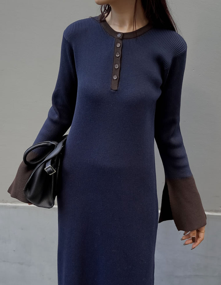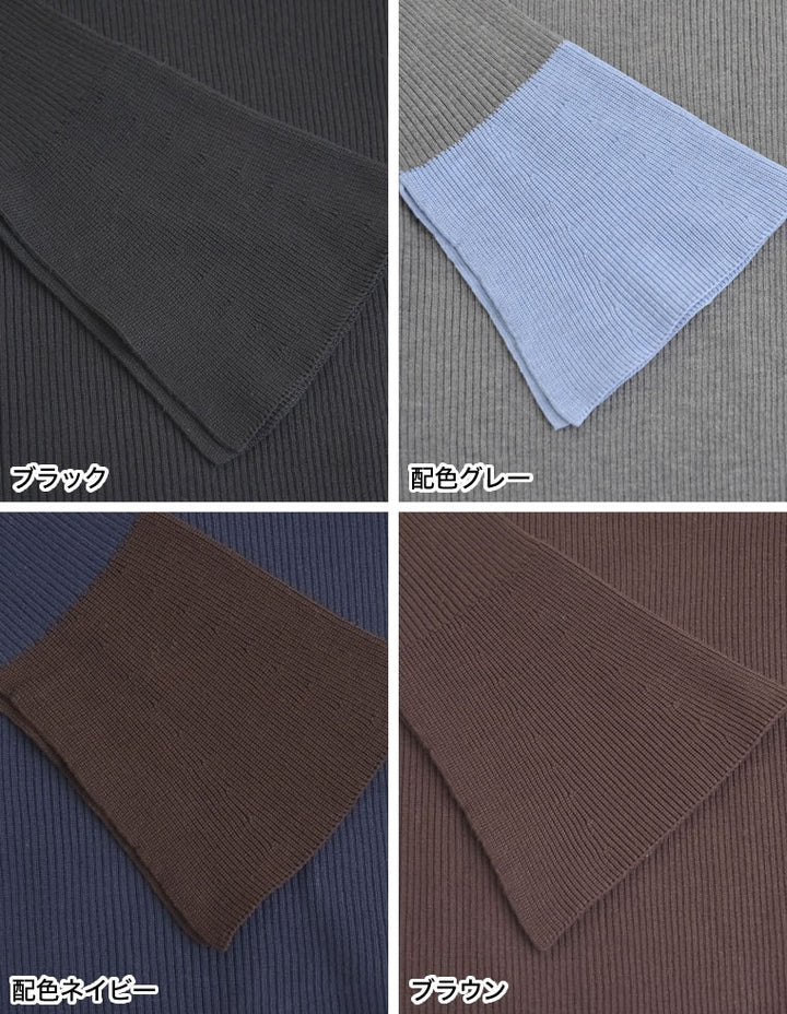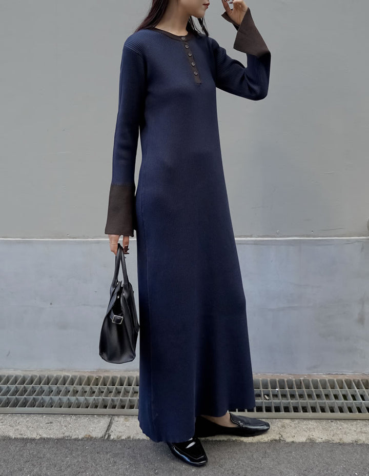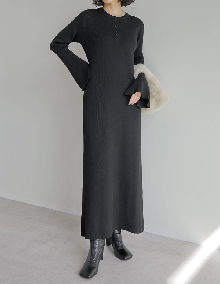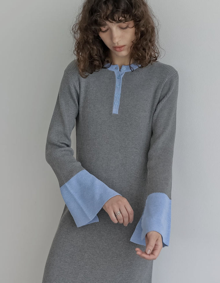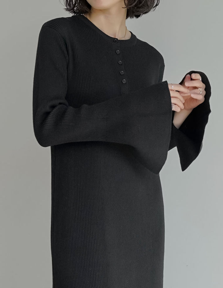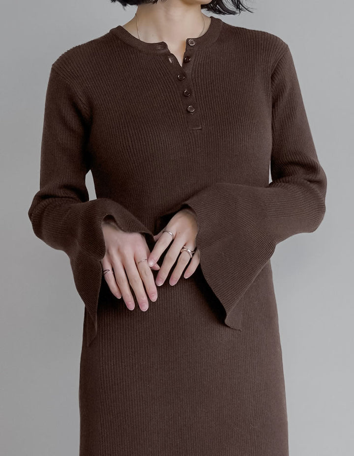 [2025AW COLLECTION][低身長サイズ有]配色or無地ヘンリーネックフレアスリーブリブニットナローワンピース