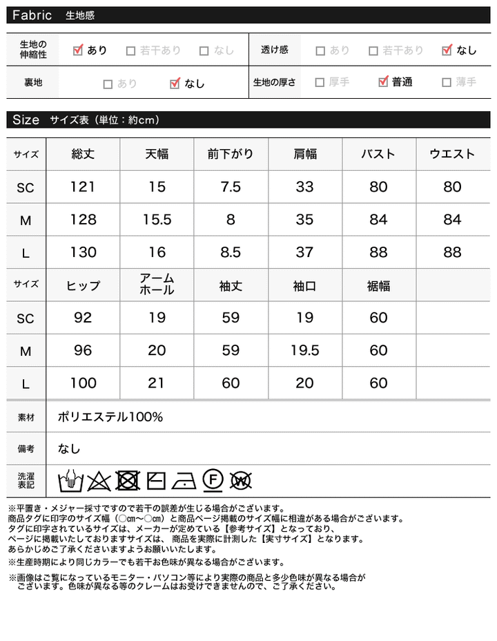 サイズ | 総丈 | 天幅 | 前下がり | 肩幅 | バスト | ウエスト | ヒップ | アームホール | 袖丈 | 袖口 | 裾幅 |
