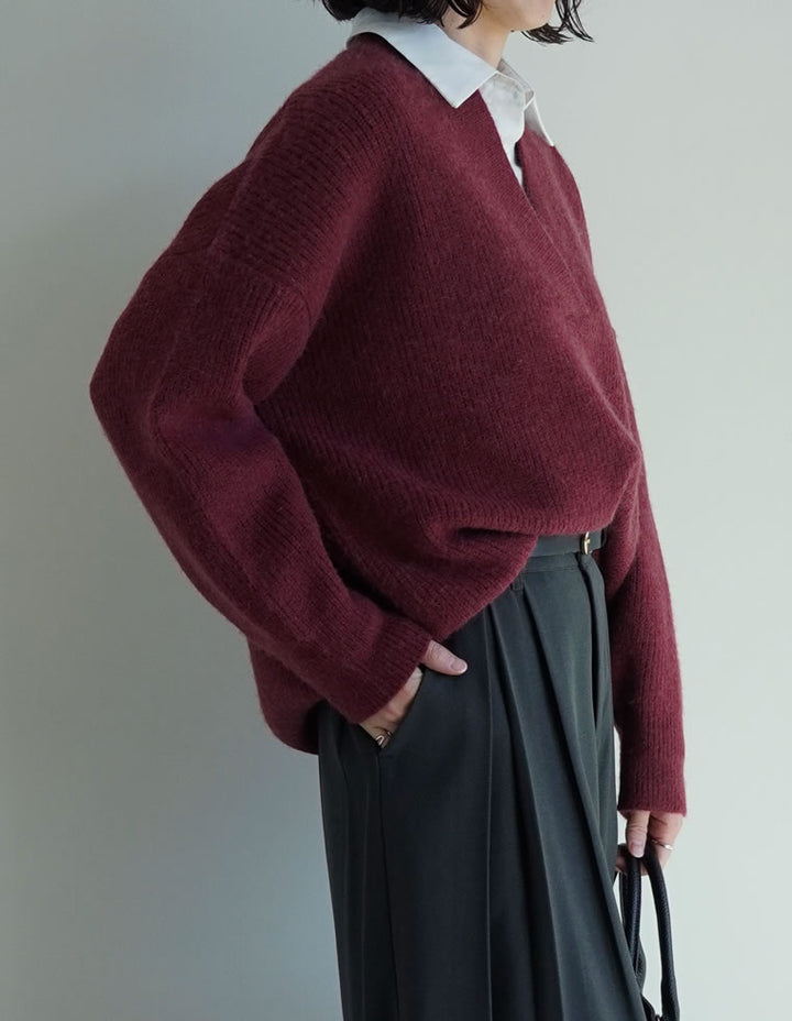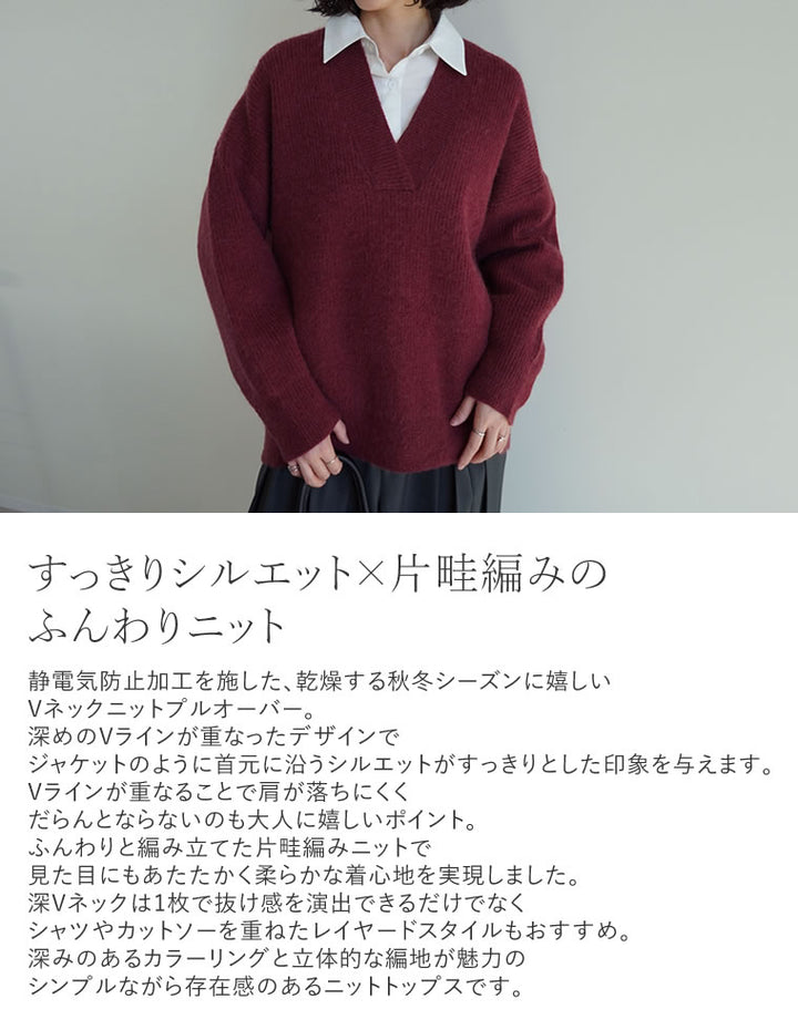 静電気防止加工を施した、乾燥する秋冬シーズンに嬉しいVネックニットプルオーバー。深めのVラインが重なったデザインで、ジャケットのように首元に沿うシルエットがすっきりとした印象を与えます。Vラインが重なることで肩が落ちにくく、だらんとならないのも大人に嬉しいポイント。ふんわりと編み立てた片畦編みニットで、見た目にもあたたかく柔らかな着心地を実現しました。深Vネックは1枚で抜け感を演出できるだけでなく、シャツやカットソーを重ねたレイヤードスタイルもおすすめ。深みのあるカラーリングと立体的な編地が魅力の、シンプルながら存在感のあるニットトップスです。