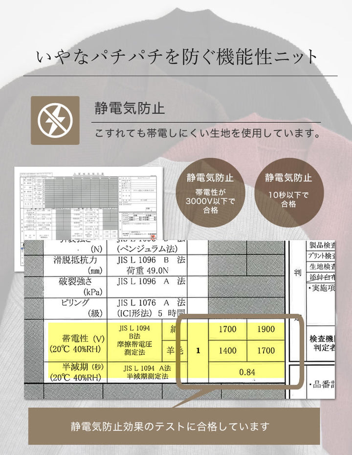 ふんわりとした弾力のある片畦編みニット静電気防止加工を施しており、乾燥しやすい季節でも快適に着用いただけます。