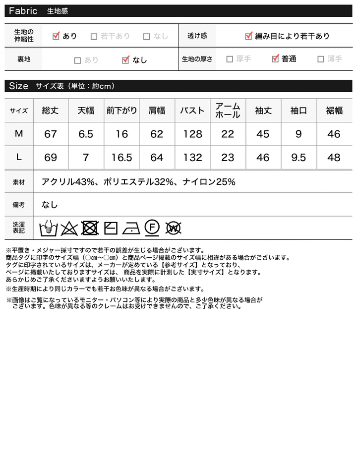 サイズ | 総丈 | 天幅 | 前下がり | 肩幅 | バスト | アームホール | 袖丈 | 袖口 | 裾幅 |