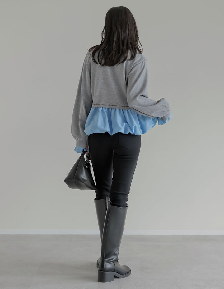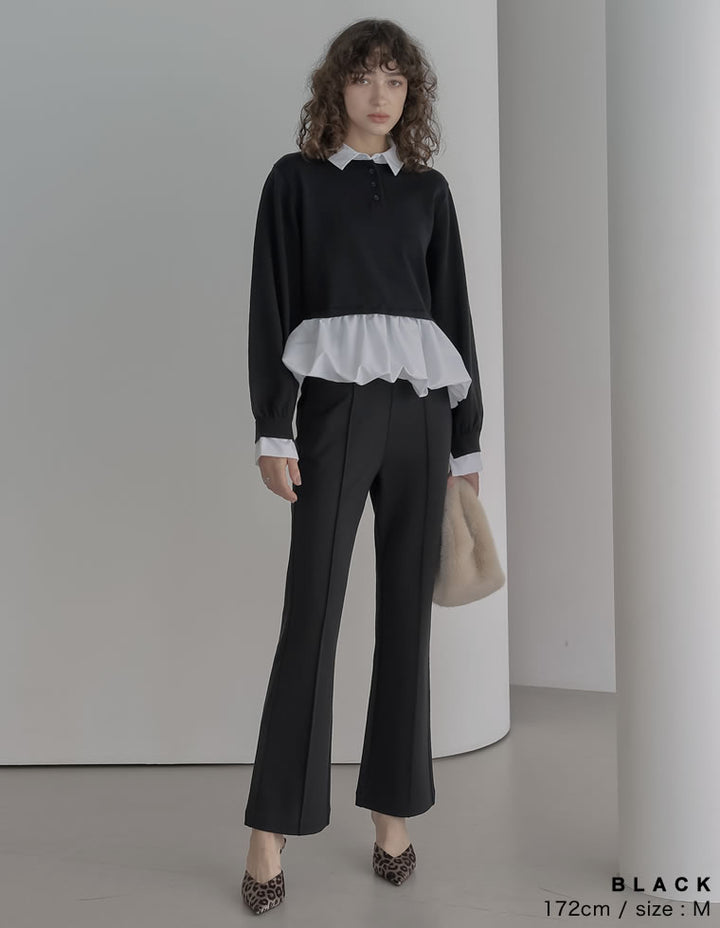 トレンドのレイヤードスタイルを、1枚で叶える時短トップス。ニットとシャツの絶妙なバランスで、さっと着るだけで今年らしい洗練された着こなしが完成します。スウェットのような軽快さとニットのきちんと感を両立させた素材感も魅力。フロントにはボタンをあしらい、ディテールにもこだわりました。重ね着にありがちな着ぶくれを解消し、ドッキングデザインで暖かさとすっきり感を両立。さらにウエスト位置を高めに設定することで、自然なスタイルアップも叶います。シャツの裾はバルーン仕様で立体感をプラスし、袖先のレイヤード風デザインもさりげないアクセントに。