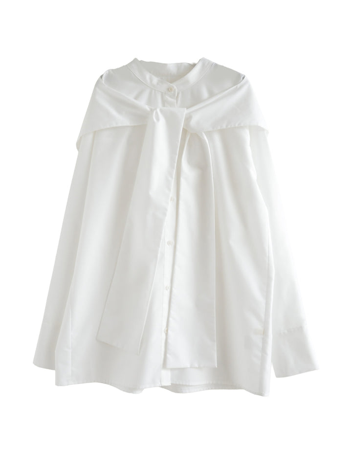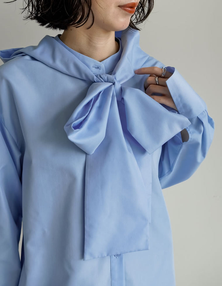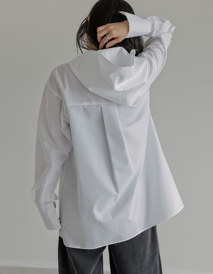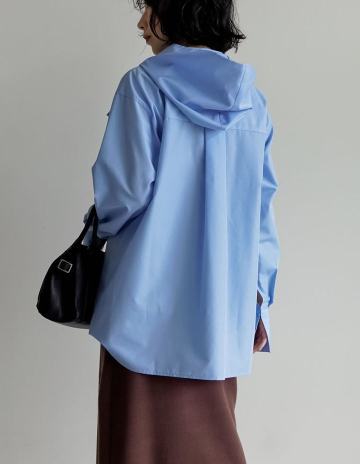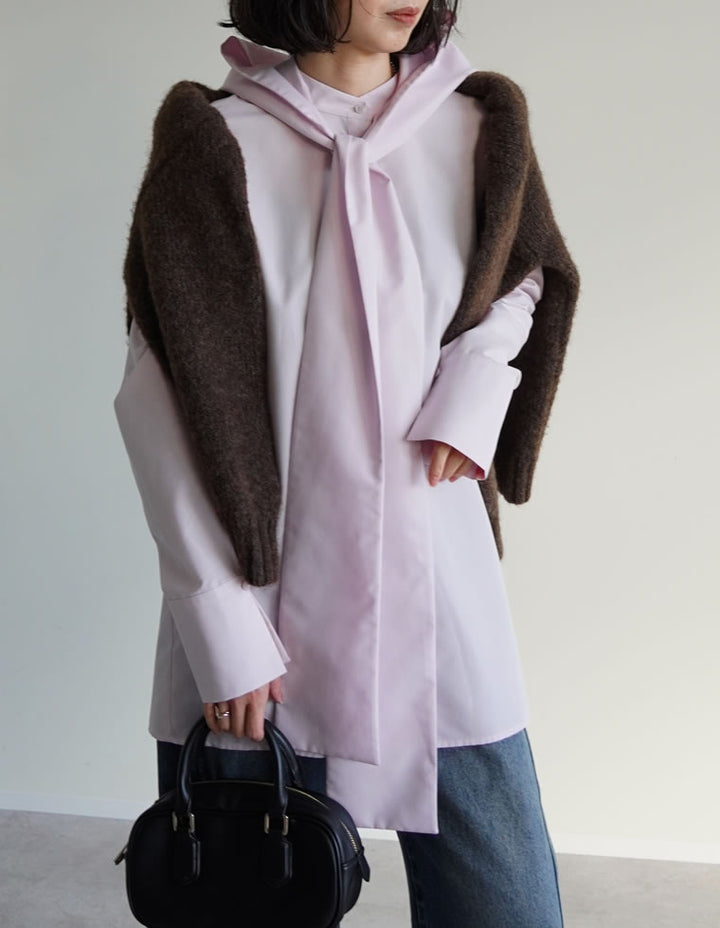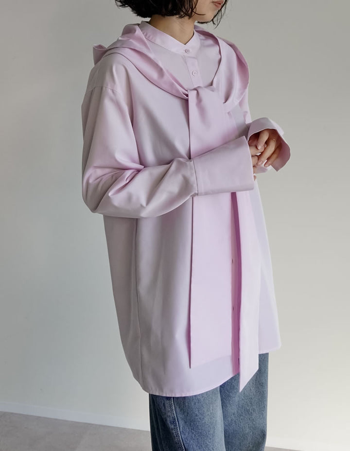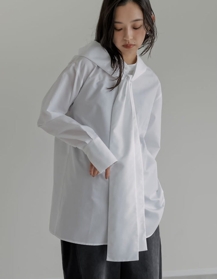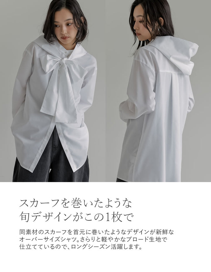 同素材のスカーフを首元に巻いたようなデザインが新鮮なオーバーサイズシャツ。さらりと軽やかなブロード生地で仕立てているので、ロングシーズン活躍します。リラクシーなオーバーサイズシルエットは、きれいめにもカジュアルにも振れる万能さが魅力。後ろはフード仕様になっており、ジャケットやニットからフードを覗かせれば、今年らしいレイヤードスタイルに。