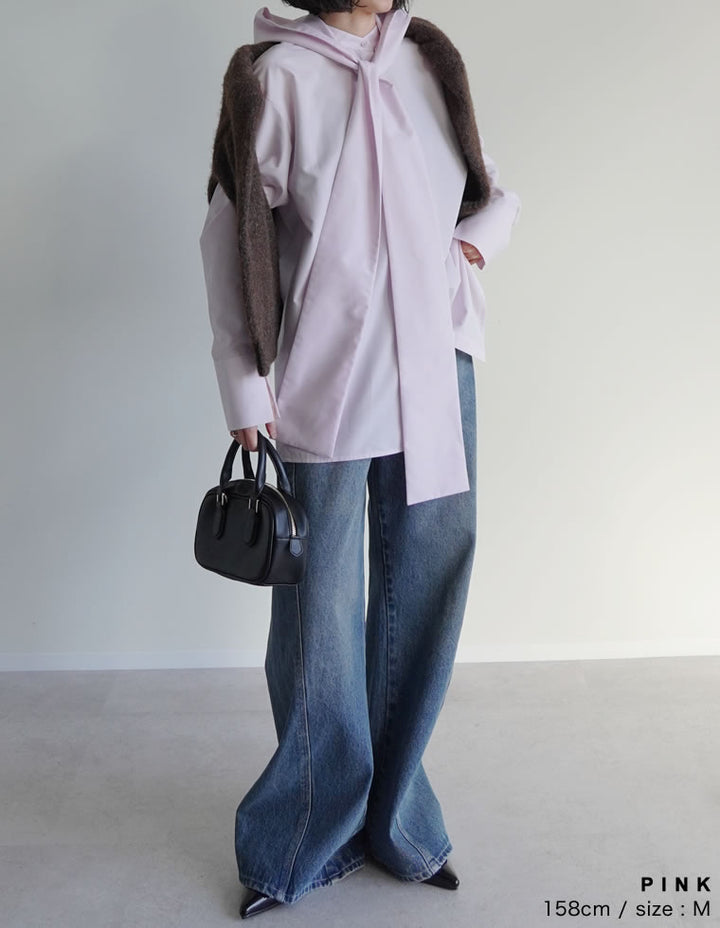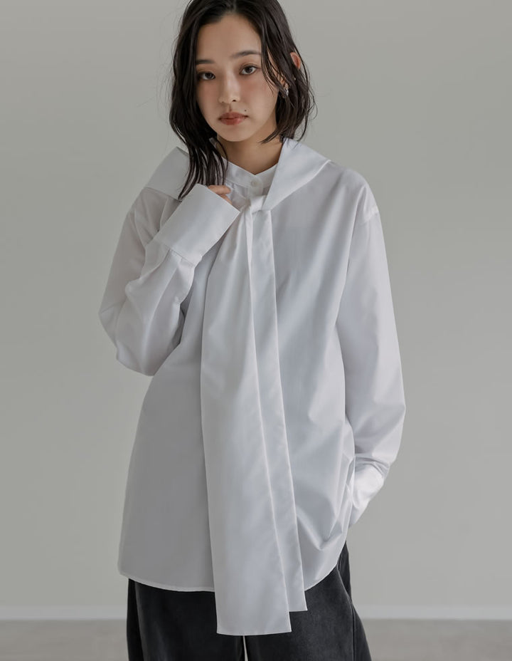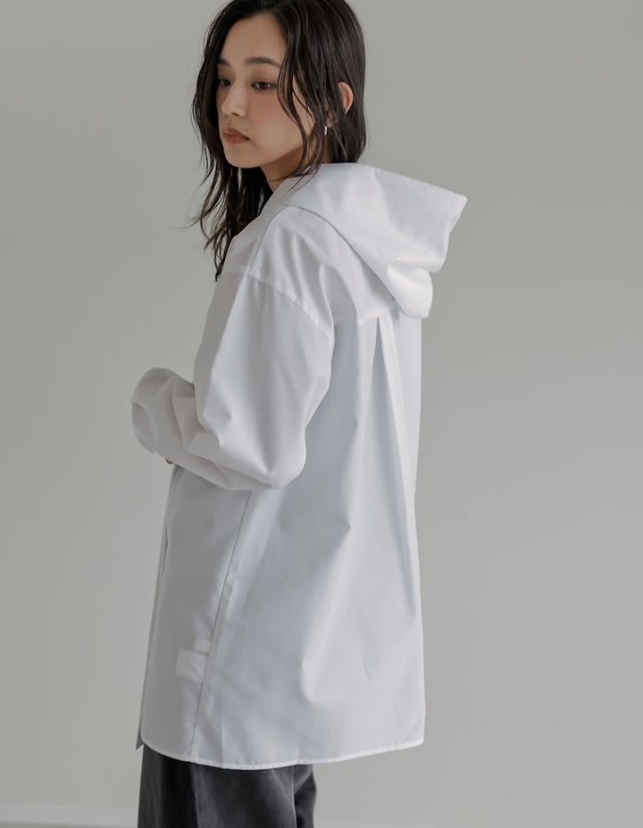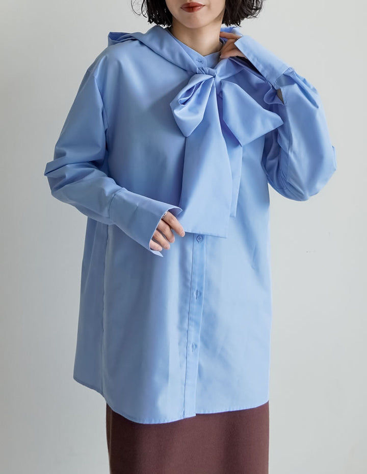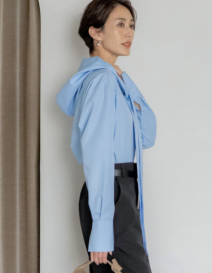 同素材のスカーフを首元に巻いたようなデザインが新鮮なオーバーサイズシャツ。さらりと軽やかなブロード生地で仕立てているので、ロングシーズン活躍します。リラクシーなオーバーサイズシルエットは、きれいめにもカジュアルにも振れる万能さが魅力。後ろはフード仕様になっており、ジャケットやニットからフードを覗かせれば、今年らしいレイヤードスタイルに。