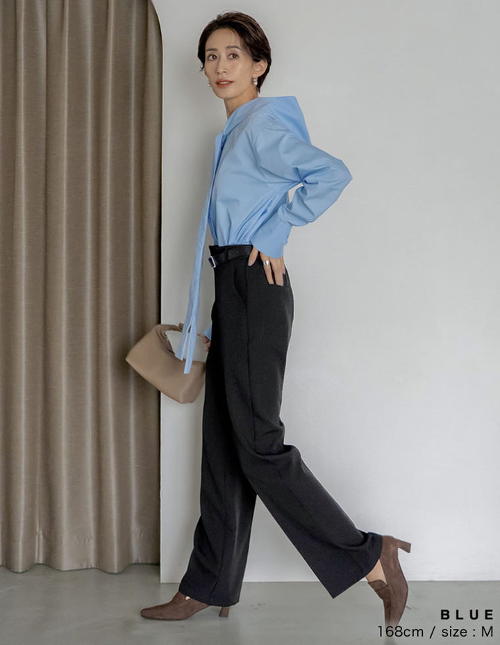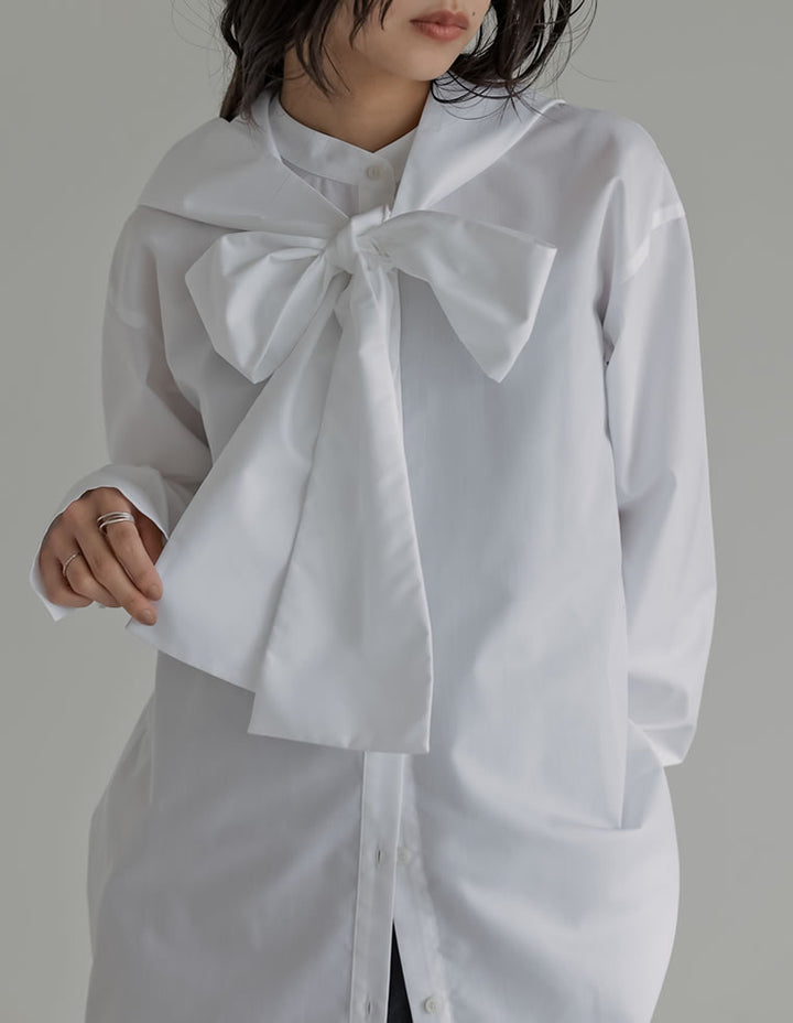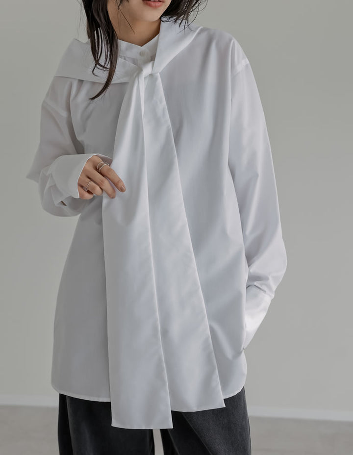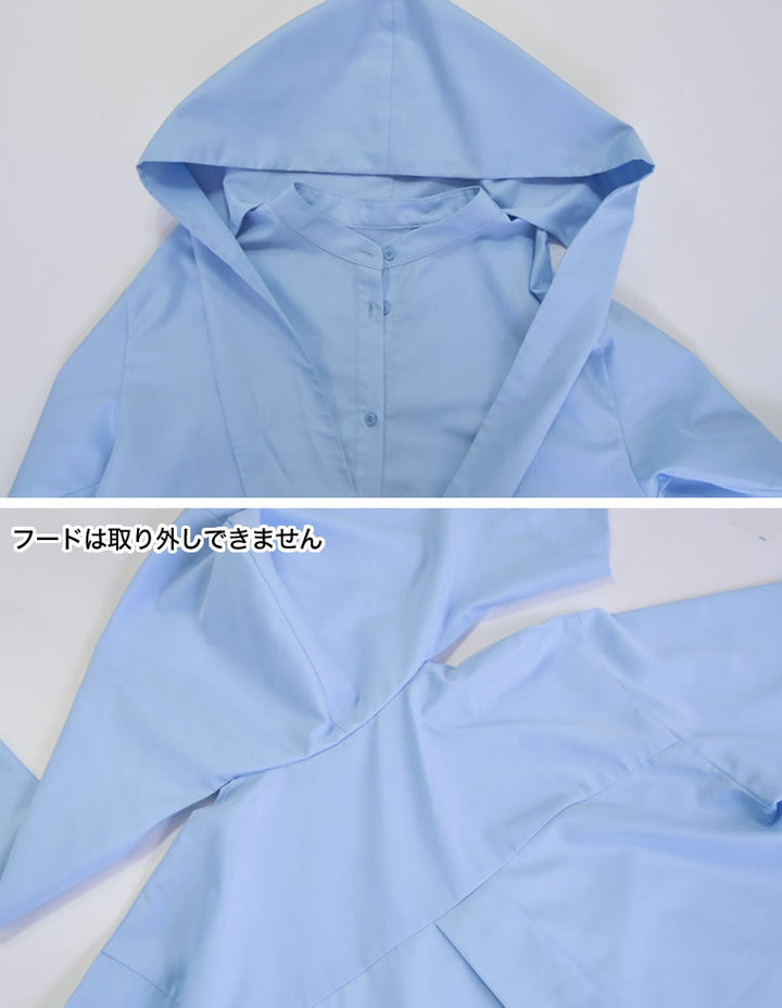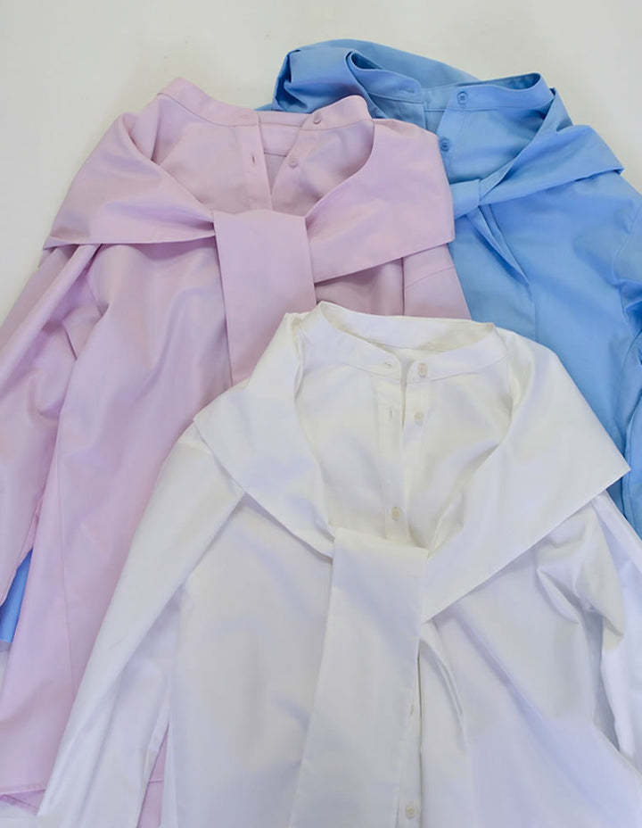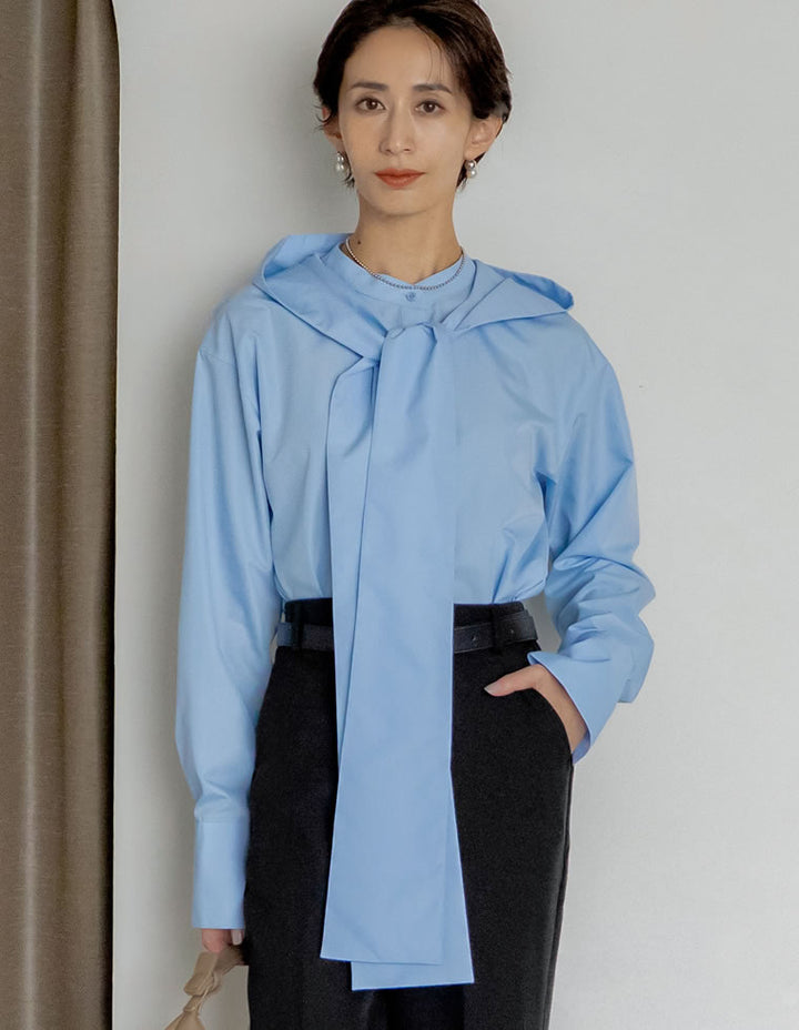 同素材のスカーフを首元に巻いたようなデザインが新鮮なオーバーサイズシャツ。さらりと軽やかなブロード生地で仕立てているので、ロングシーズン活躍します。リラクシーなオーバーサイズシルエットは、きれいめにもカジュアルにも振れる万能さが魅力。後ろはフード仕様になっており、ジャケットやニットからフードを覗かせれば、今年らしいレイヤードスタイルに。