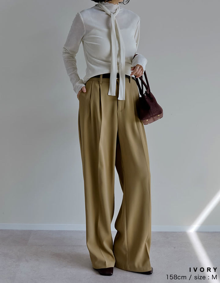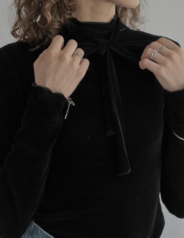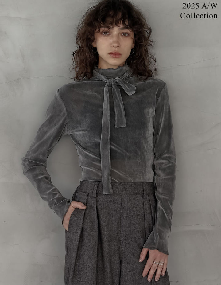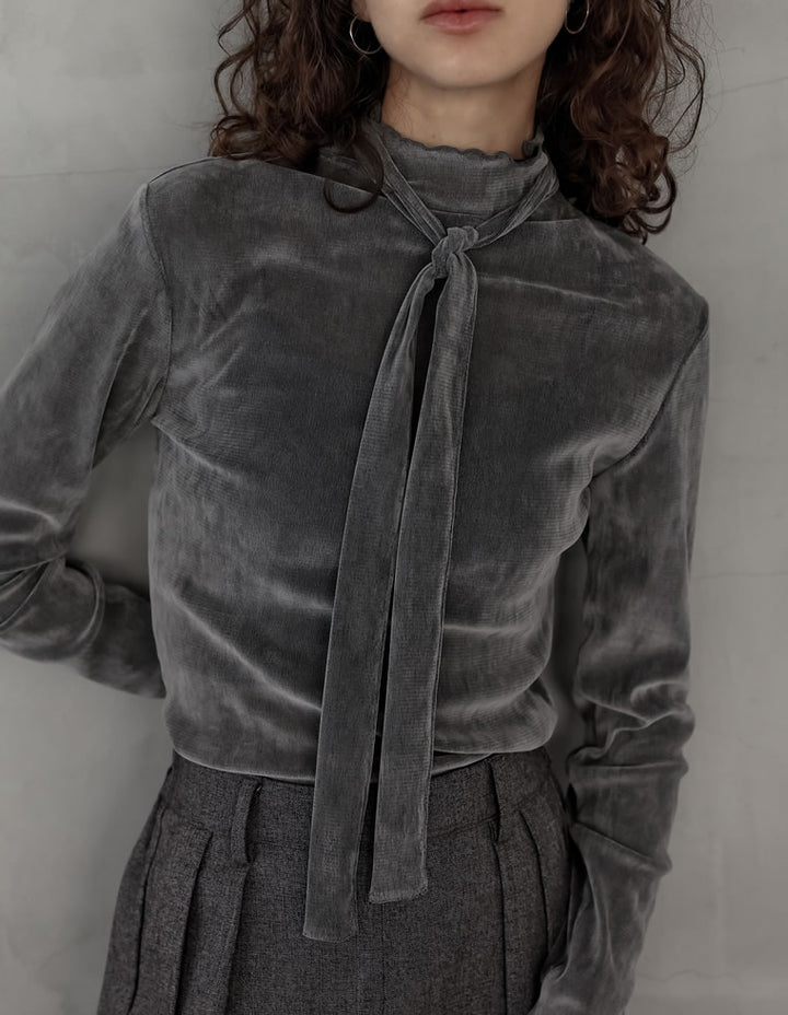 どんなシーンにも映える、ベロアハイネックトップスとスカーフの華やかな2点セット。ほのかなシアー感のあるフロッキーベロア素材で、シーズンムードが高まる1枚です。トップスはハイネックデザインで首元を上品に見せ、ほどよいフィット感で一枚でも着映えします。バックに走るハギラインがさりげないアクセントとなり、後ろ姿まで抜かりのない印象に。付属のベロアスカーフは、艶やかな光沢感が魅力。スカーフをプラスするだけで、シンプルな着こなしも一気にクラスアップ。リボン結びはもちろん、一重で垂らしたり、アレンジ次第で表情を変えられます。日常のスタイルにモードな華やぎをプラスできる、シアーフロッキーベロアトップスです。