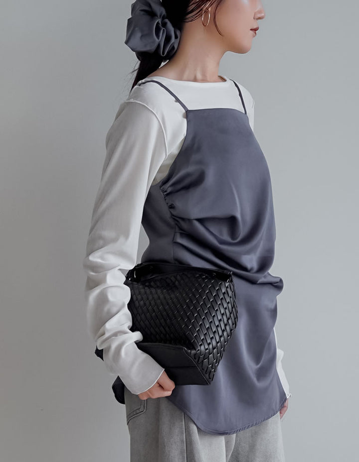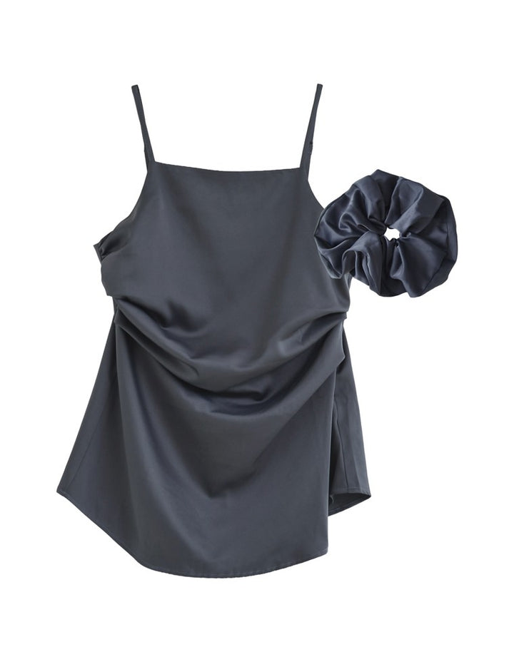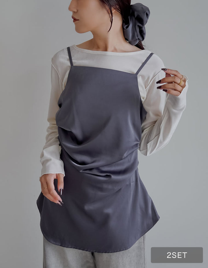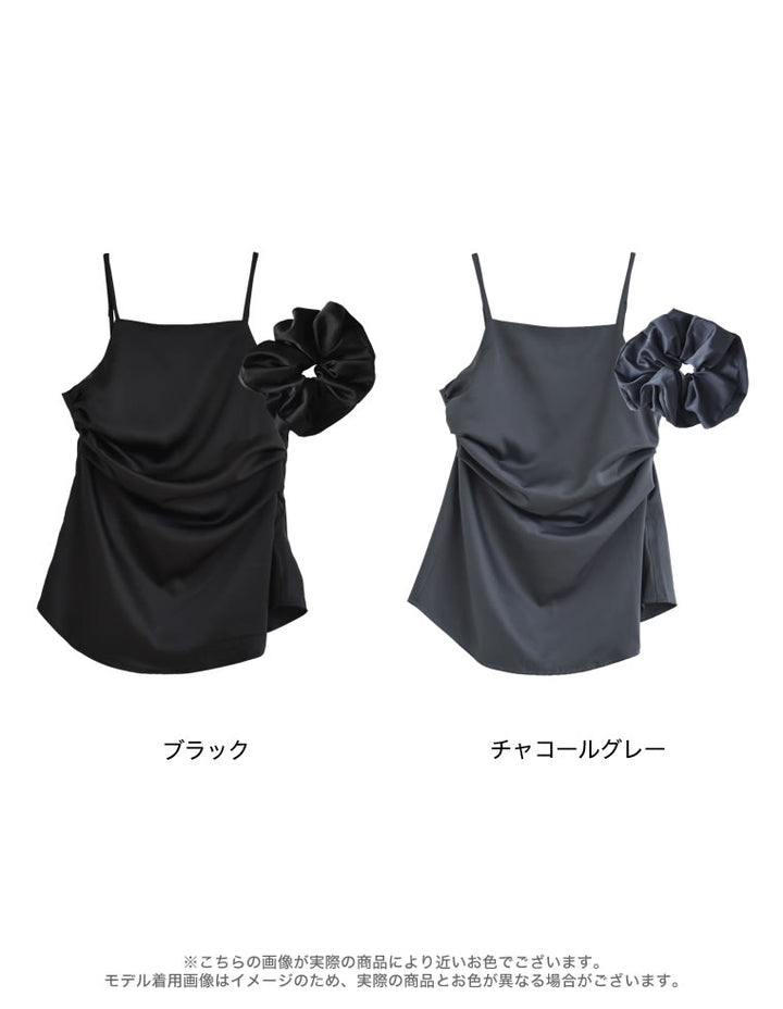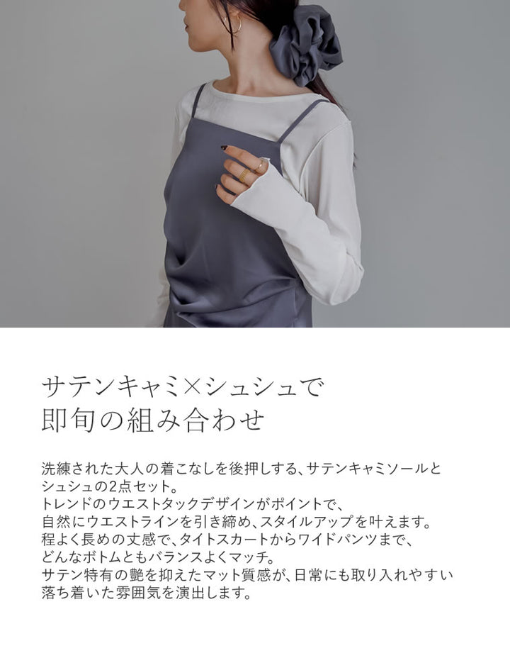 洗練された大人の着こなしを後押しする、サテンキャミソールとシュシュの2点セット。トレンドのウエストタックデザインがポイントで、自然にウエストラインを引き締め、スタイルアップを叶えます。程よく長めの丈感で、タイトスカートからワイドパンツまで、どんなボトムともバランスよくマッチ。サテン特有の艶を抑えたマット質感が、日常にも取り入れやすい落ち着いた雰囲気を演出します。付属のシュシュは、同素材で統一感のあるデザイン。