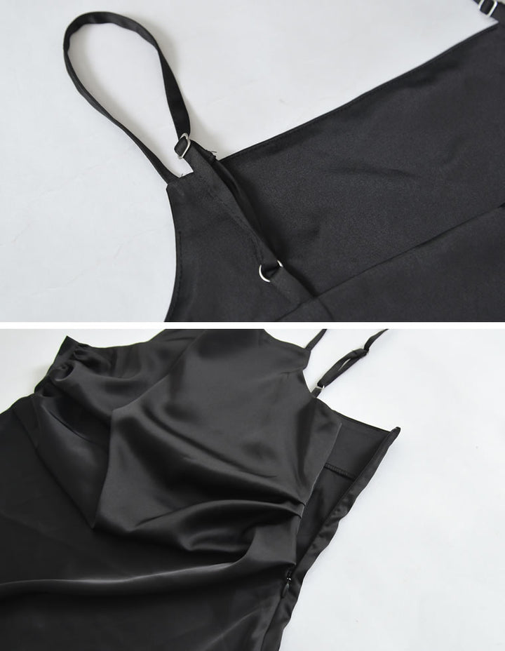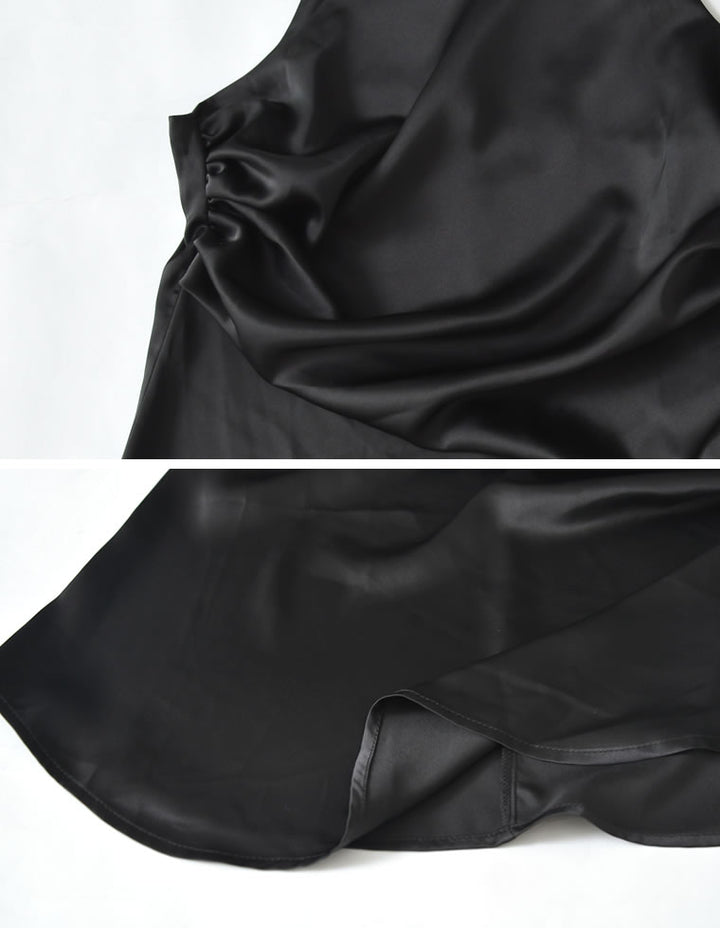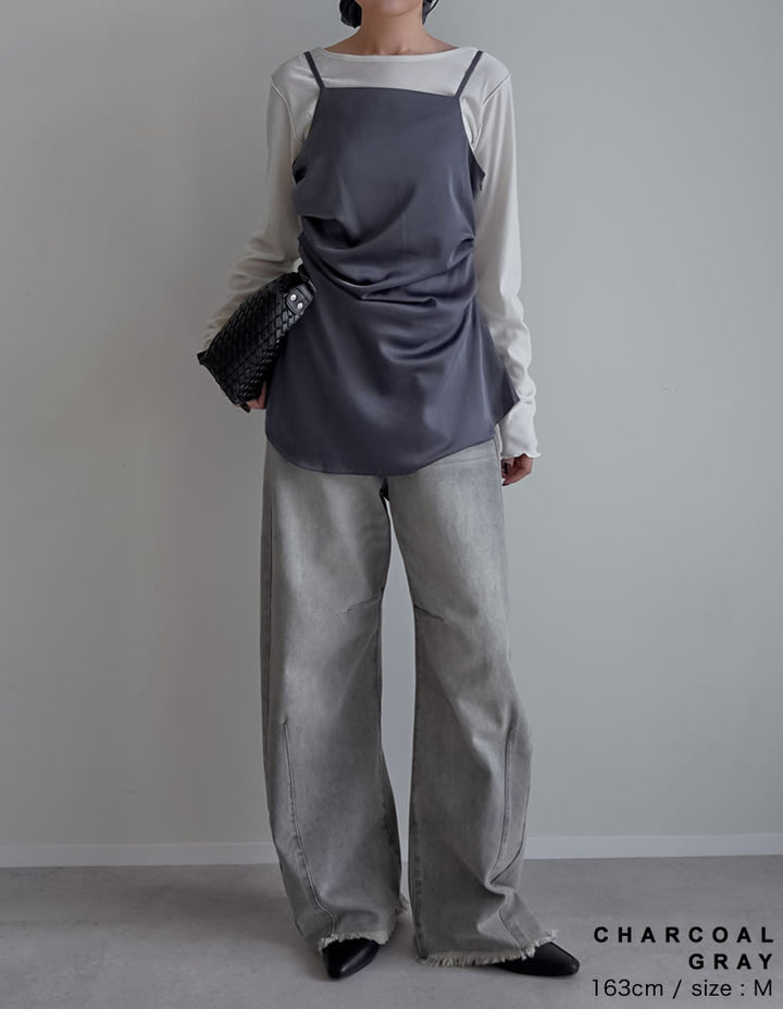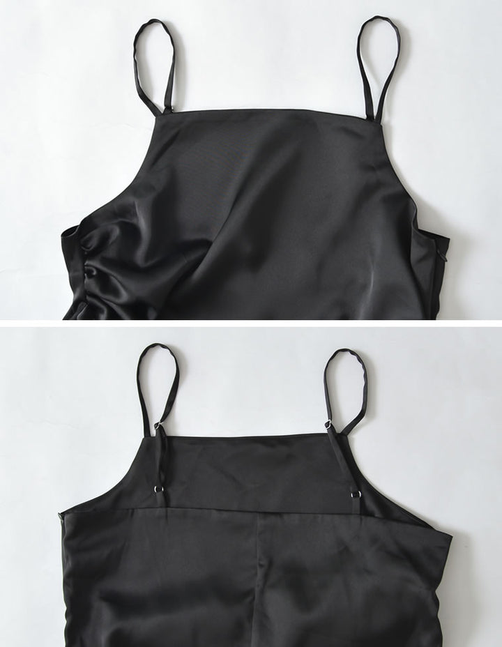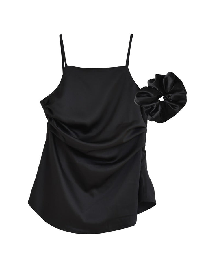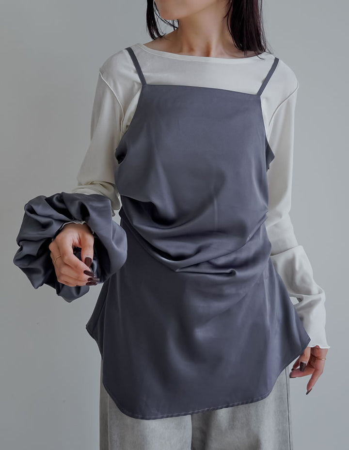 洗練された大人の着こなしを後押しする、サテンキャミソールとシュシュの2点セット。トレンドのウエストタックデザインがポイントで、自然にウエストラインを引き締め、スタイルアップを叶えます。程よく長めの丈感で、タイトスカートからワイドパンツまで、どんなボトムともバランスよくマッチ。サテン特有の艶を抑えたマット質感が、日常にも取り入れやすい落ち着いた雰囲気を演出します。付属のシュシュは、同素材で統一感のあるデザイン。