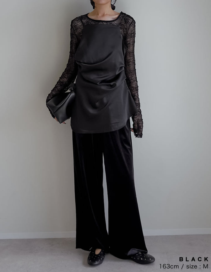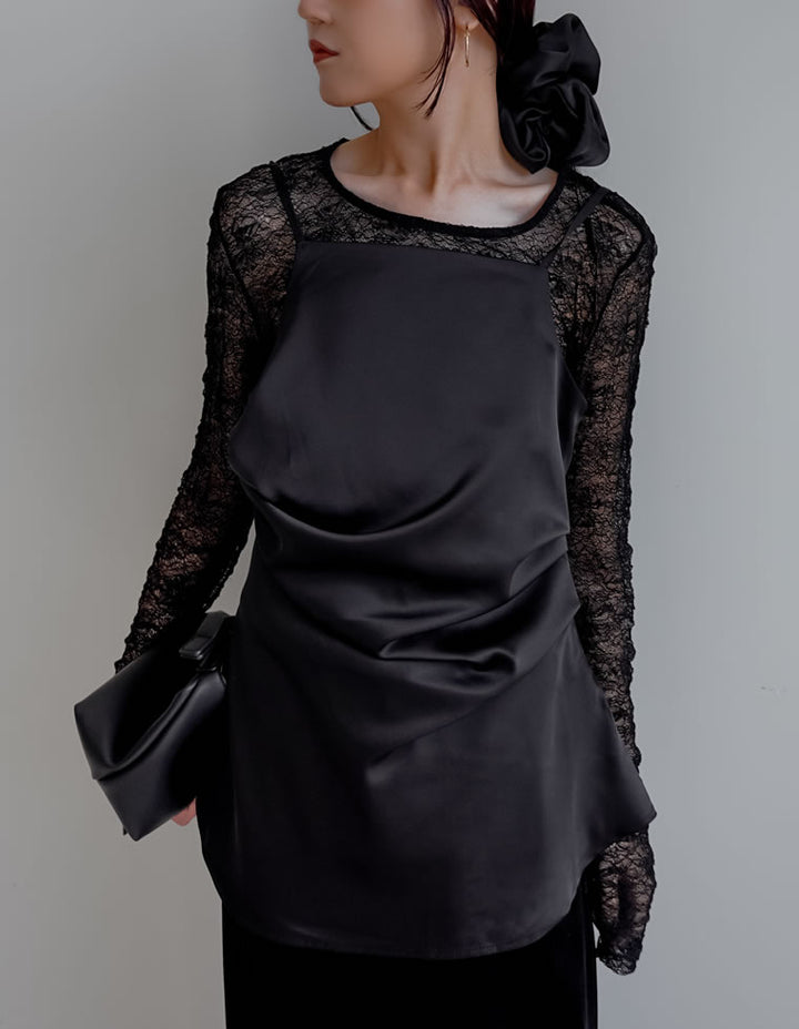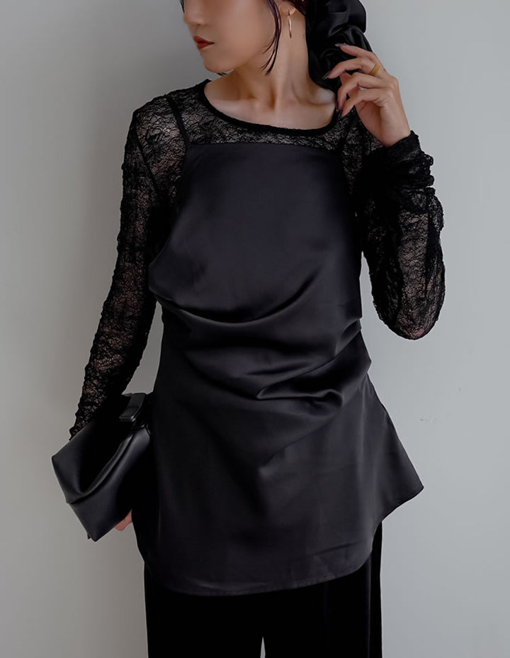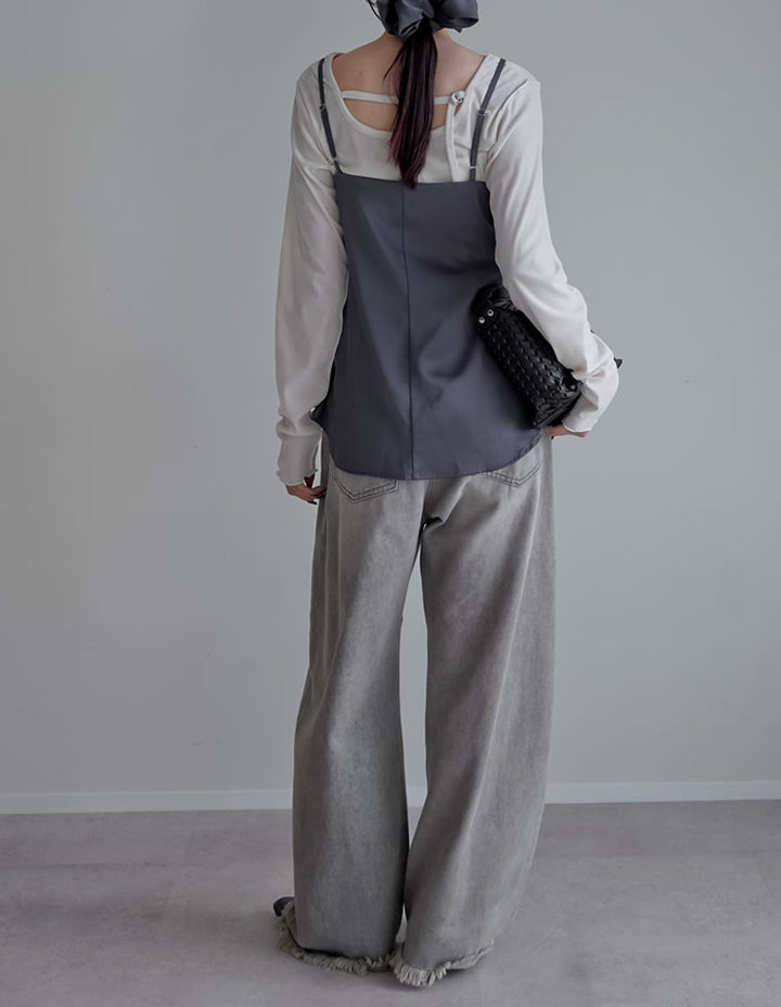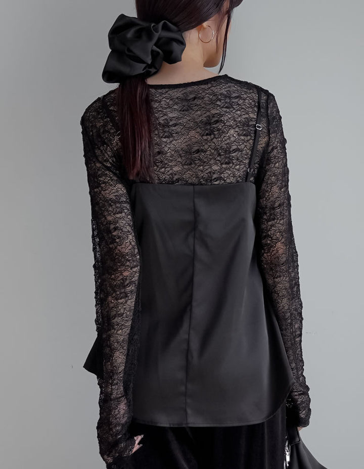 レーストップスやカットソーにキャミソールを重ねた着こなしがおすすめ。