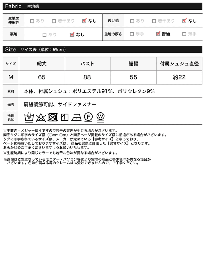サイズ | 総丈 | バスト | 裾幅 | 付属シュシュ直径 |