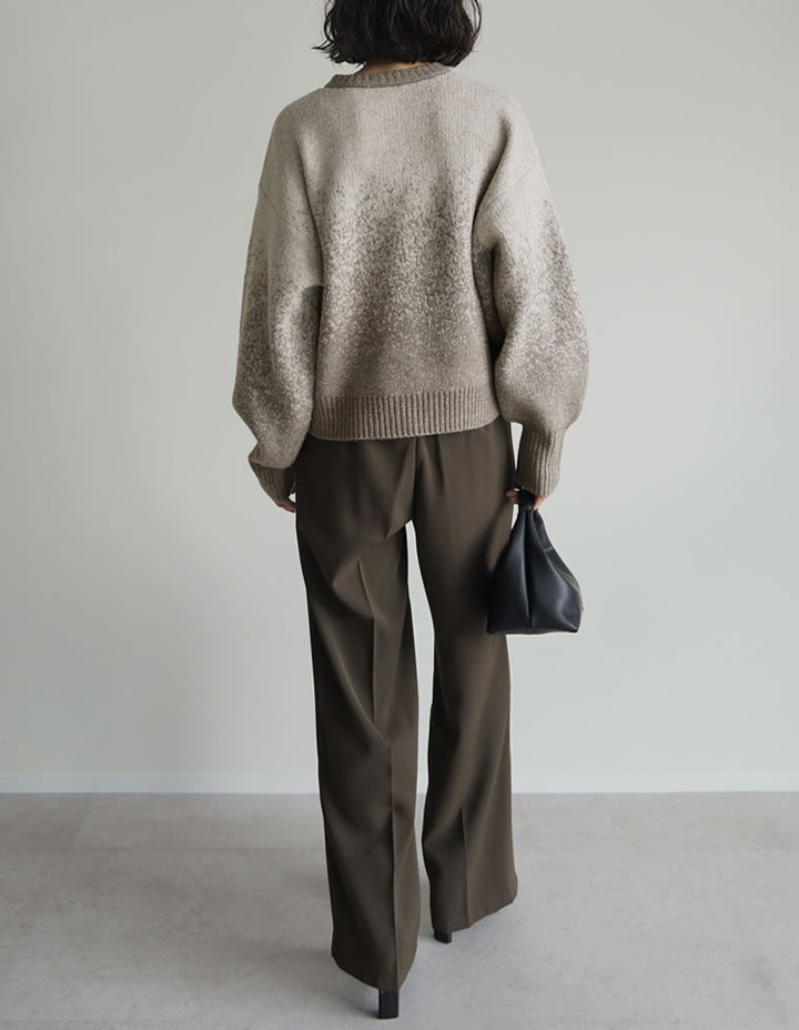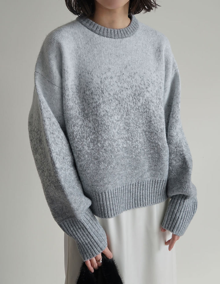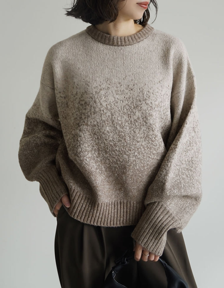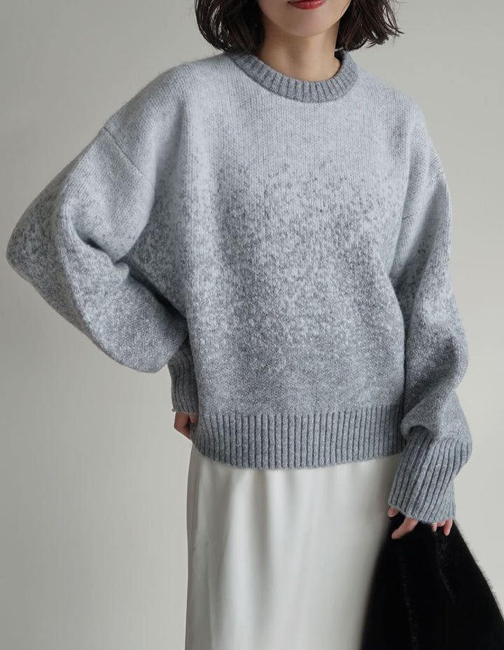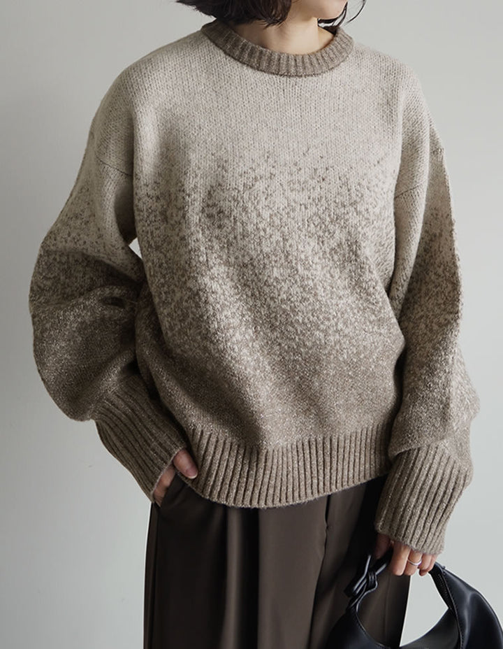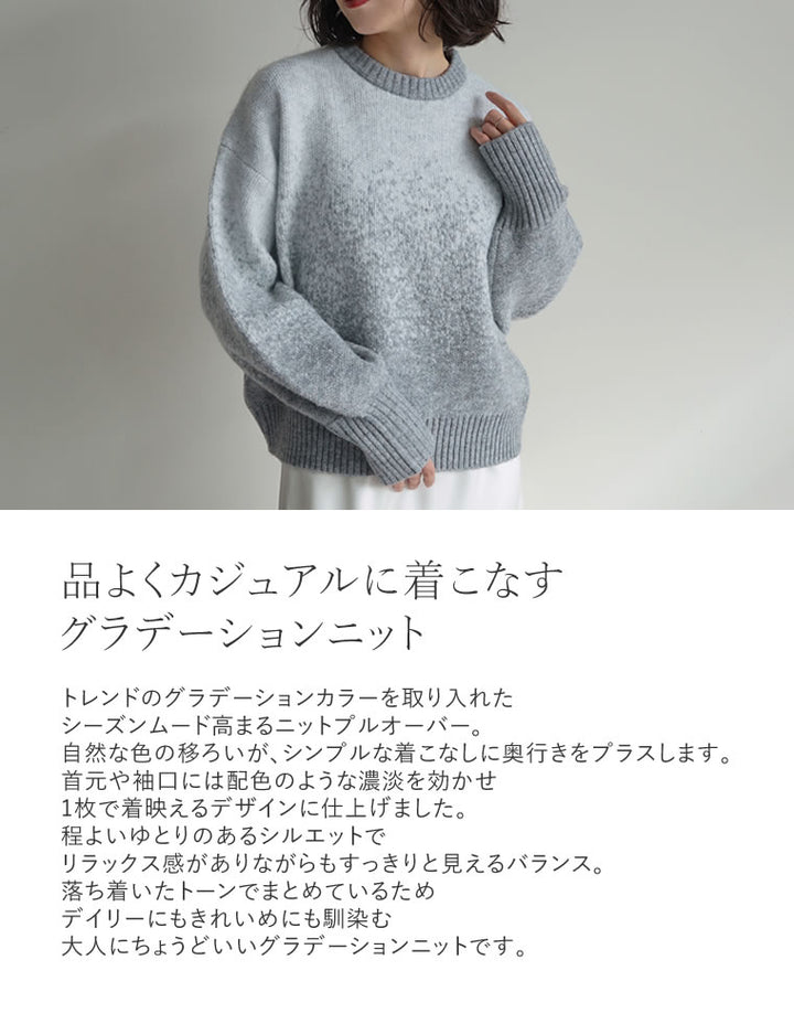 トレンドのグラデーションカラーを取り入れた、シーズンムード高まるニットプルオーバー。自然な色の移ろいが、シンプルな着こなしに奥行きをプラスします。首元や袖口には配色のような濃淡を効かせ、1枚で着映えるデザインに仕上げました。程よいゆとりのあるシルエットで、リラックス感がありながらもすっきりと見えるバランス。落ち着いたトーンでまとめているため、デイリーにもきれいめにも馴染む、大人にちょうどいいグラデーションニットです。