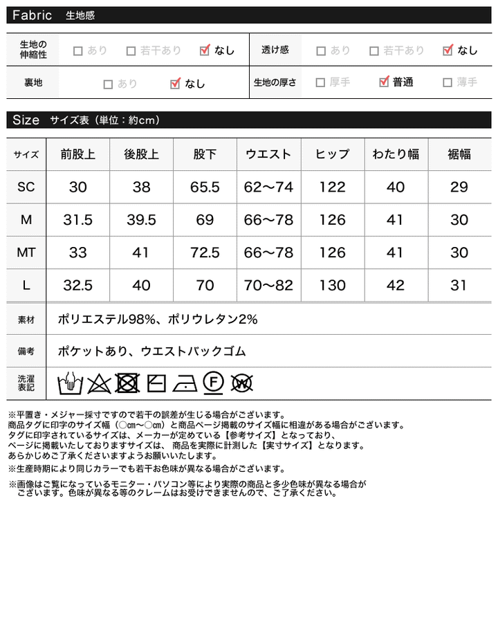 | サイズ | 前股上 | 後股上 | 股下 | ウエスト | ヒップ | わたり幅 | 裾幅 |