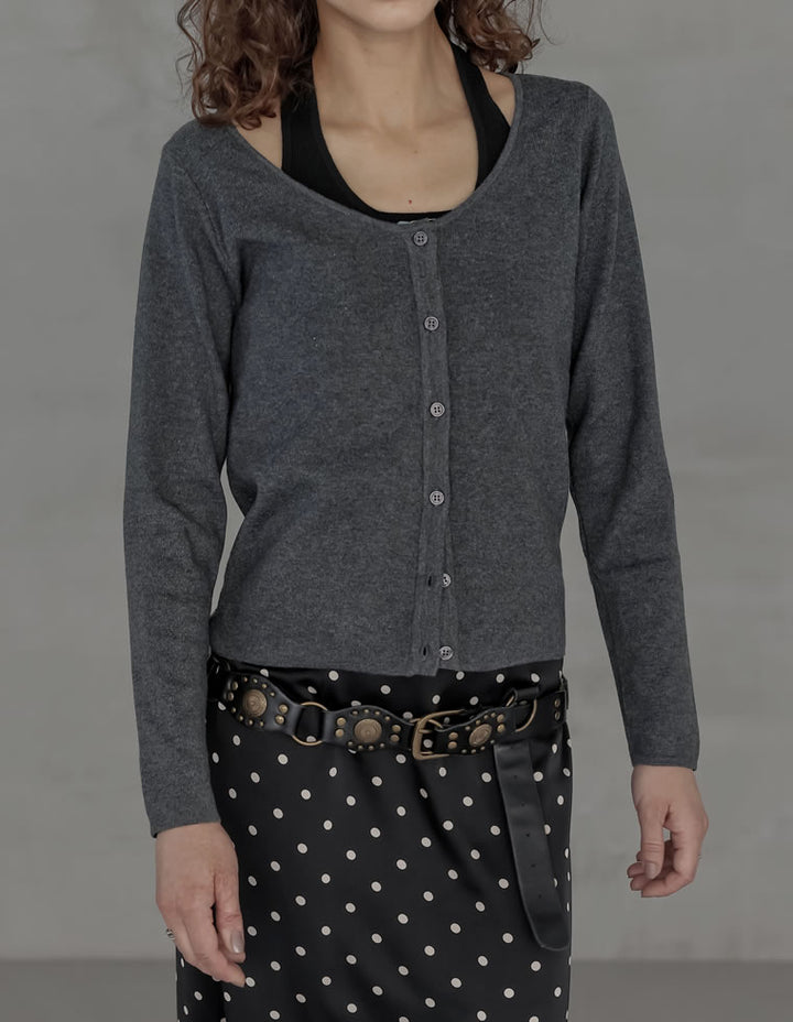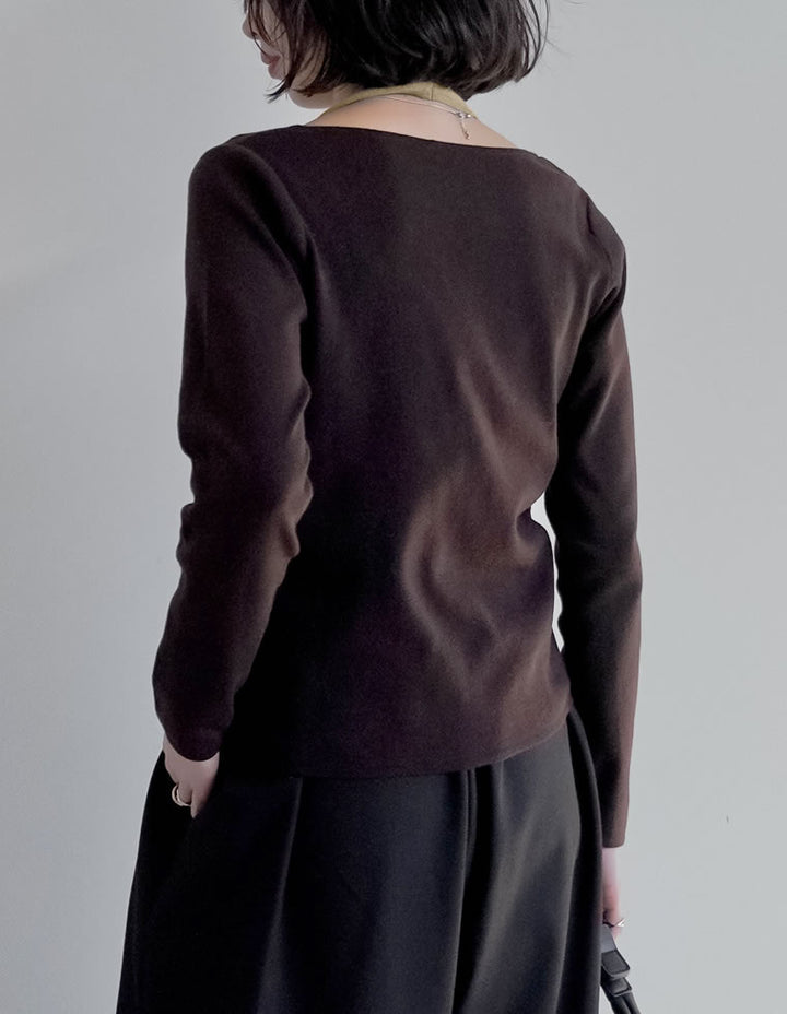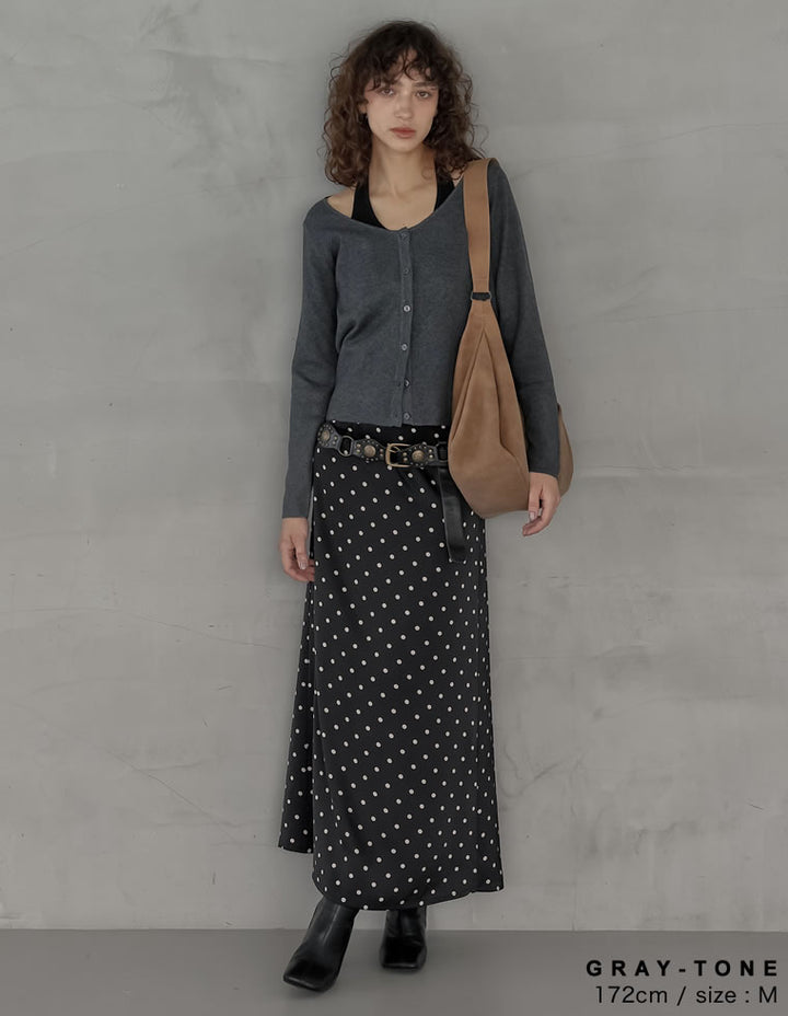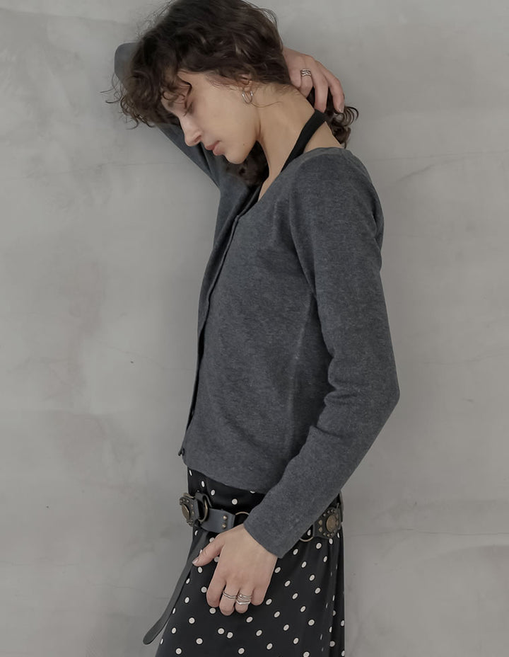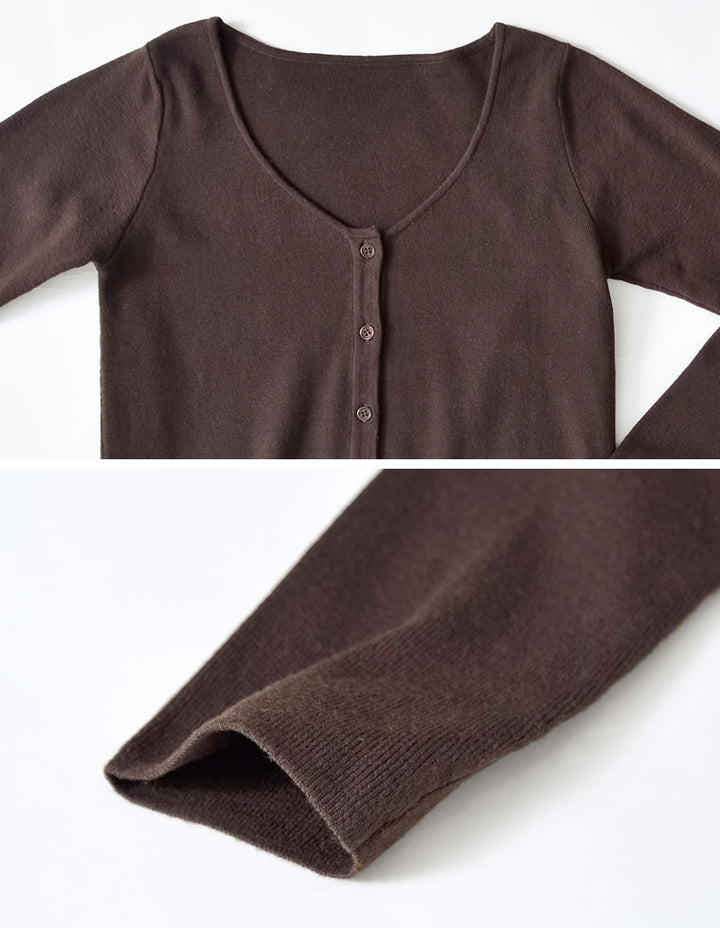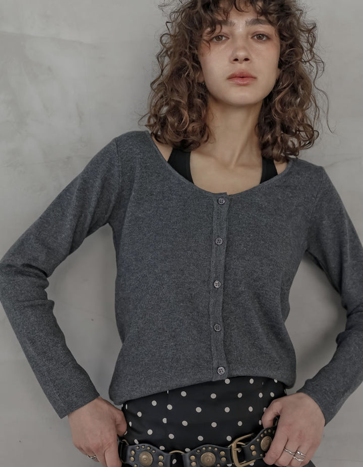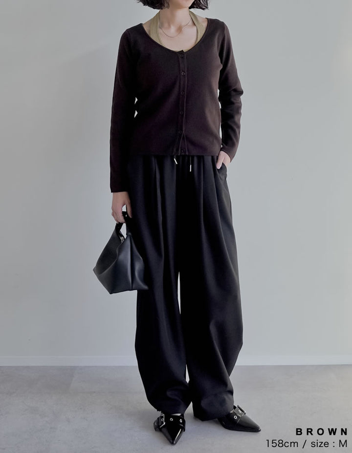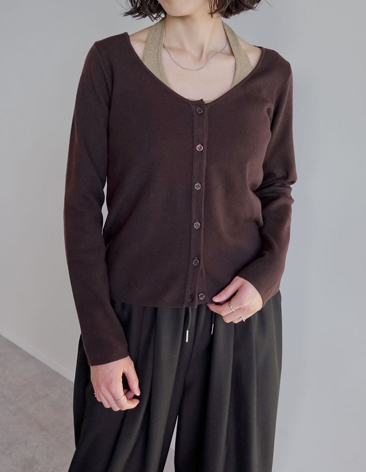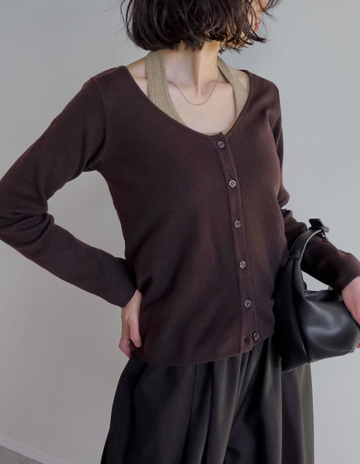 ブラックは単色、グレートーン、ブラウンは配色のデザインでお作りしました。カーディガンは、程よくゆとりのあるコンパクトシルエット。さらりとしたハイゲージニットで肌ざわりが良く、1枚でも羽織りとしても活躍します。緩やかなVネックラインが顔まわりをすっきり見せ、クルーネックのインナーを重ねたレイヤードスタイルもおすすめ。裾のボタンを1~2個開けて抜け感を出す着こなしが今季らしく、デイリーにもオフィススタイルにもマッチするアイテムです。