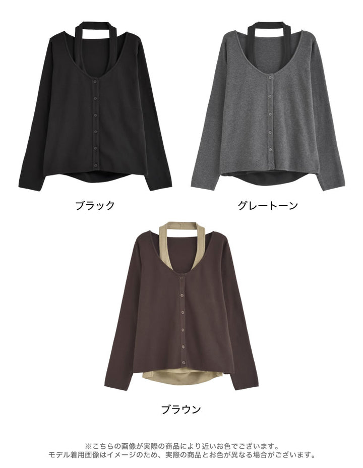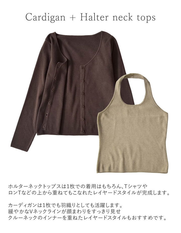 旬のホルターネックキャミソールとカーディガンがセットになった、着映えアンサンブル。インナーのホルターネックは、肌見えを抑えた程よい開き具合で、大人でも取り入れやすいデザインに仕上げました。1枚ではもちろん、TシャツやロンTなどの上から重ねてもこなれたレイヤードスタイルが完成します。
