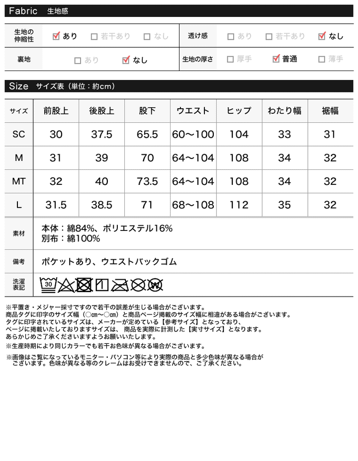 サイズ | 前股上 | 後股上 | 股下 | ウエスト | ヒップ | わたり幅 | 裾幅 |