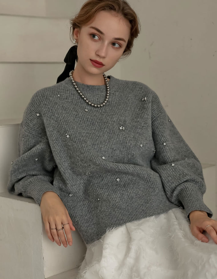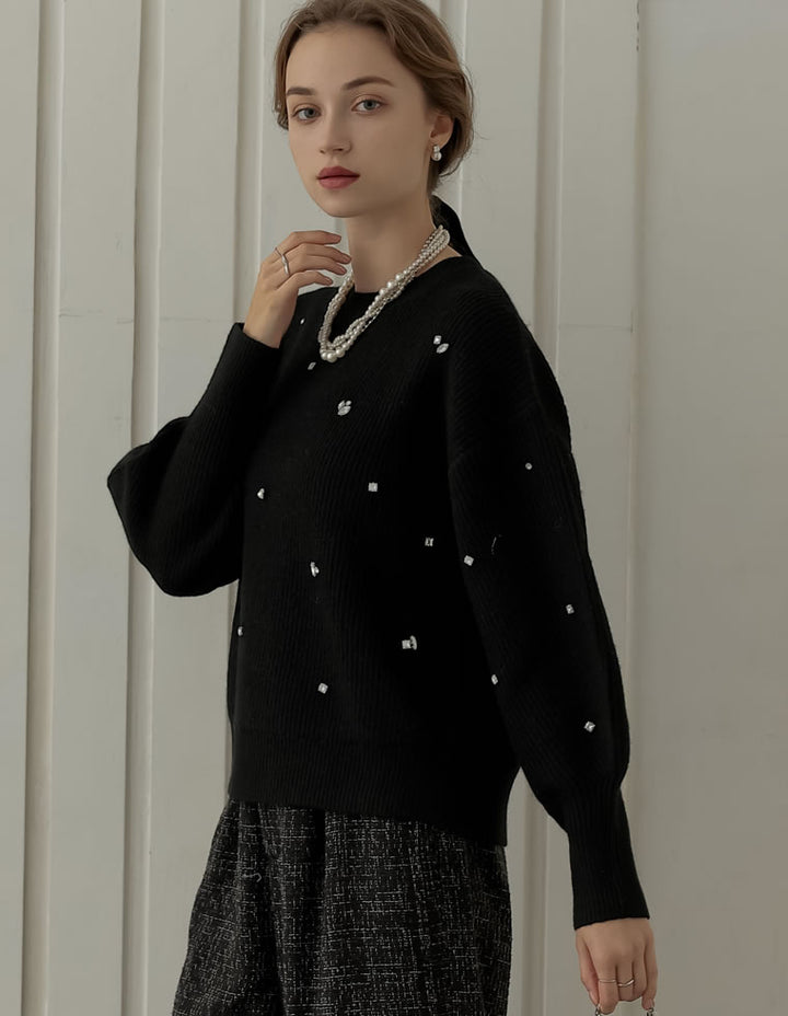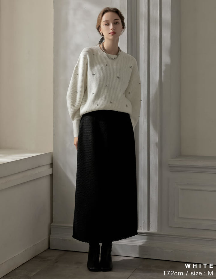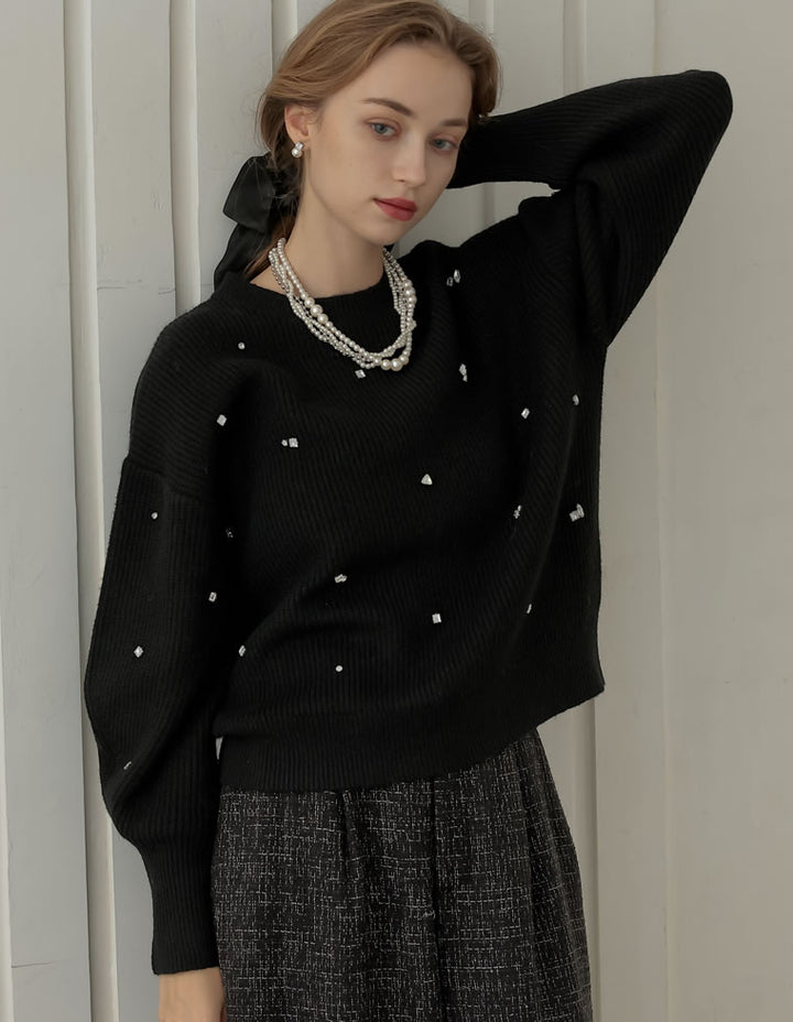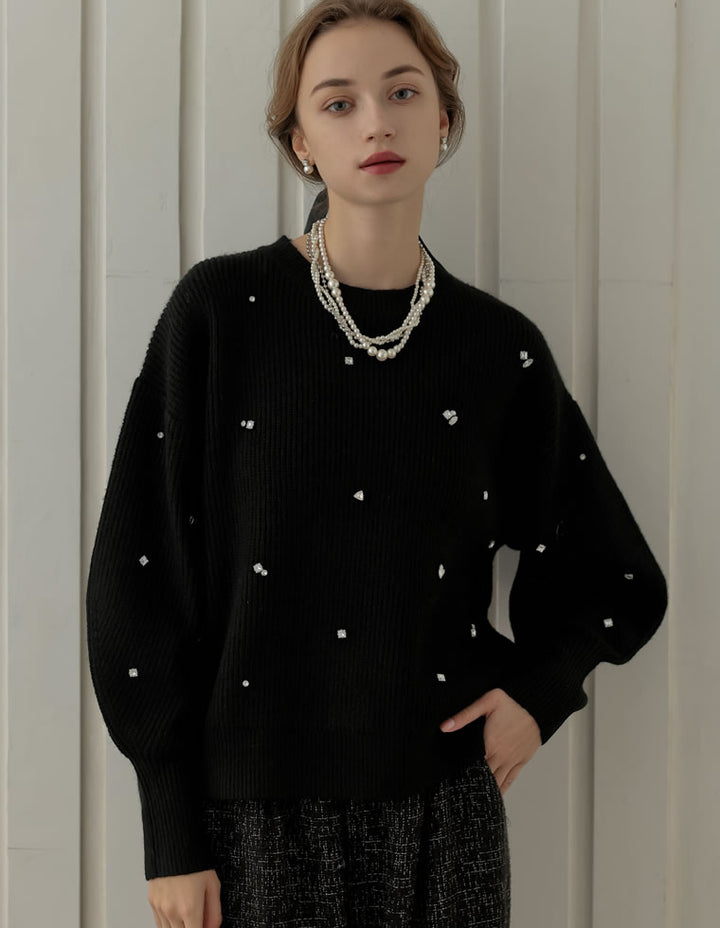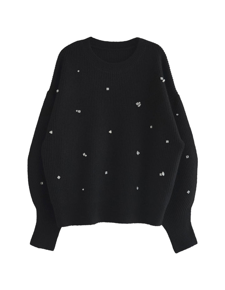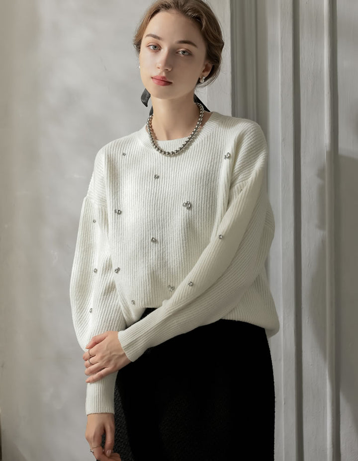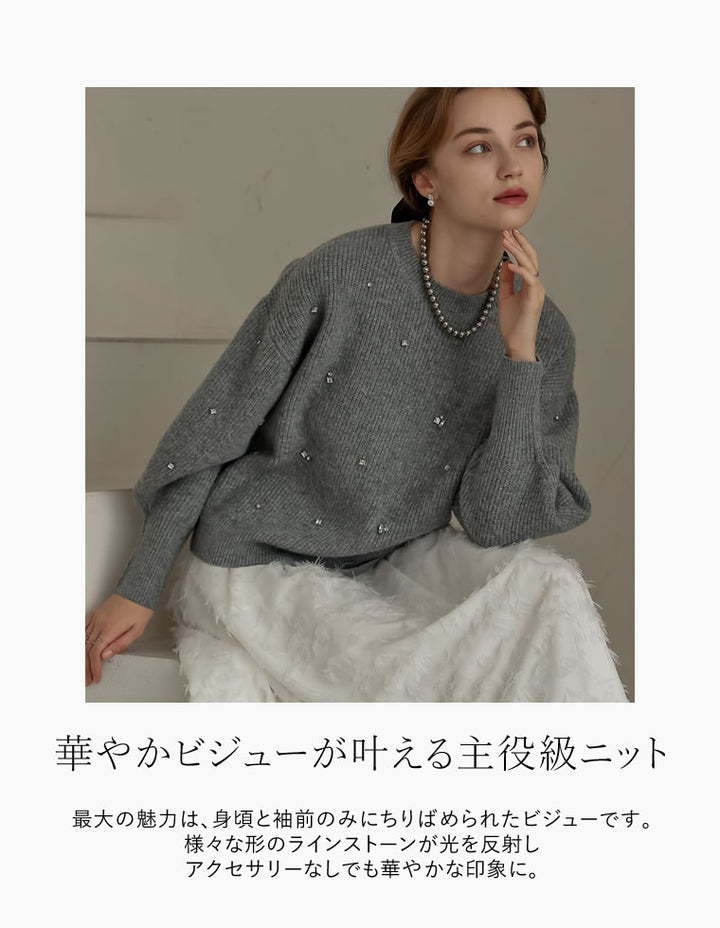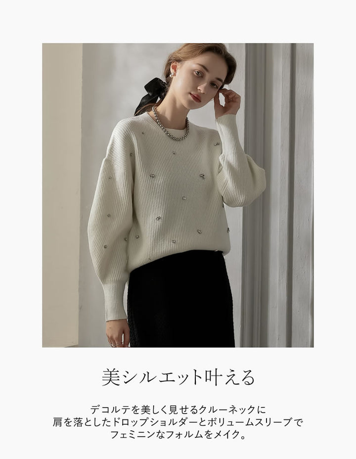 デコルテを美しく見せるクルーネックに、肩を落としたドロップショルダーとボリュームスリーブが女性らしいフォルムに。身頃と袖前面にちりばめられたビジューが、MEISMらしいポイント。さまざまな形のラインストーンが光を反射し、アクセサリーなしでも華やかな印象を与えます。袖口のリブはやや長めに設定し、袖のボリューム感をより際立たせるようデザインしました。