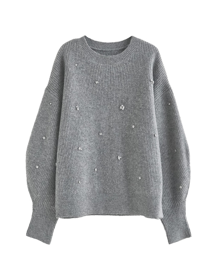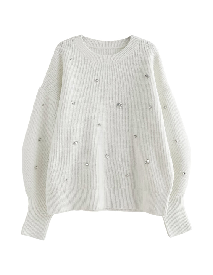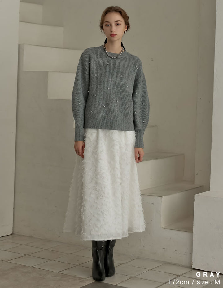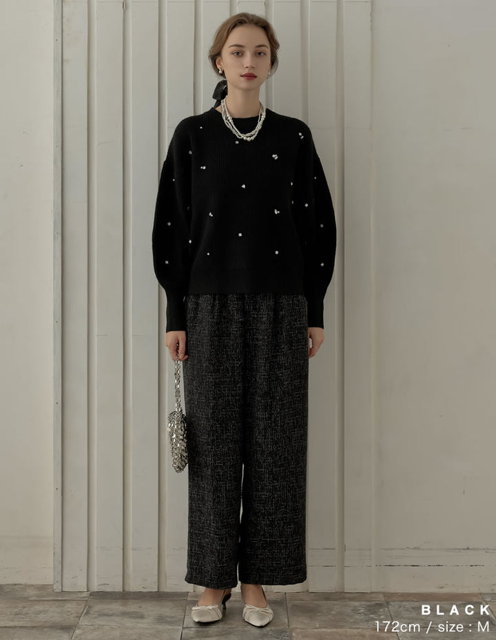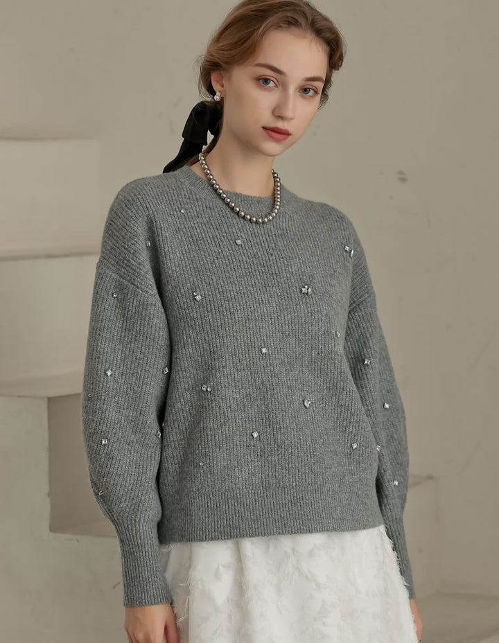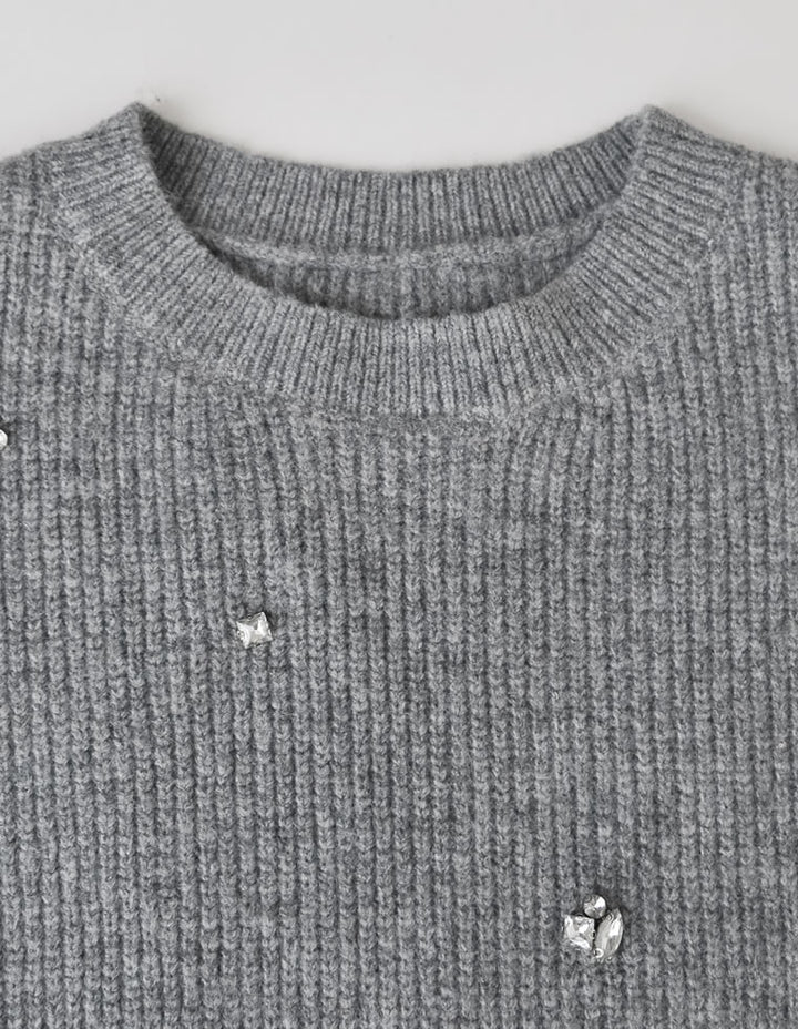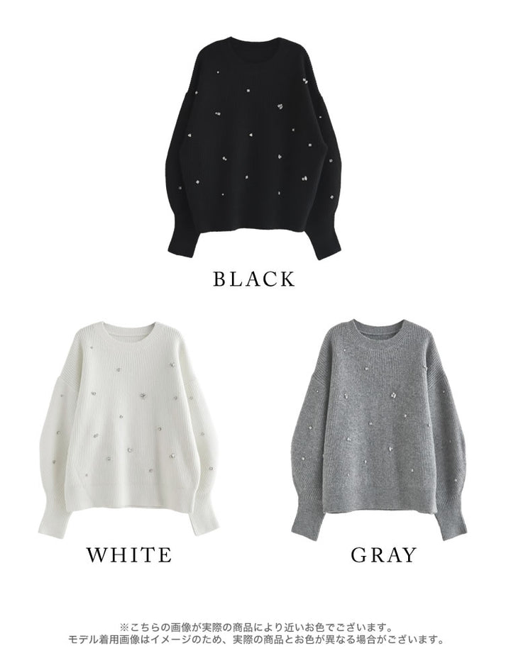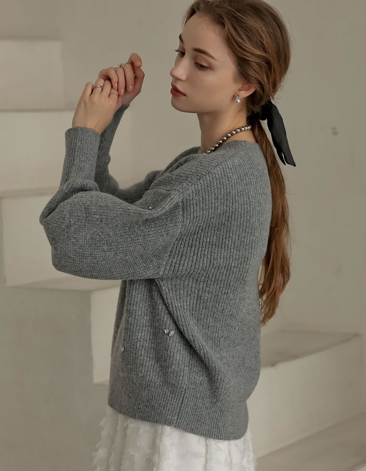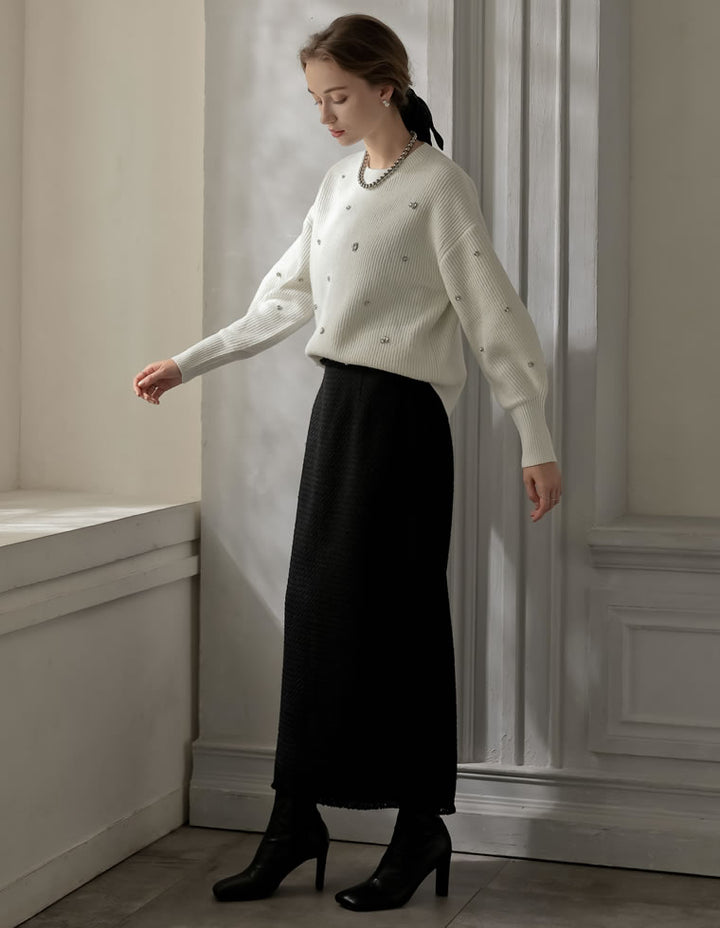 デコルテを美しく見せるクルーネックに、肩を落としたドロップショルダーとボリュームスリーブが女性らしいフォルムに。身頃と袖前面にちりばめられたビジューが、MEISMらしいポイント。さまざまな形のラインストーンが光を反射し、アクセサリーなしでも華やかな印象を与えます。袖口のリブはやや長めに設定し、袖のボリューム感をより際立たせるようデザインしました。