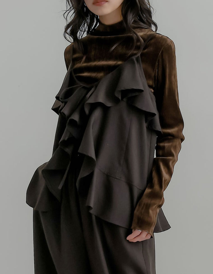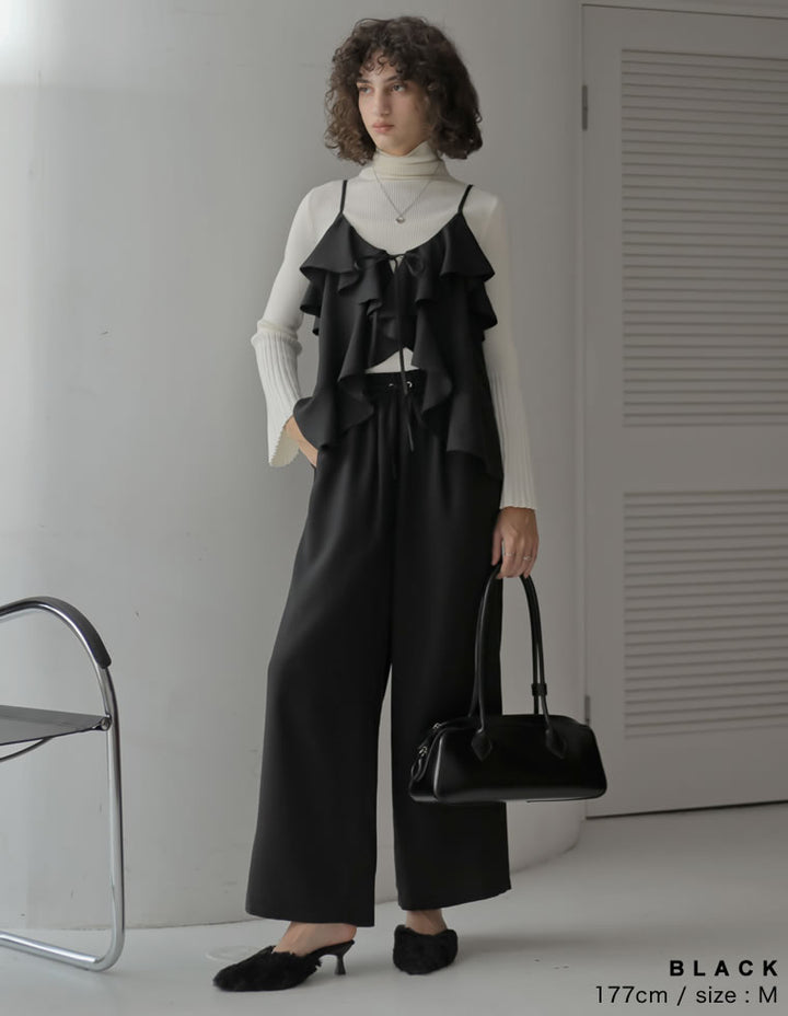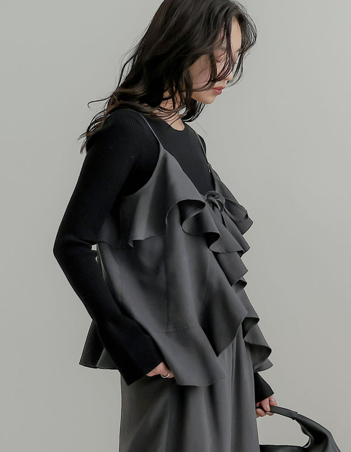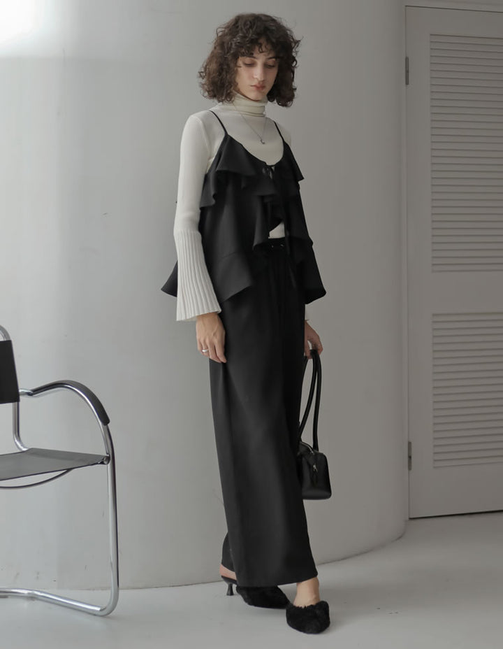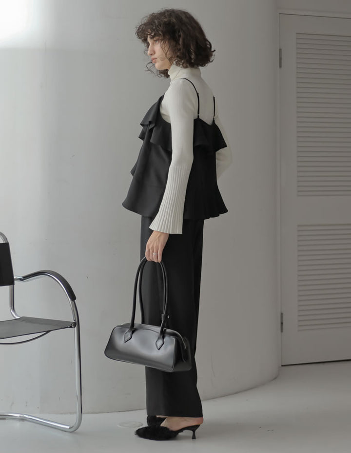 構築的なフリルデザインが、スタイリングに立体感を生み出し、華やかなコーディネートに仕上がります。