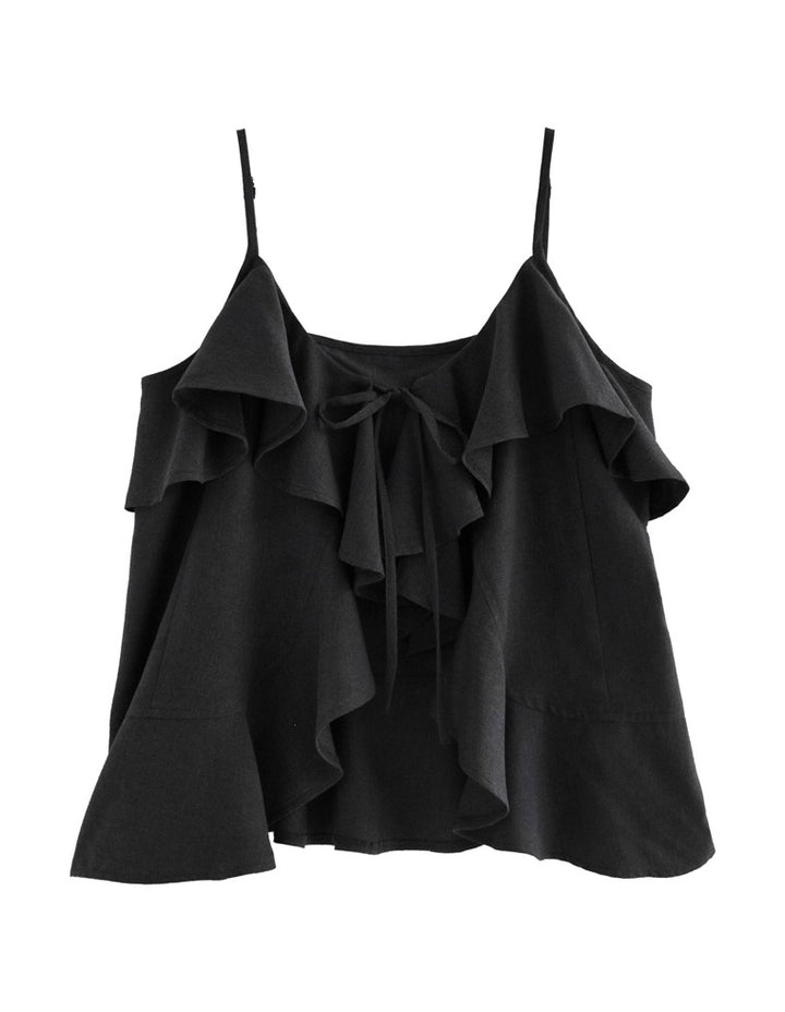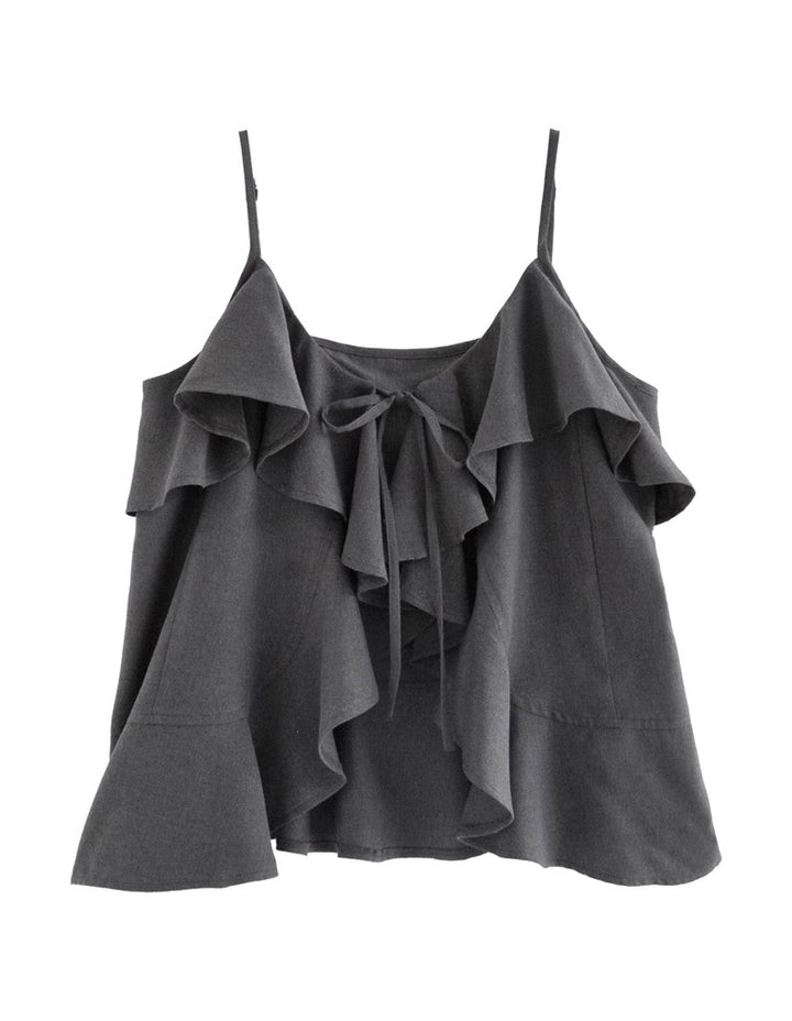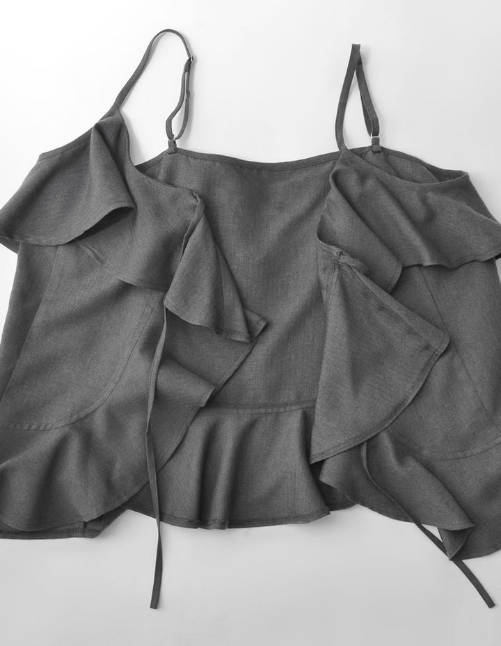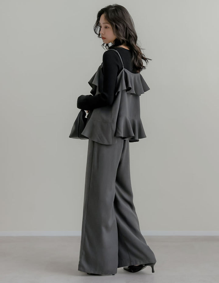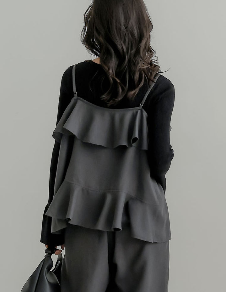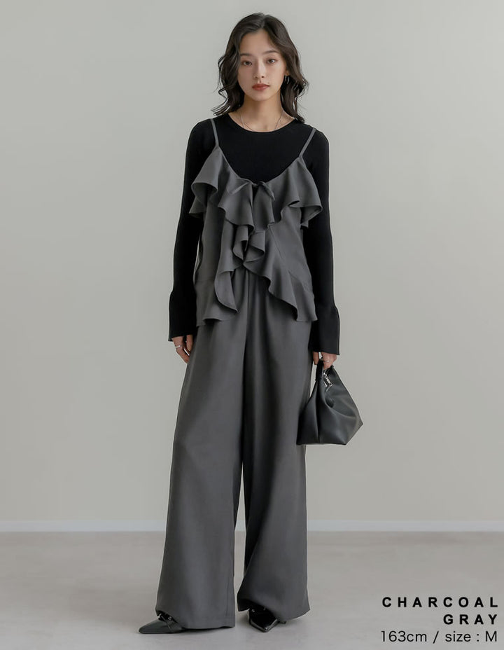 構築的なフリルデザインが、スタイリングに立体感を生み出し、華やかなコーディネートに仕上がります。