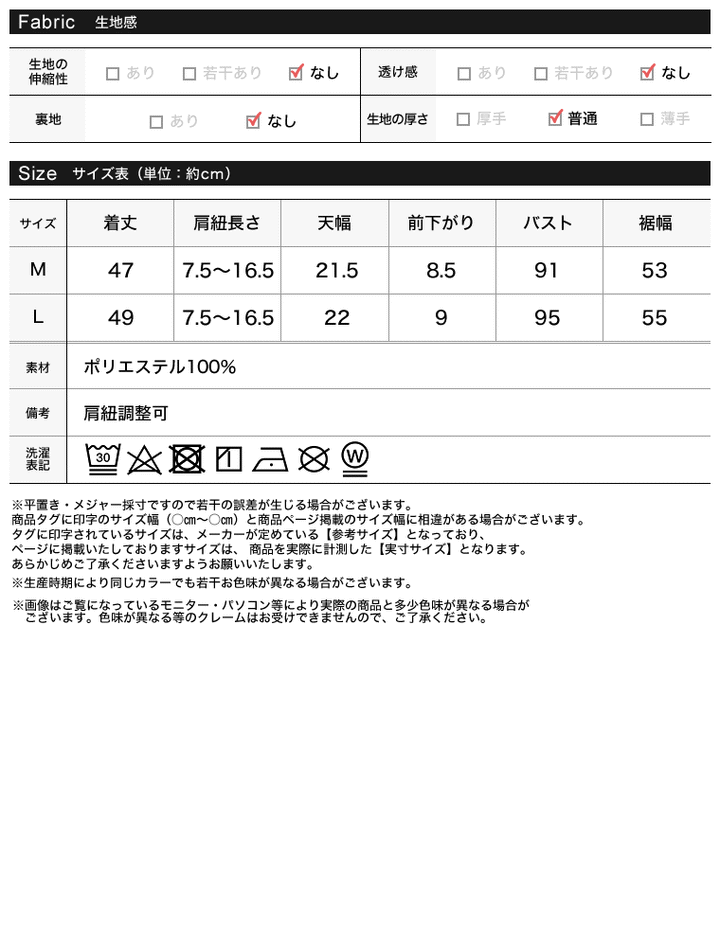 | サイズ | 着丈 | 肩紐長さ | 天幅 | 前下がり | バスト | 裾幅 |