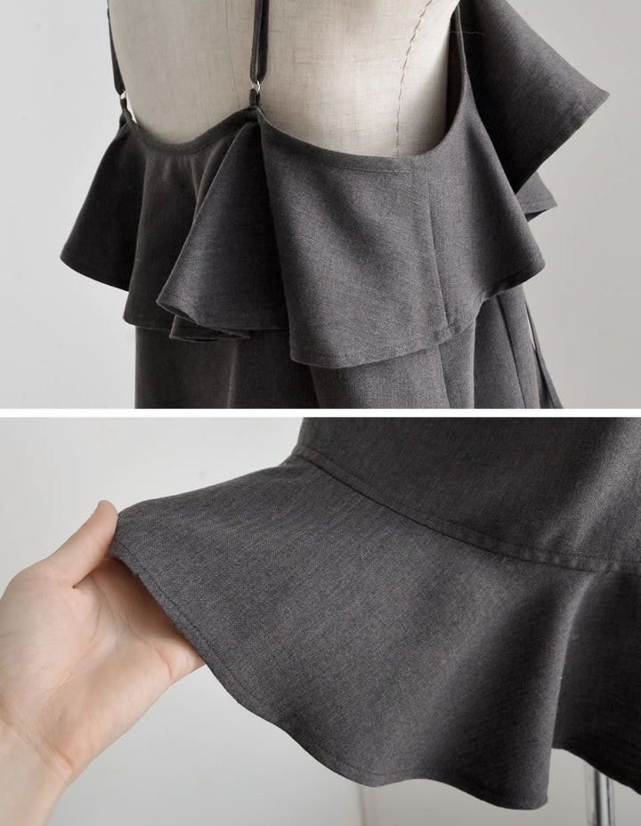 マニッシュなヘリンボーン素材に、フリルを施したビスチェ。
