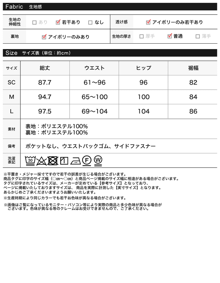 | サイズ | 総丈 | ウエスト | ヒップ | 裾幅 |