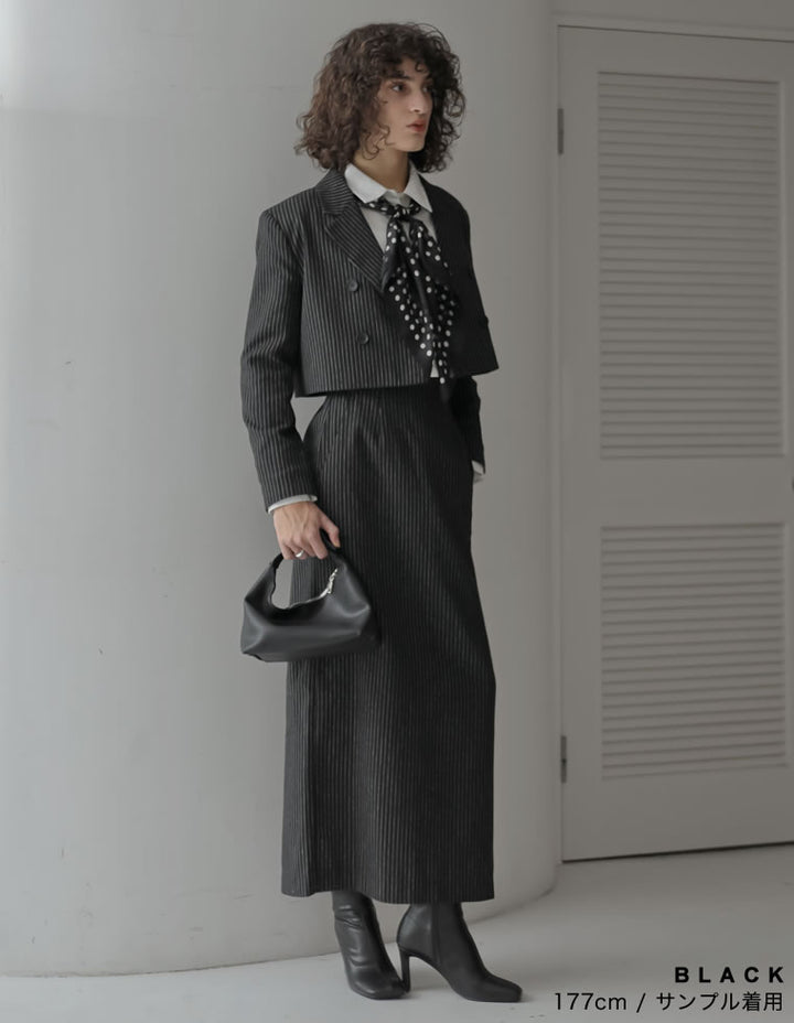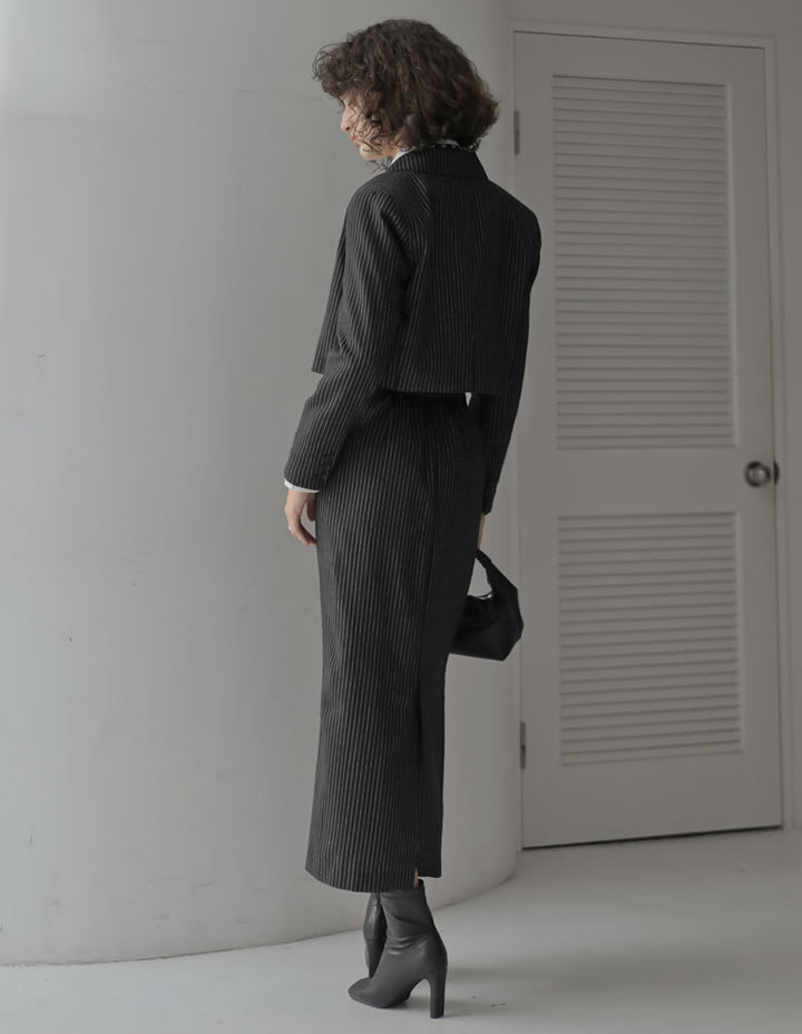 タイトなシルエットは女性らしさを際立たせつつ、縦に走るストライプが視覚的にスタイルを引き締めてくれます。