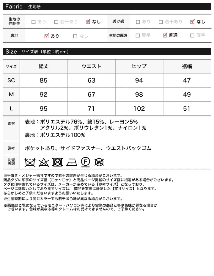 | サイズ | 総丈 | ウエスト | ヒップ | 裾幅 |