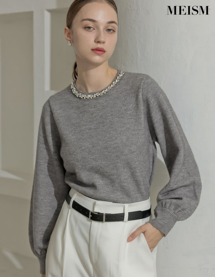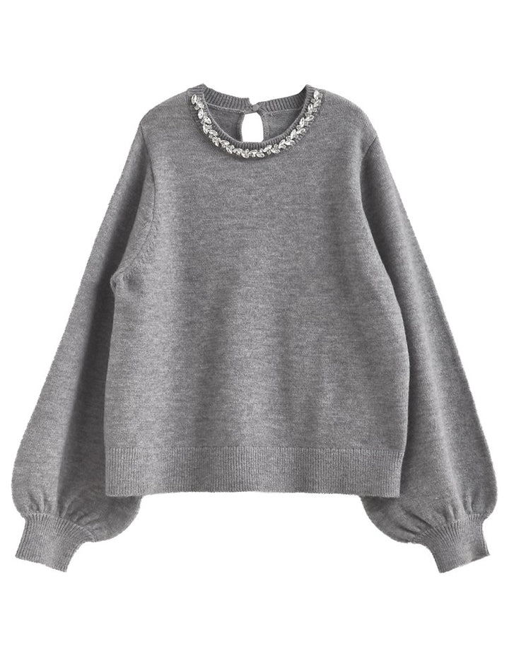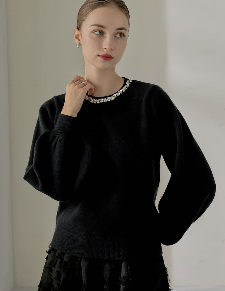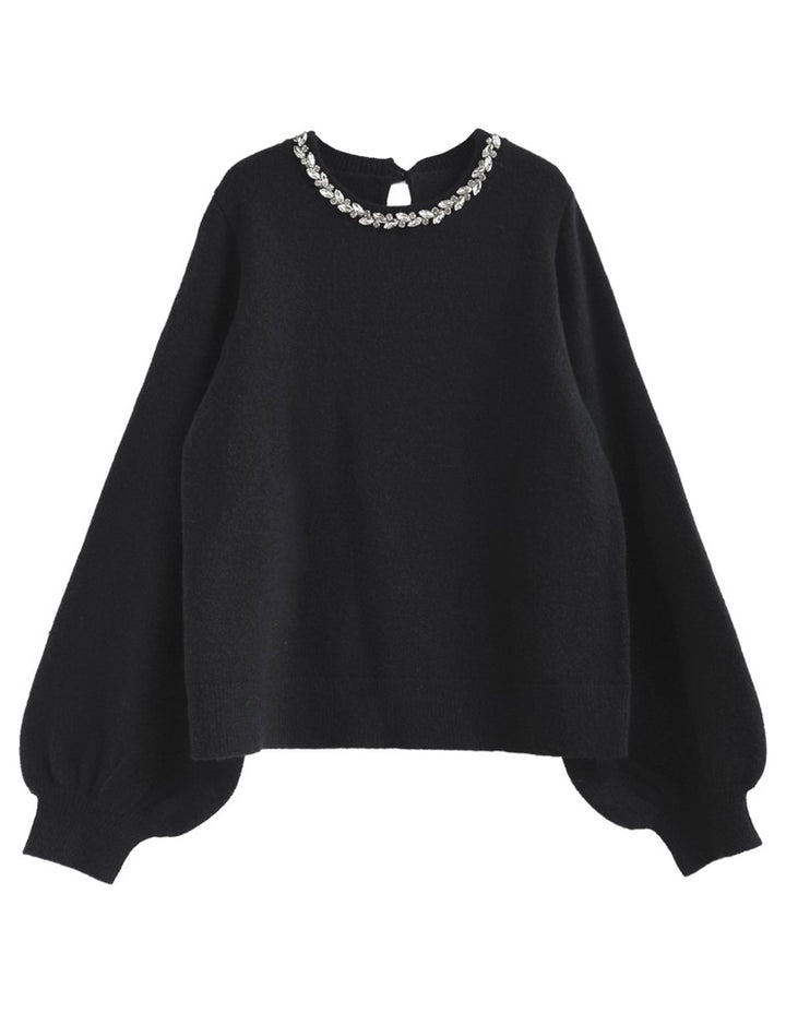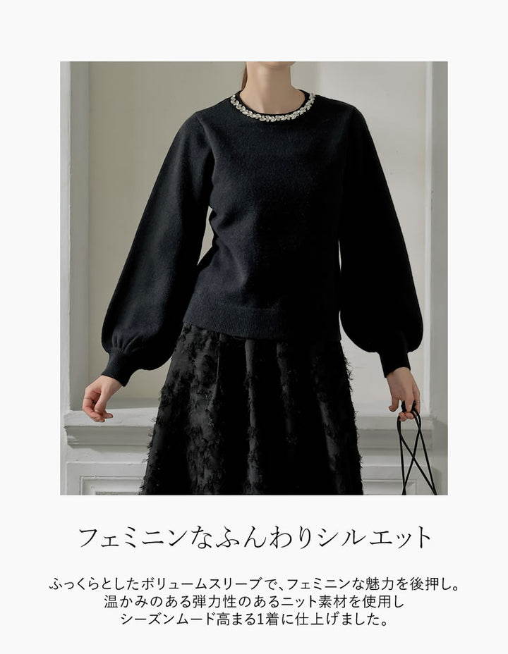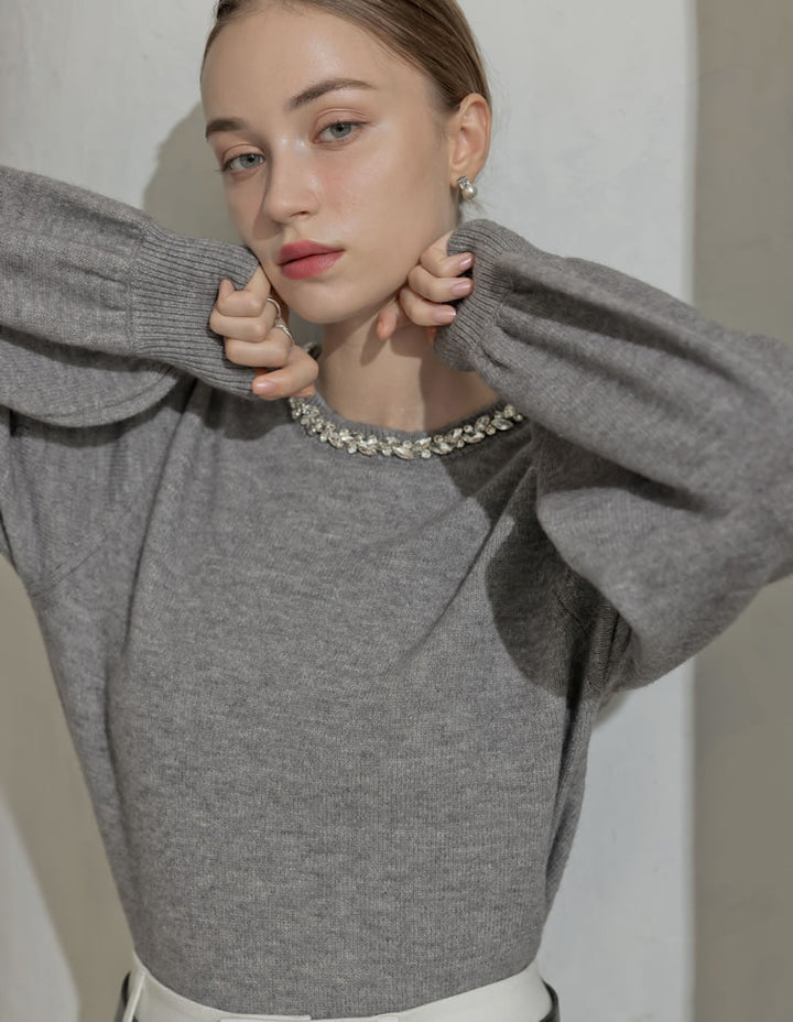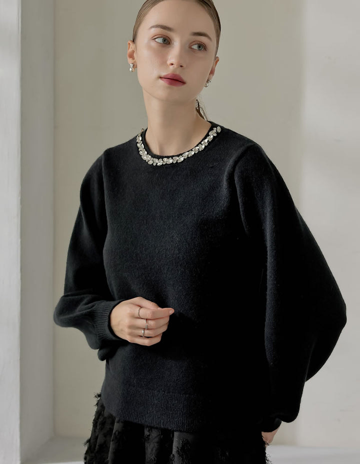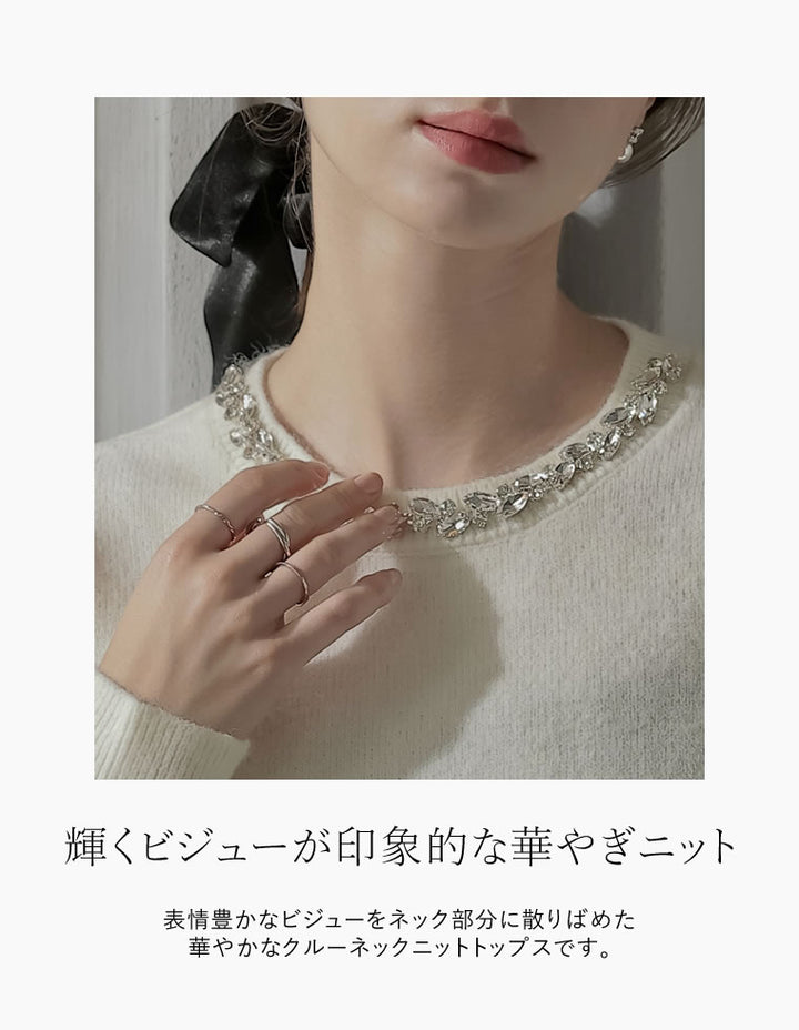 表情豊かなビジューをネック部分に散りばめた、華やかなクルーネックニット。