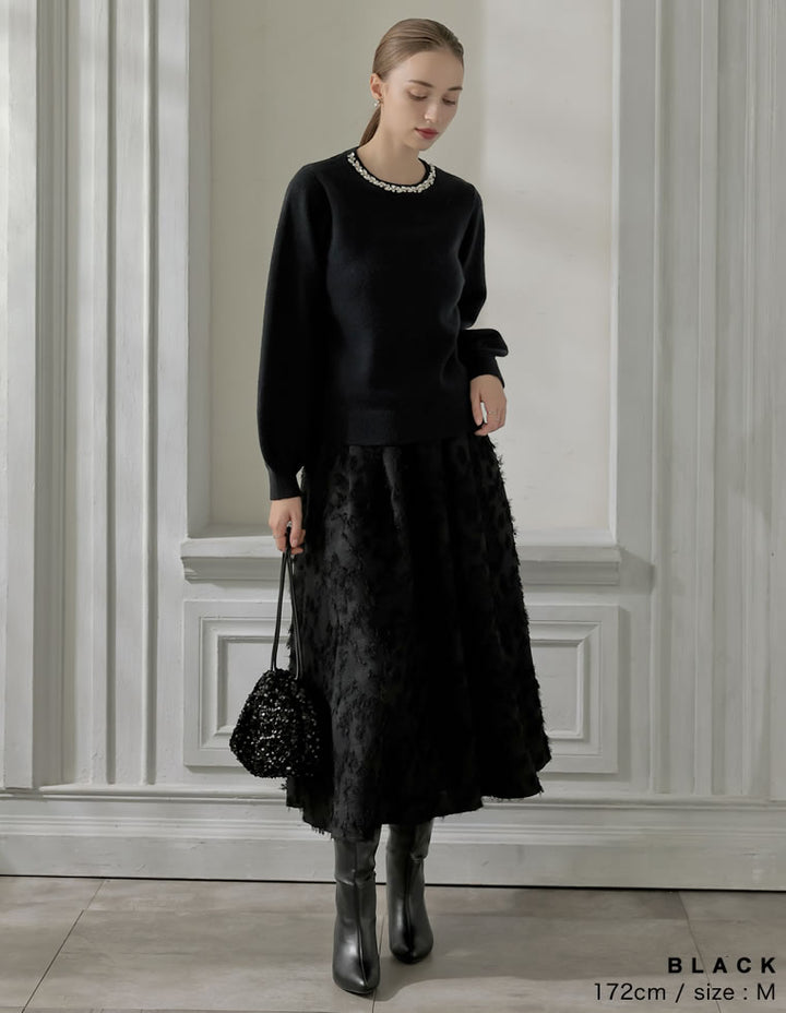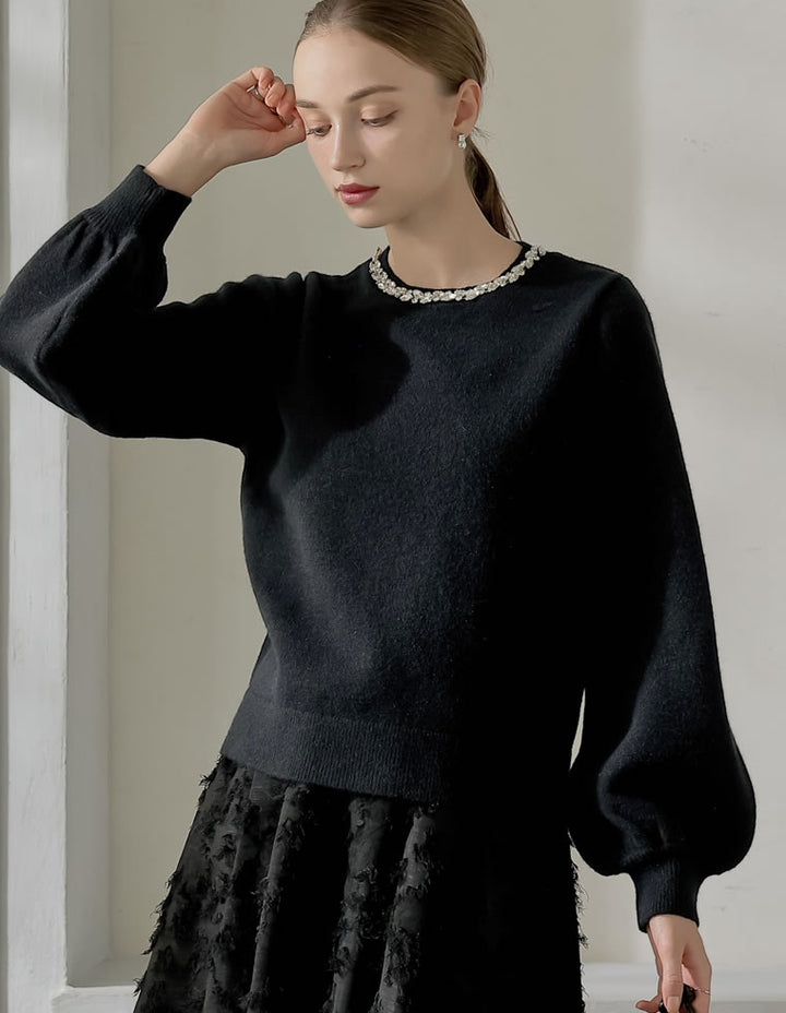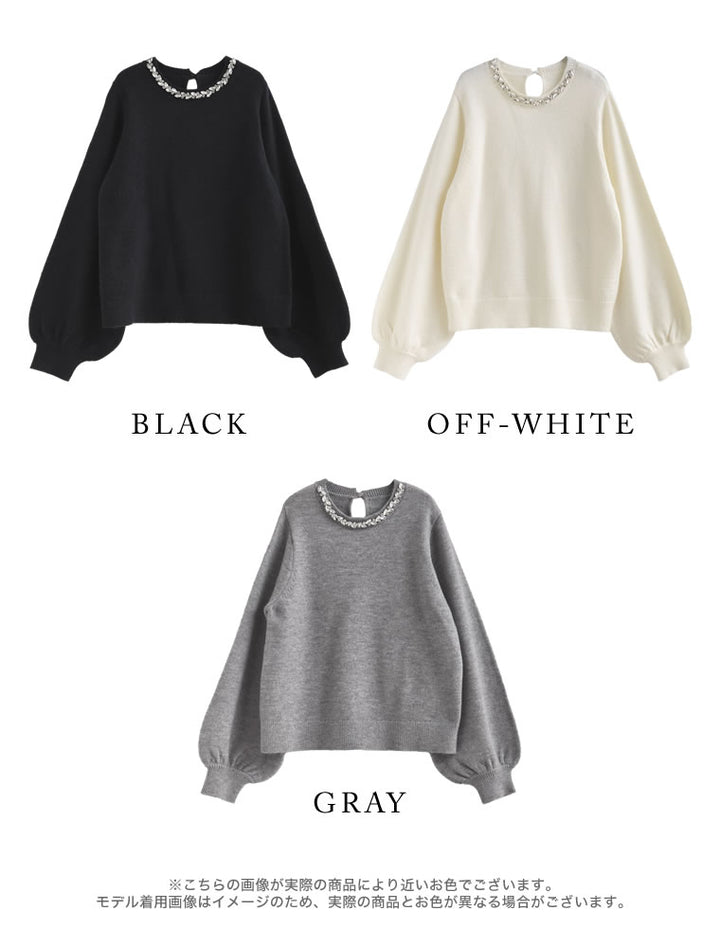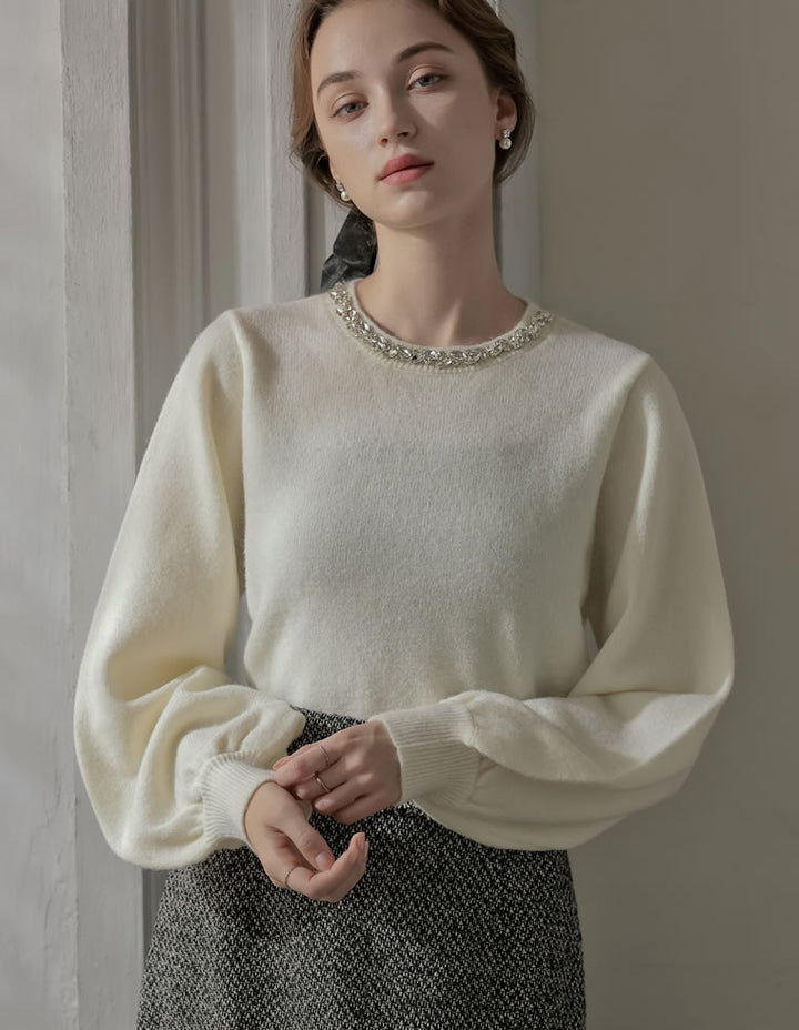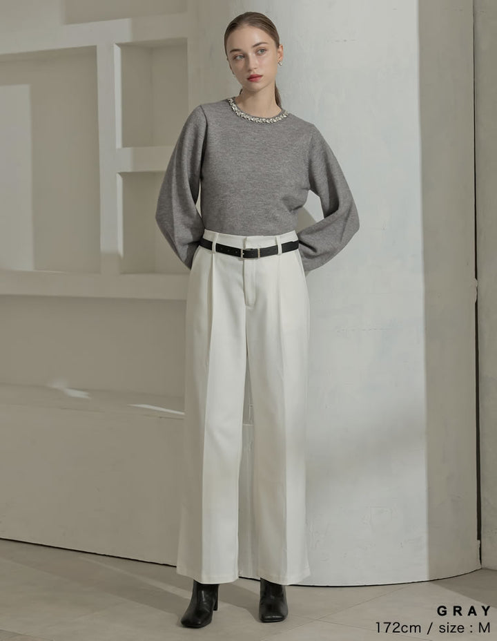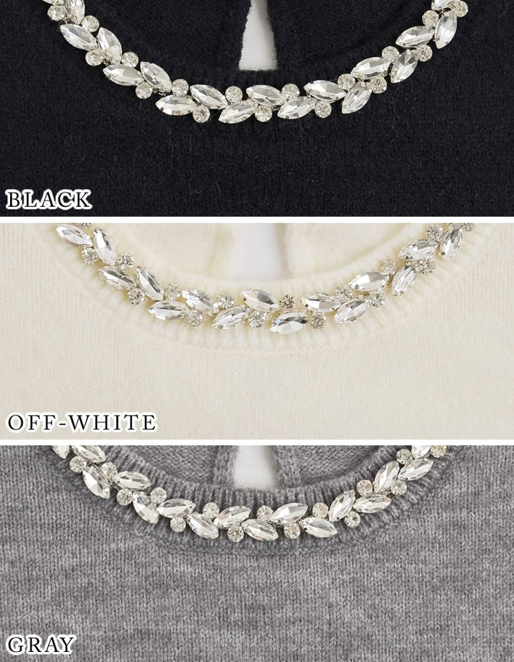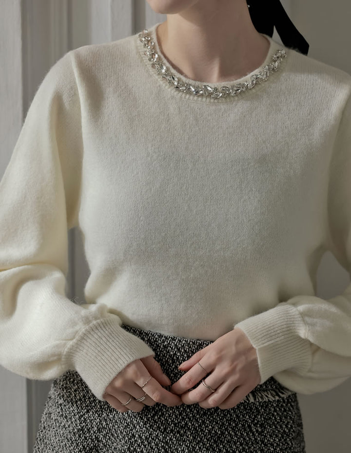 表情豊かなビジューをネック部分に散りばめた、華やかなクルーネックニット。