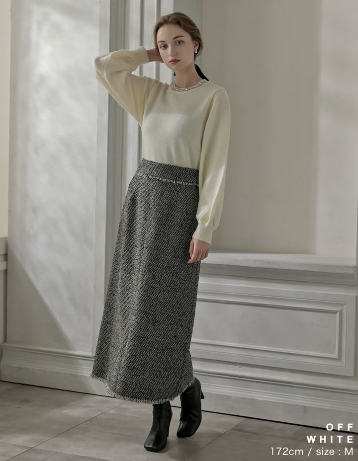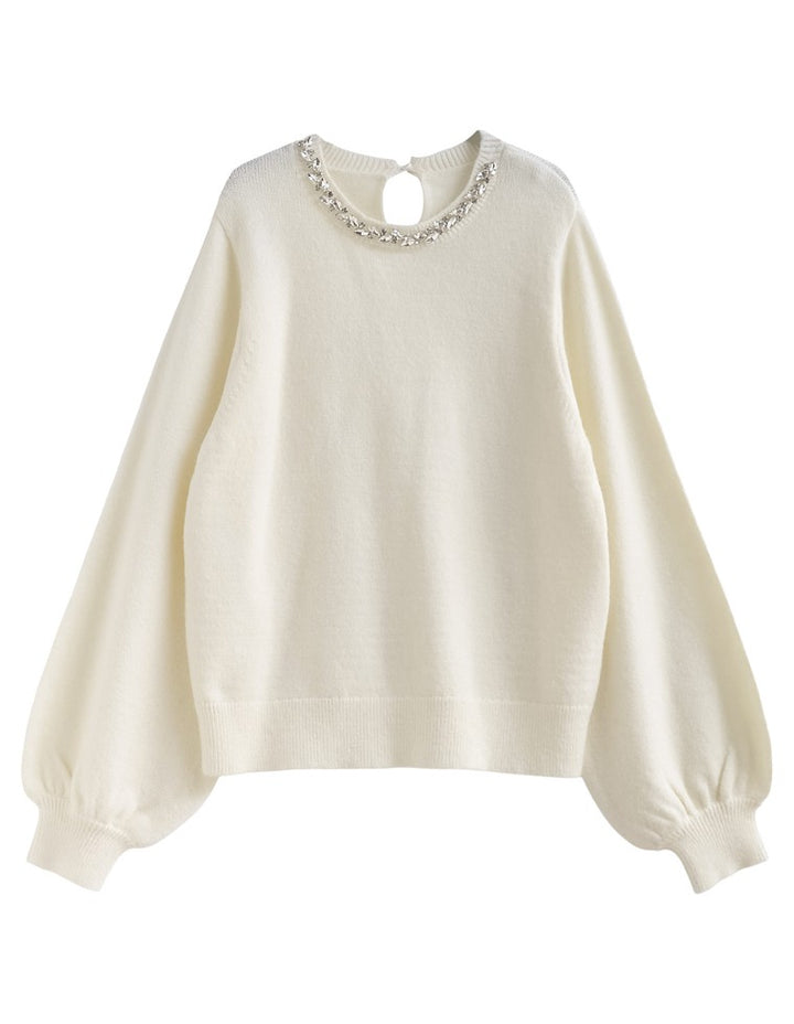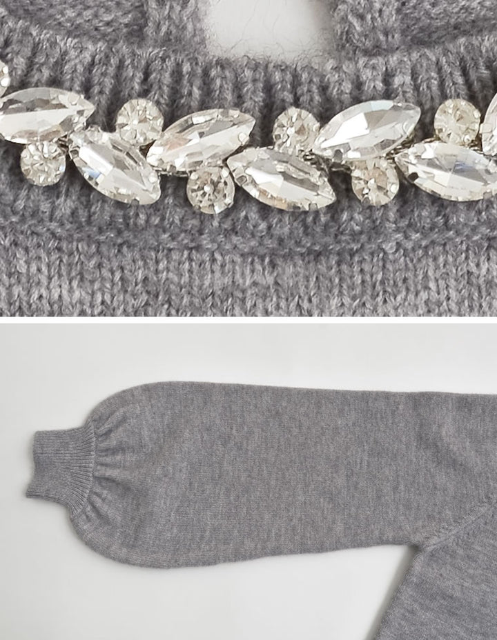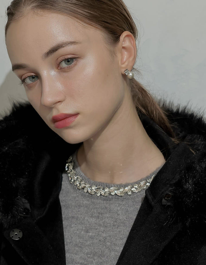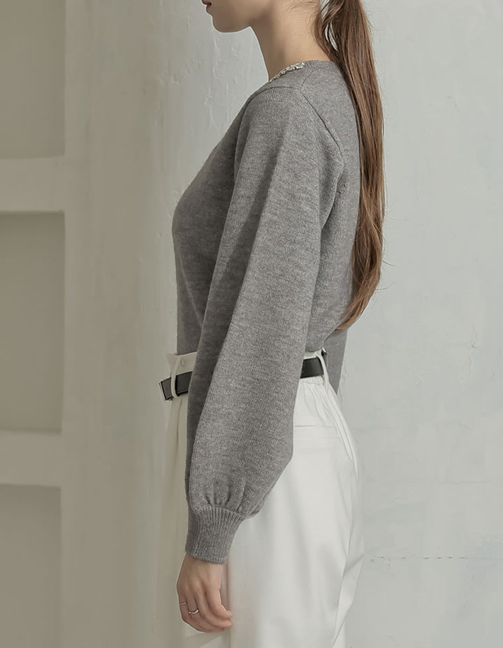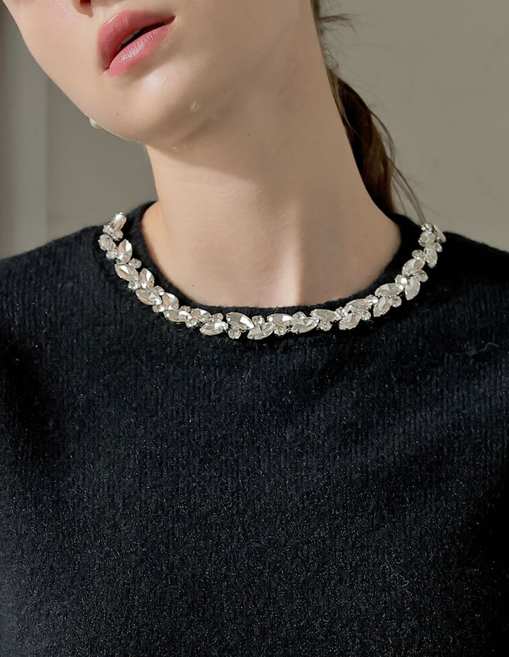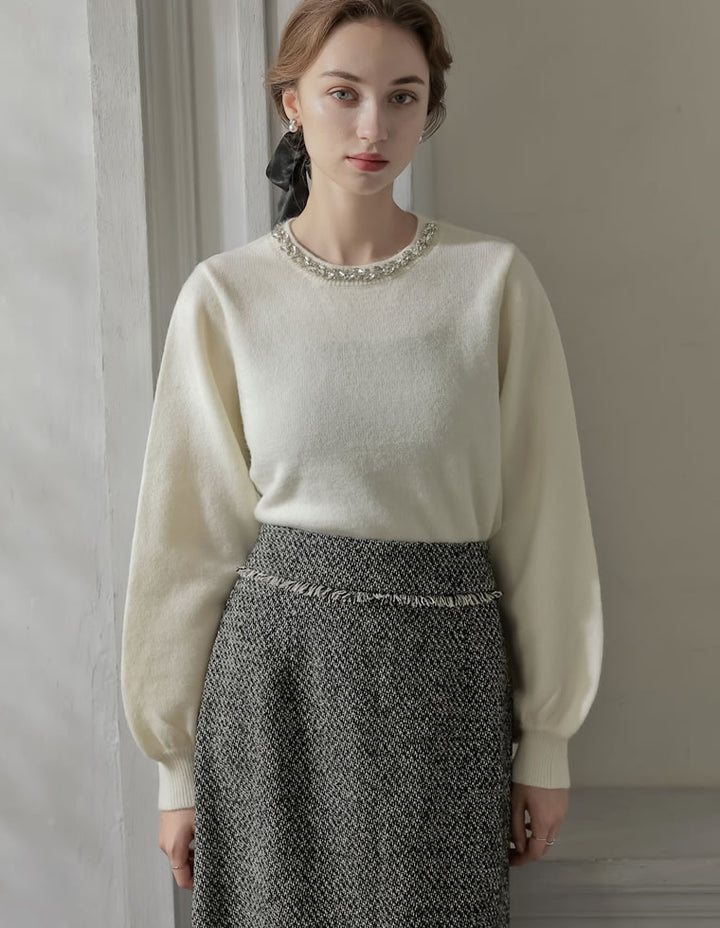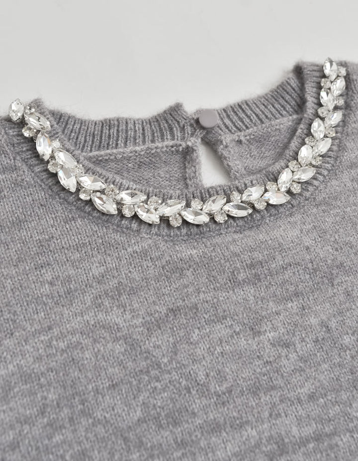 表情豊かなビジューをネック部分に散りばめた、華やかなクルーネックニット。