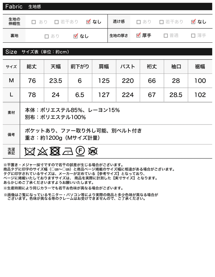 ※洗濯やクリーニングの際、多少色落ちすることがありますので、単品洗い、単品クリーニングしてください。洗剤の量が多いと、色落ちの度合いが高くなりますのでご注意ください。