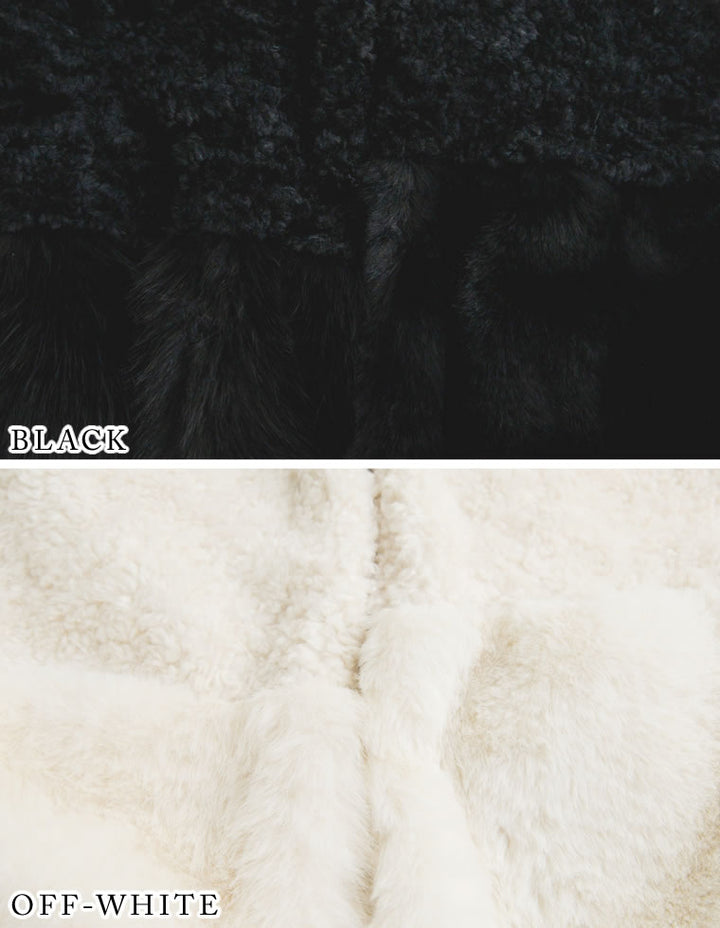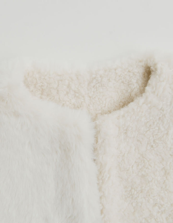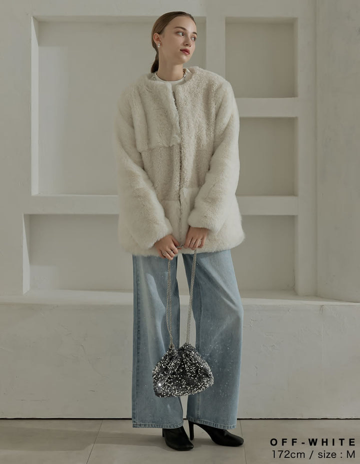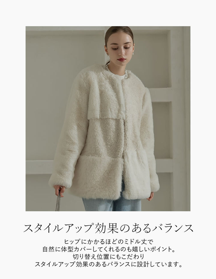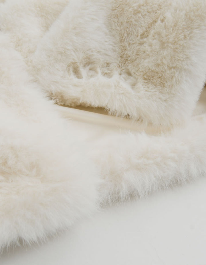 毛足の長さが異なるフェイクファーと、ふんわりとしたボア素材をミックスし、同色トーンでまとめることで、上品で洗練された印象に仕上げました。