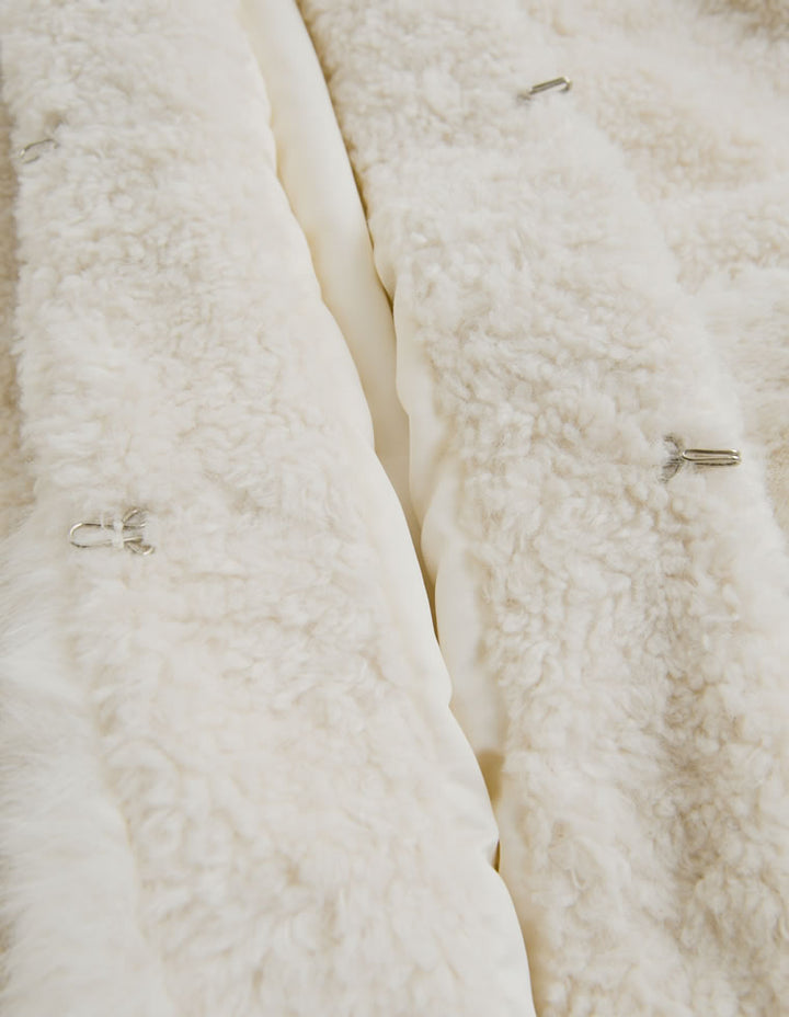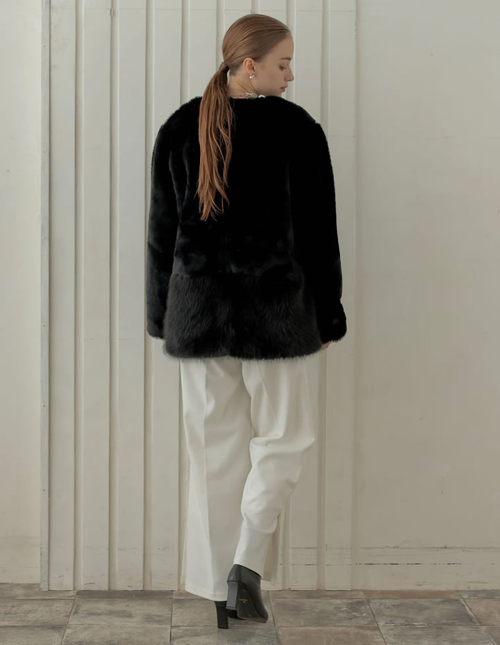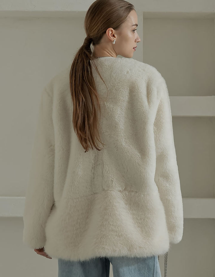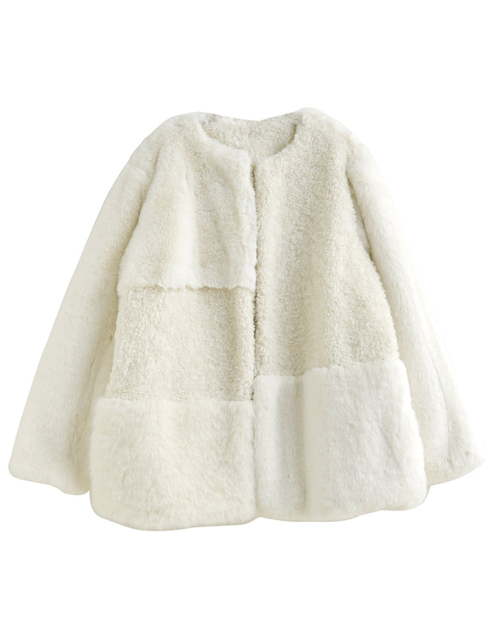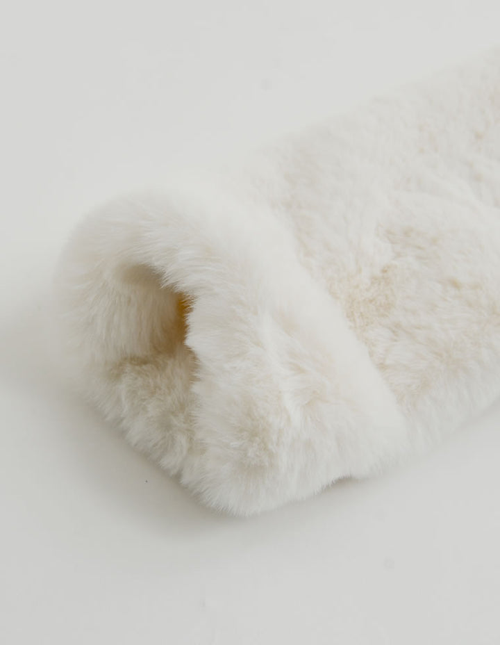 毛足の長さが異なるフェイクファーと、ふんわりとしたボア素材をミックスし、同色トーンでまとめることで、上品で洗練された印象に仕上げました。