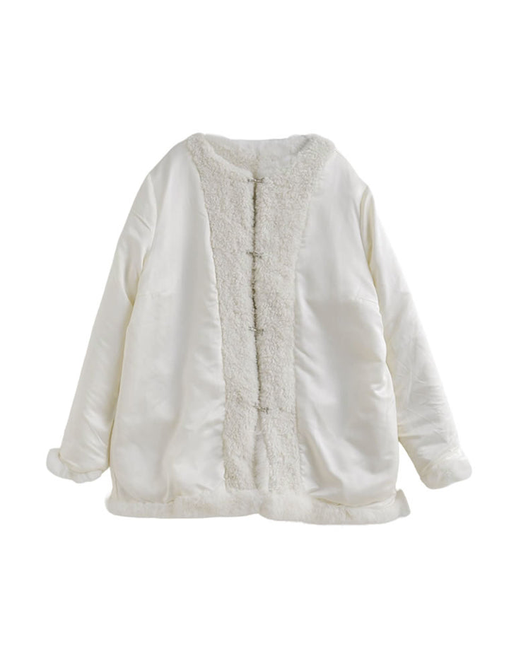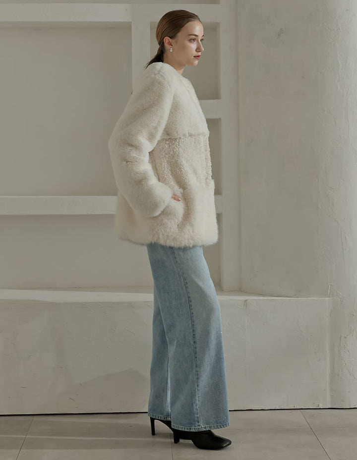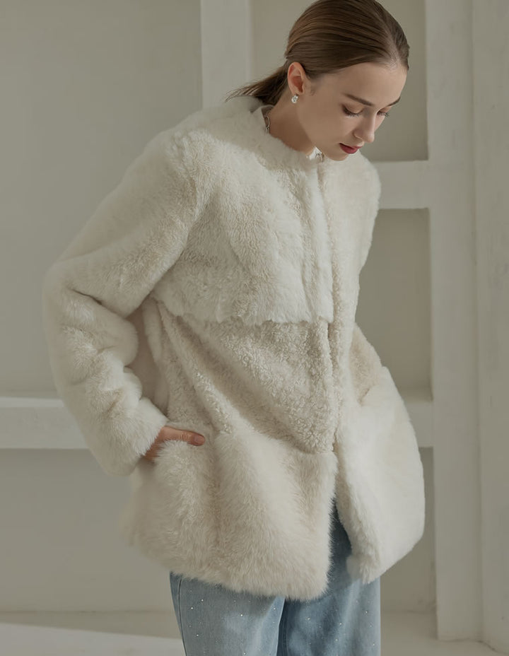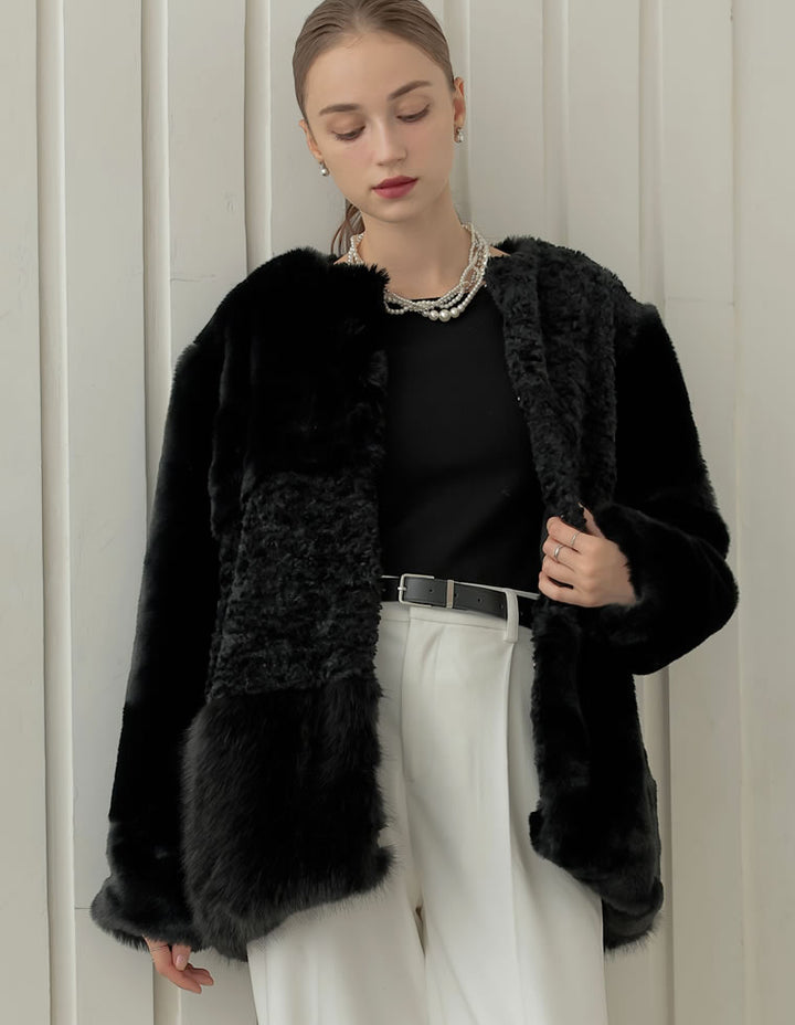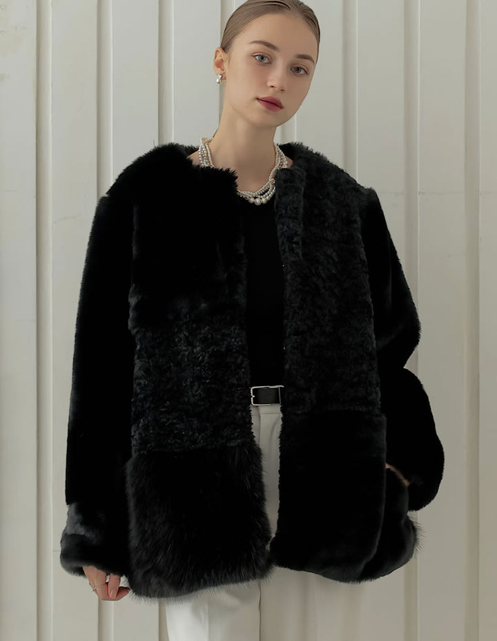 3種類の異素材を組み合わせた、贅沢なパッチワークデザインが魅力のノーカラーミドルコート。