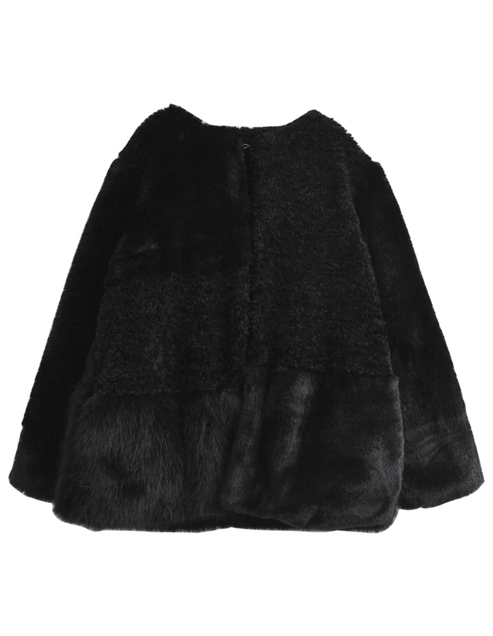 毛足長めと中くらいの毛足のフェイクファー、ボアの3種類の素材をパッチワーク風に切り替えて使用した素材