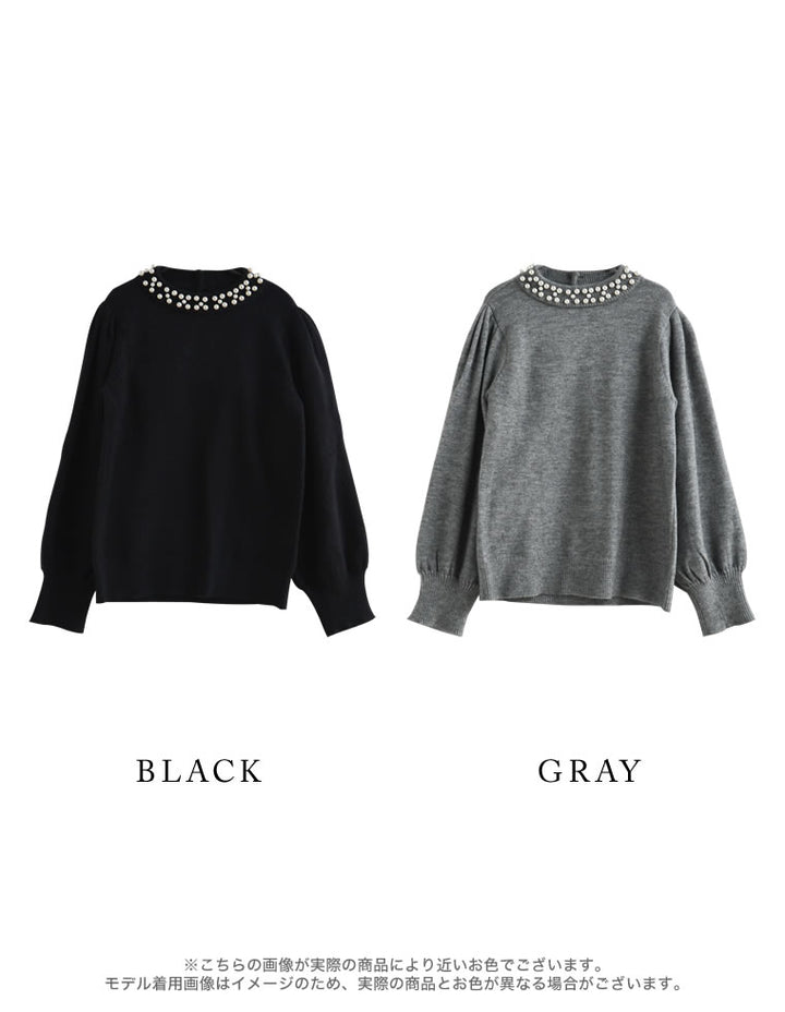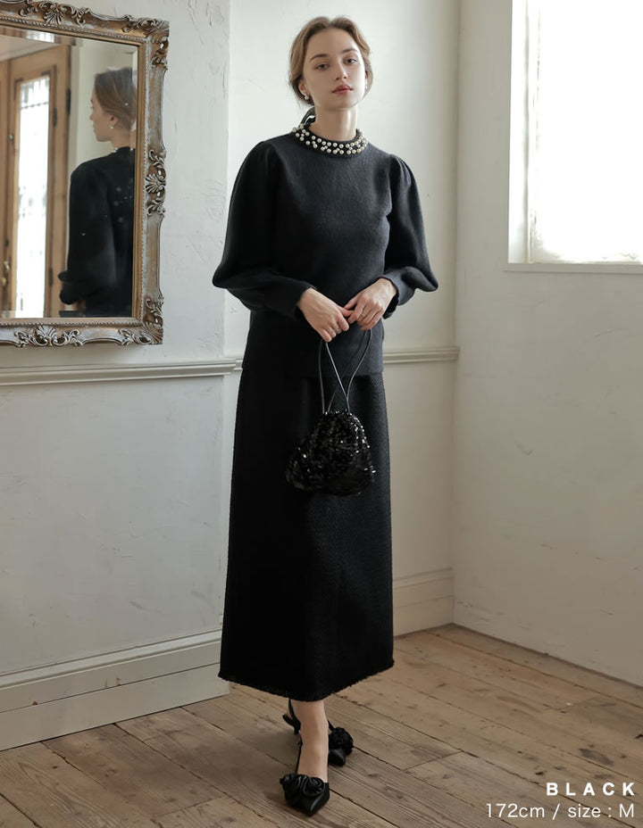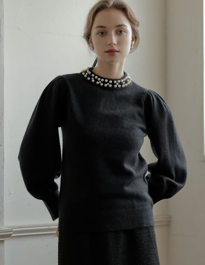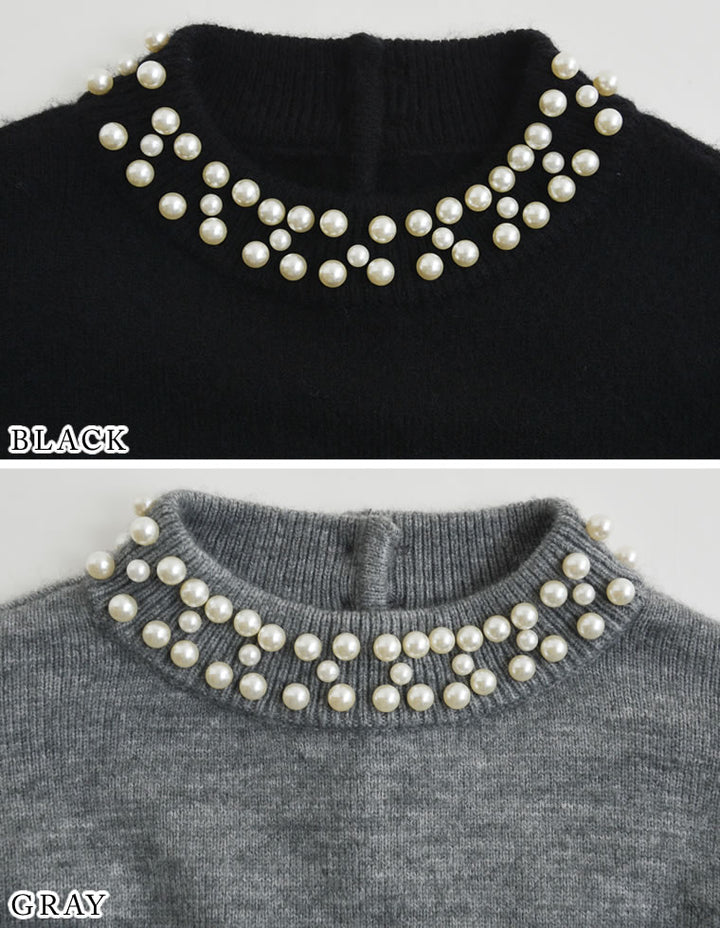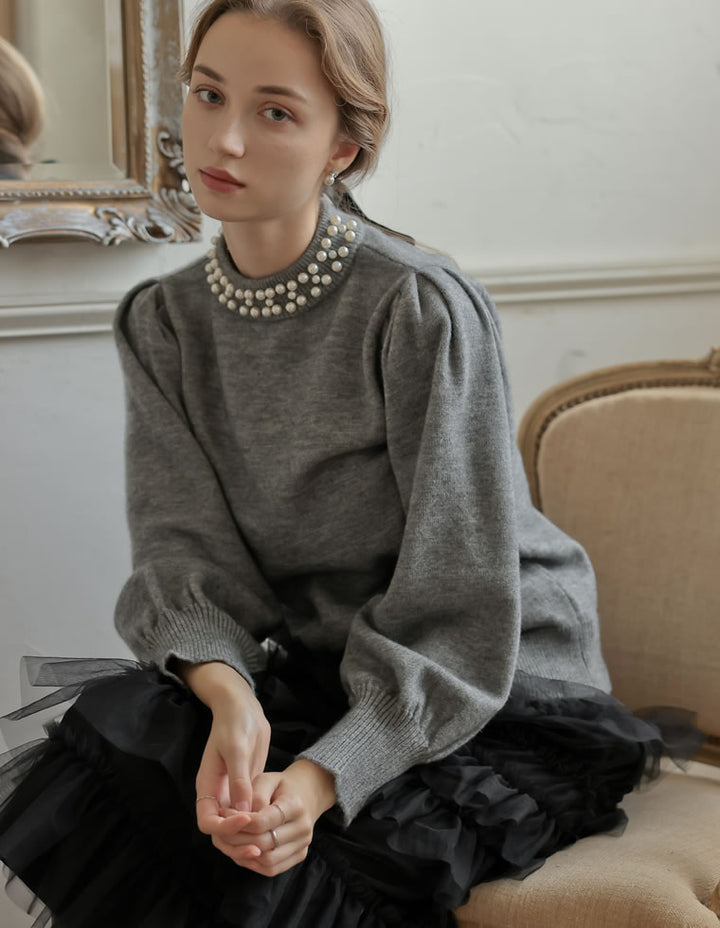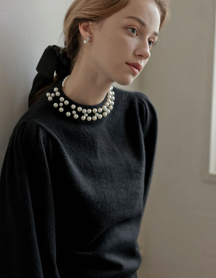 襟ぐりにあしらわれた繊細なパールが顔周りを華やかに演出。