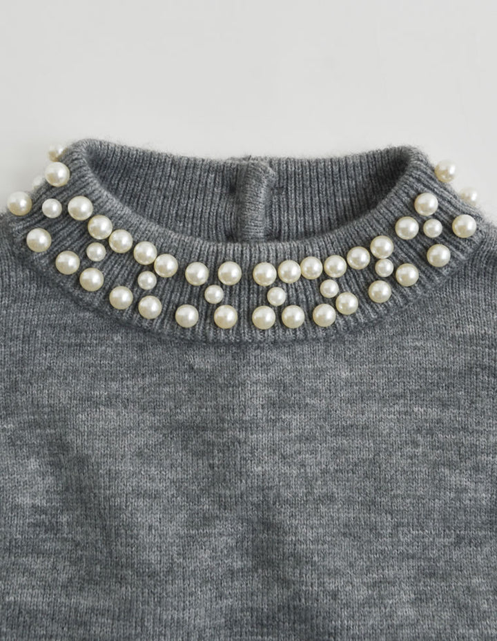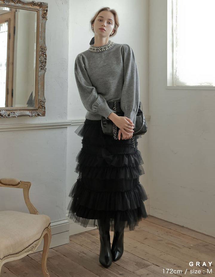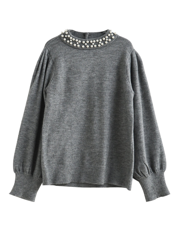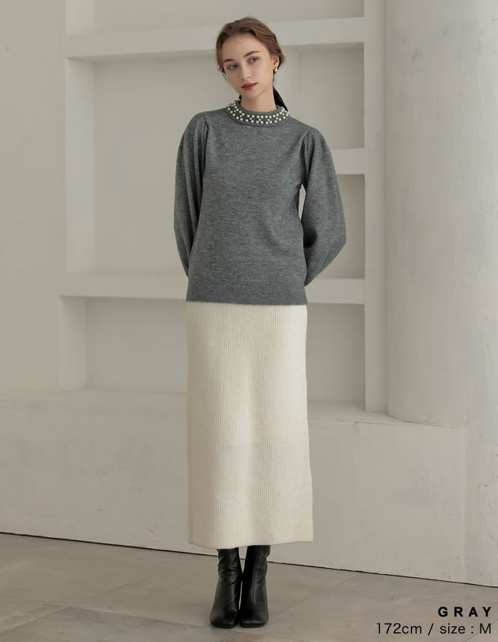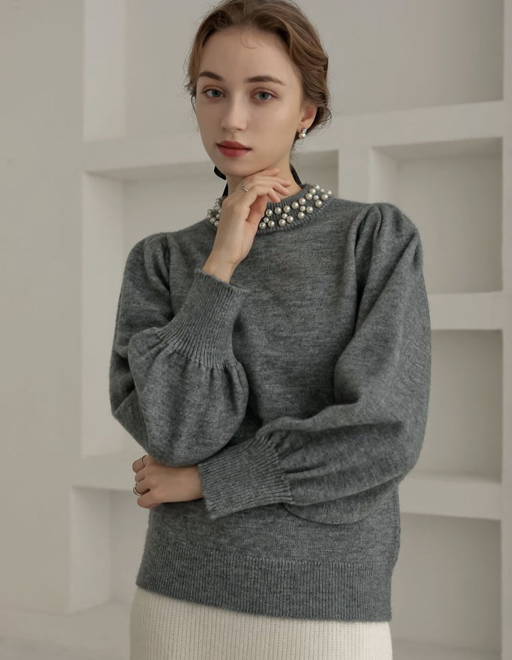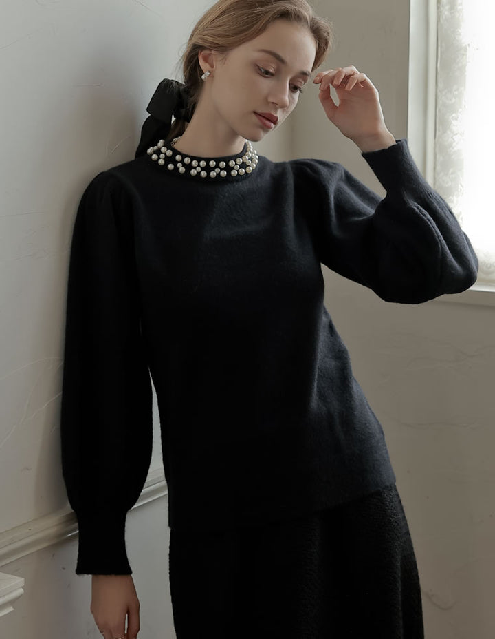 襟ぐりにあしらわれた繊細なパールが顔周りを華やかに演出。