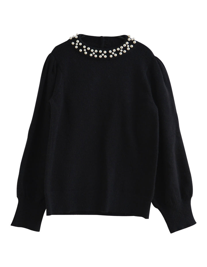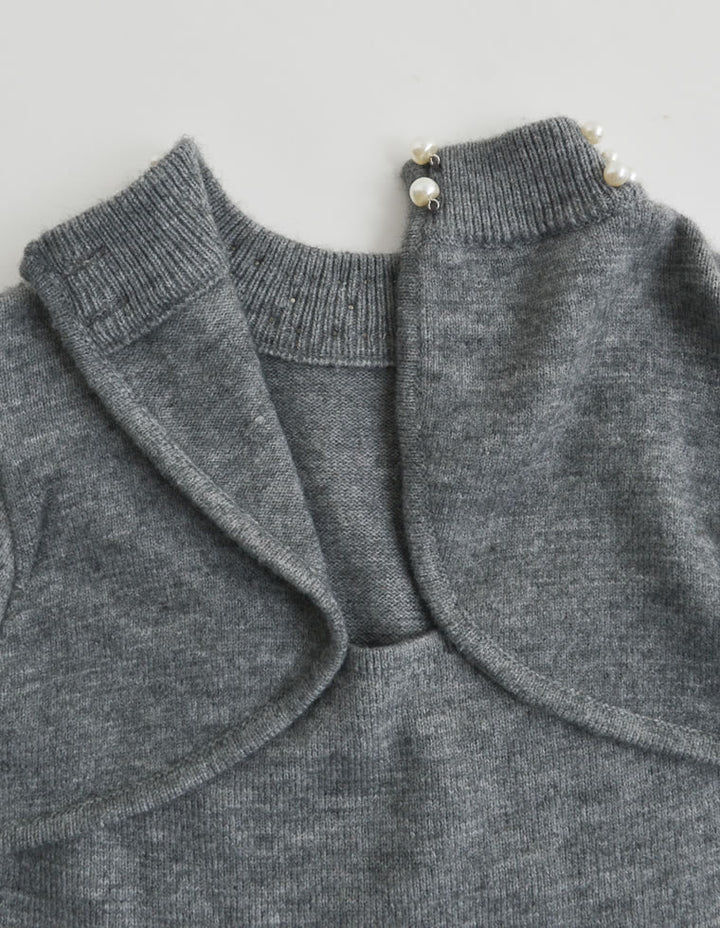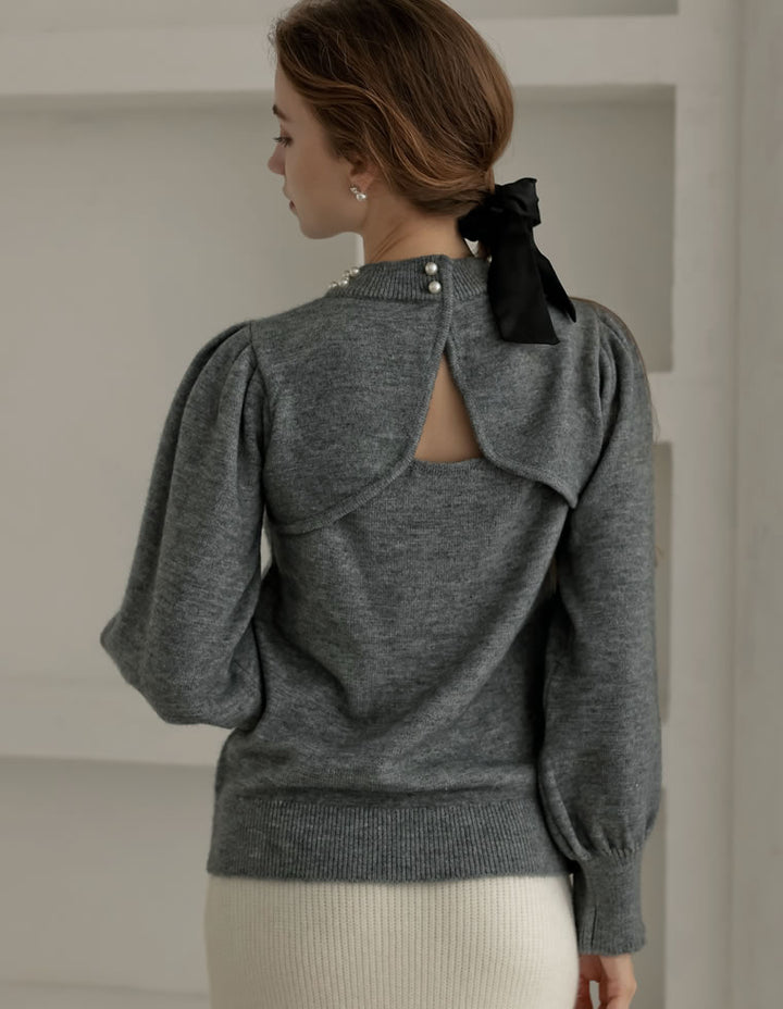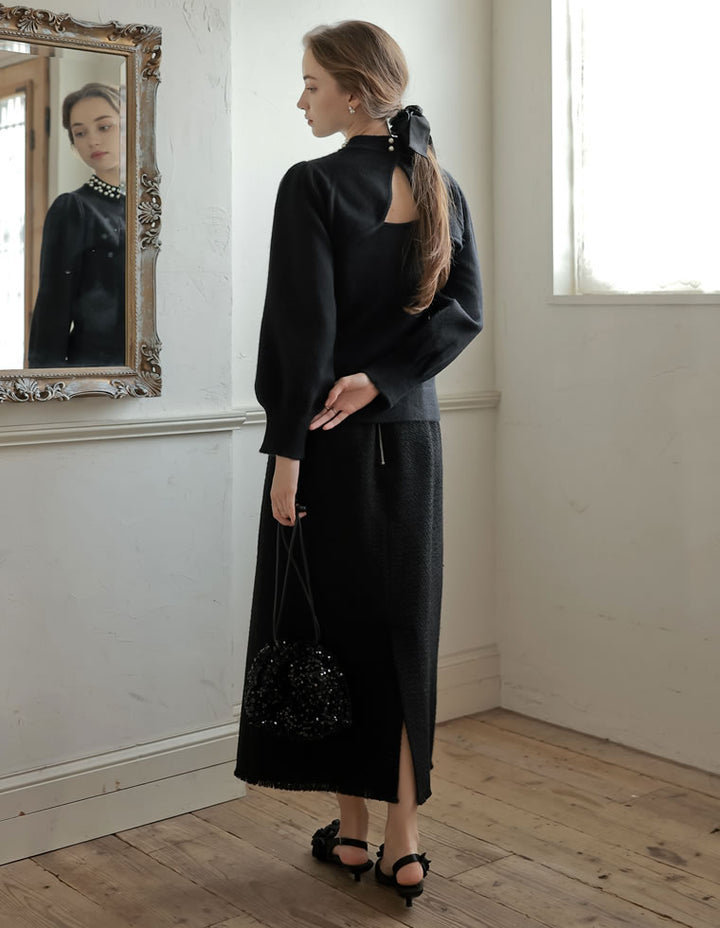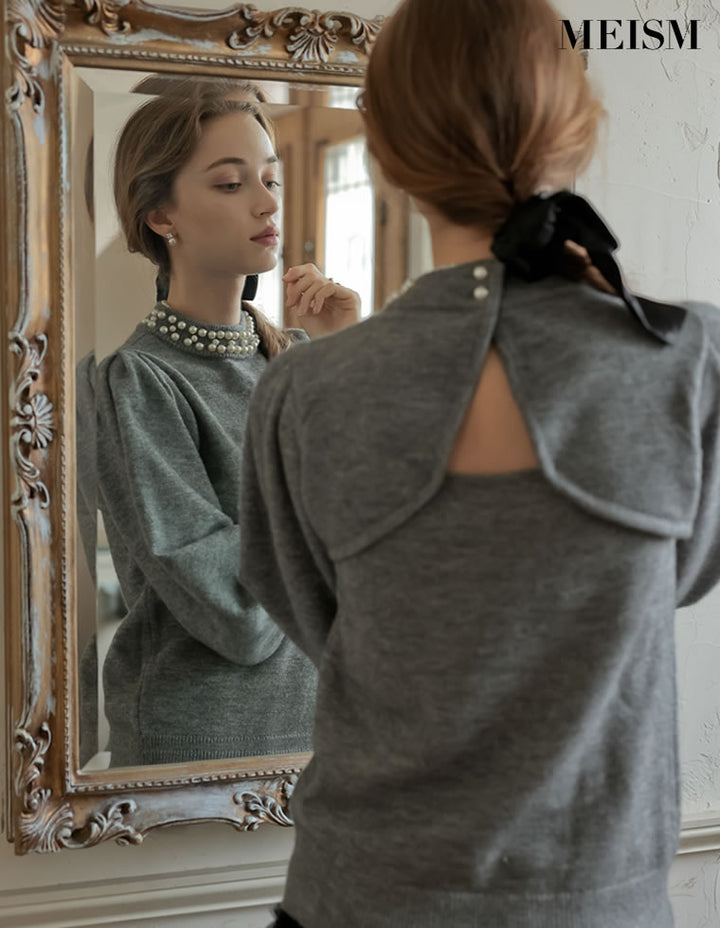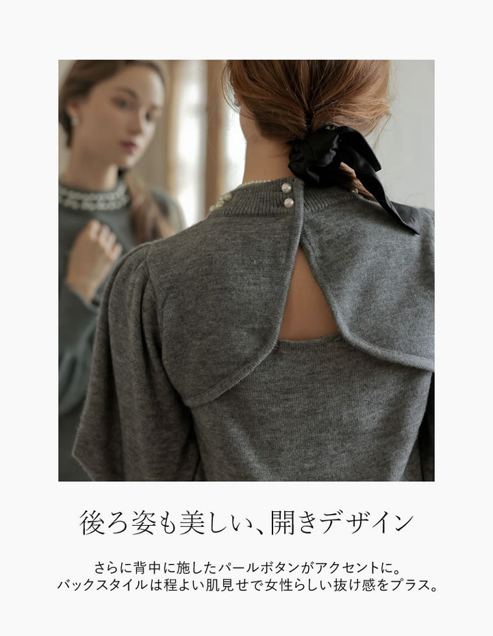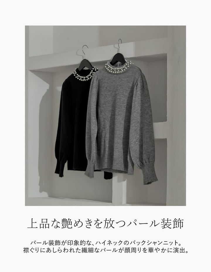 上品な艶めきを放つパール装飾が印象的な、ハイネックのバックシャンニット。
