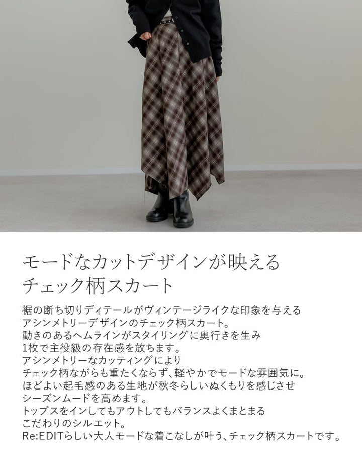 裾の断ち切りディテールがヴィンテージライクな印象を与える、アシンメトリーデザインのチェック柄スカート。動きのあるヘムラインがスタイリングに奥行きを生み、1枚で主役級の存在感を放ちます。アシンメトリーなカッティングにより、チェック柄ながらも重たくならず、軽やかでモードな雰囲気に。ほどよい起毛感のある生地が秋冬らしいぬくもりを感じさせ、シーズンムードを高めます。トップスをインしてもアウトしてもバランスよくまとまる、こだわりのシルエット。Re:EDITらしい大人モードな着こなしが叶う、チェック柄スカートです。