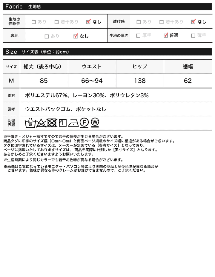 | サイズ | 総丈(後ろ中心) | ウエスト | ヒップ | 裾幅 |