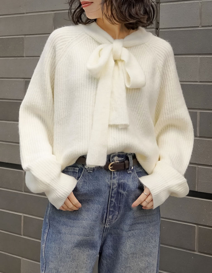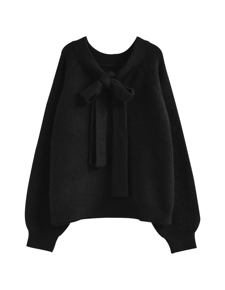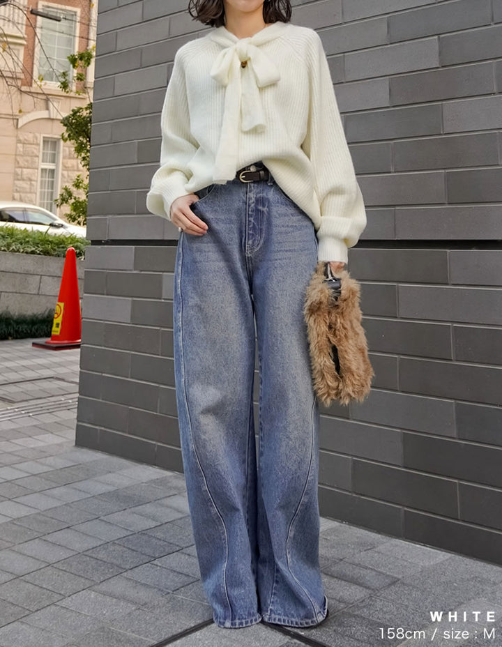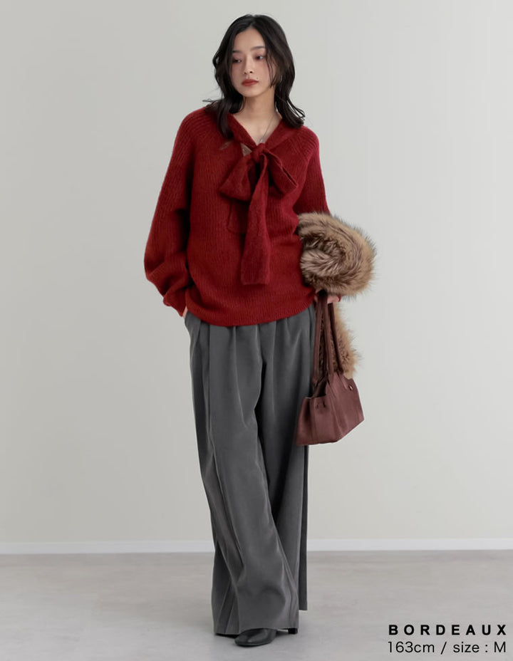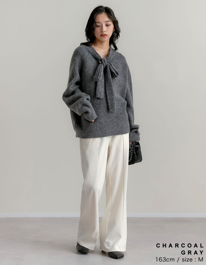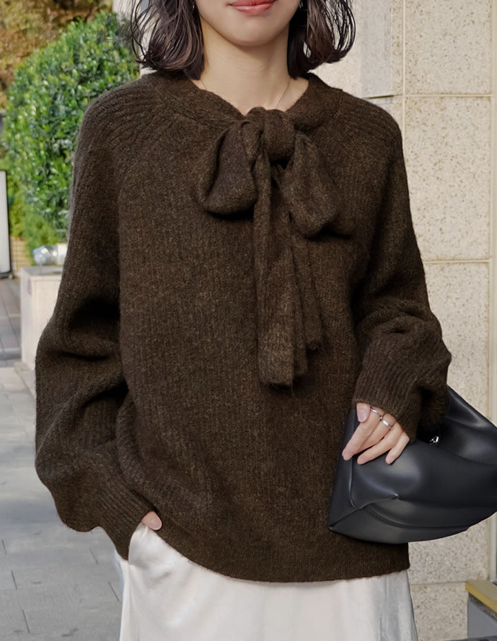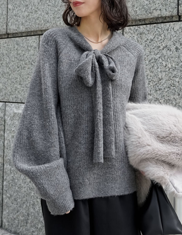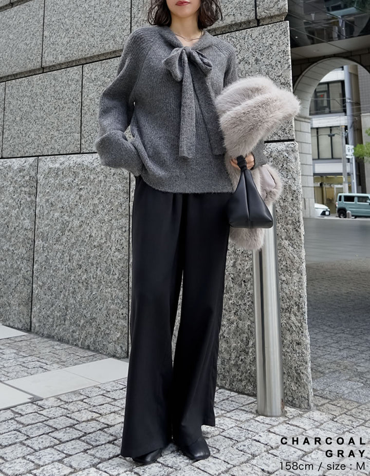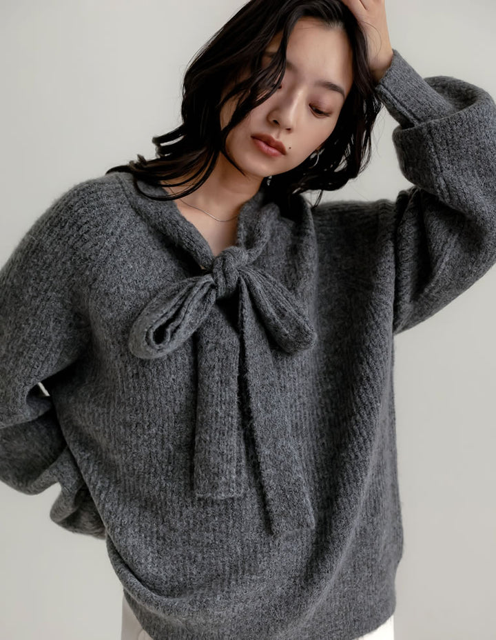 片畔ニットネックリボントップス